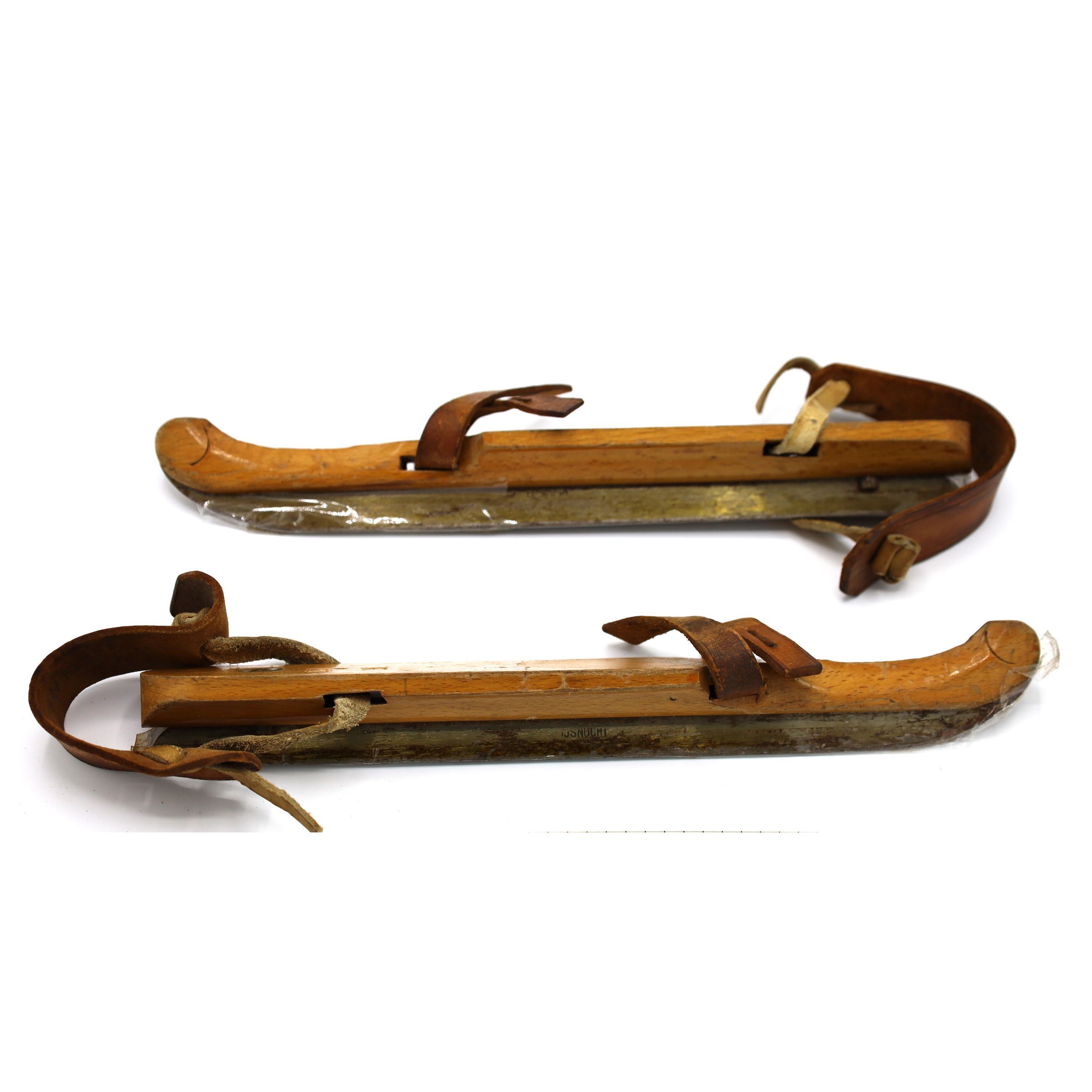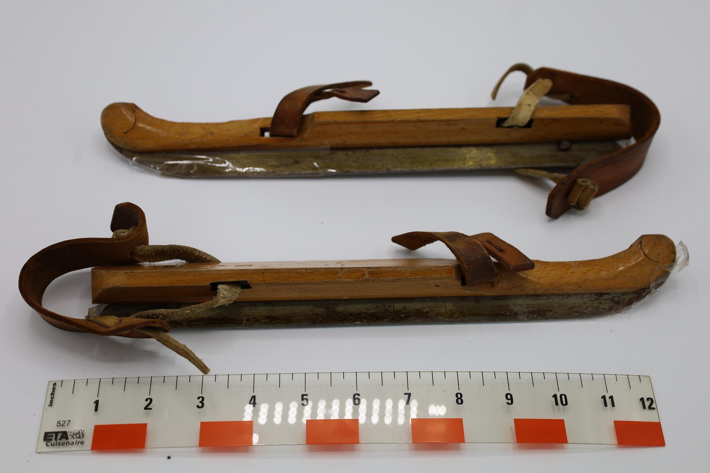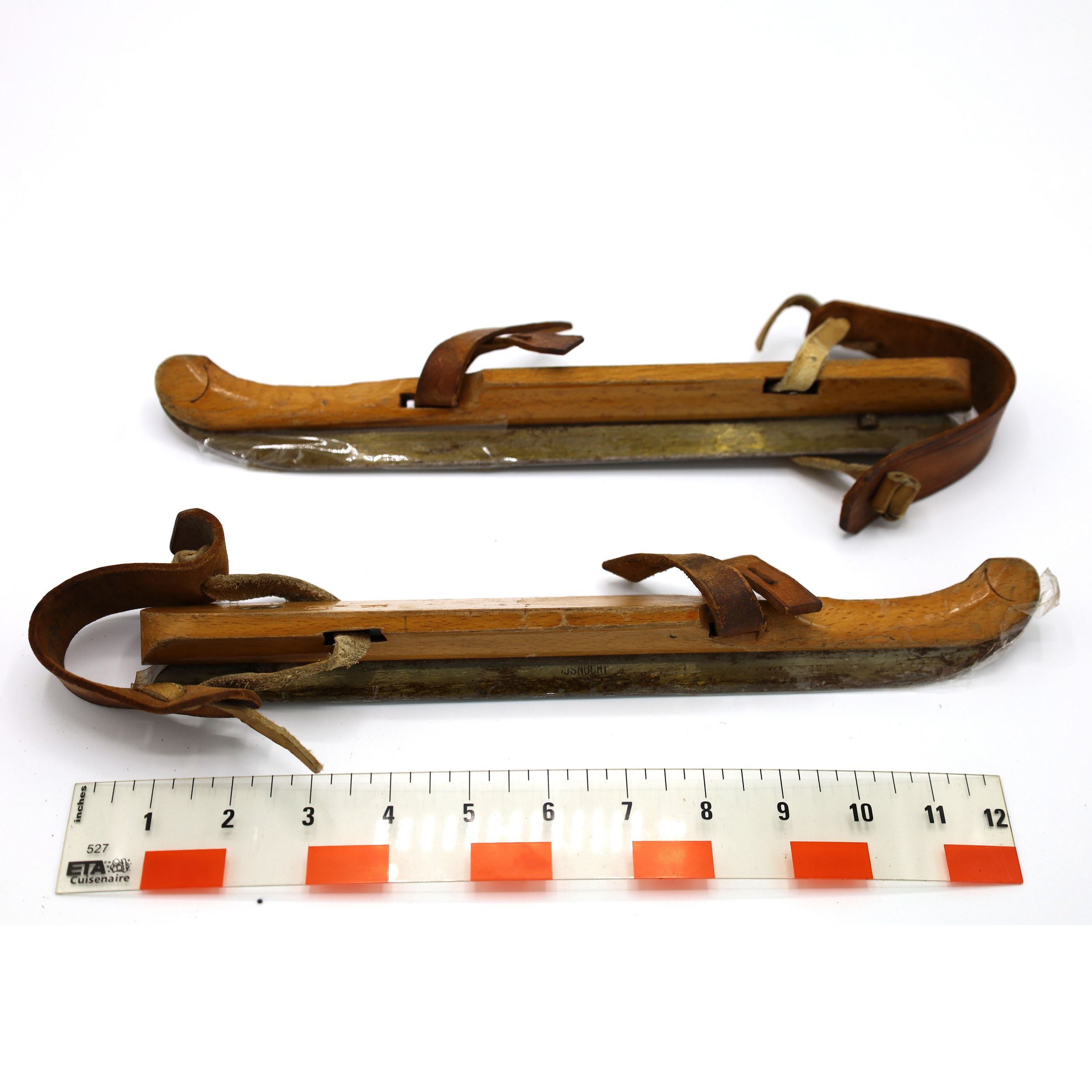 These ice skating blades are complete with leather straps that connect to a skater's boots along with metal blades built into the wooden frame. On the inside of one of the straps is etched the name "Yvonne." The blades appear to have a partially worn-off brand name or the last name etched into them, also.Location