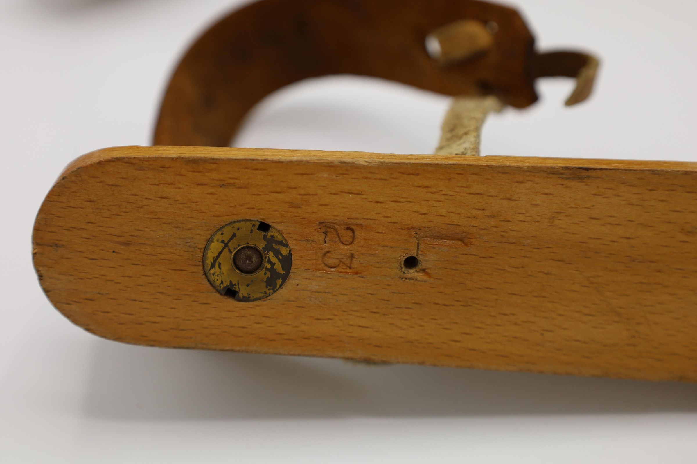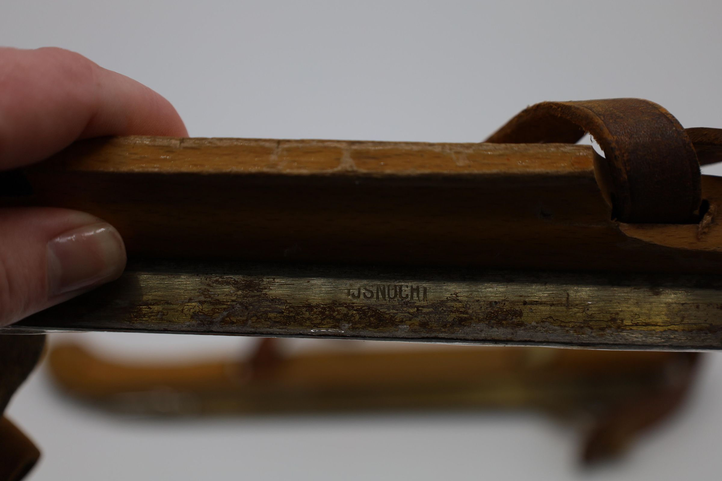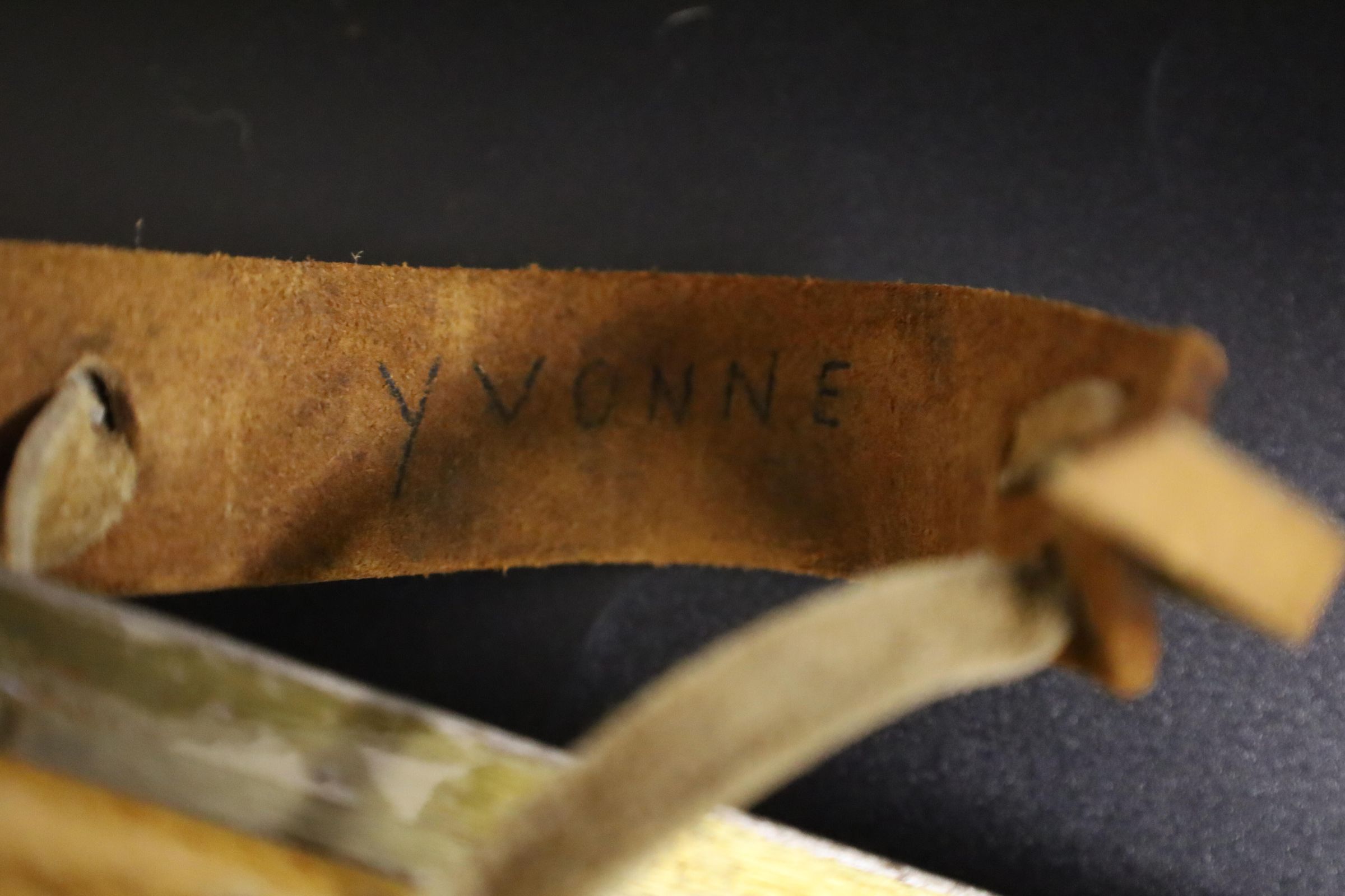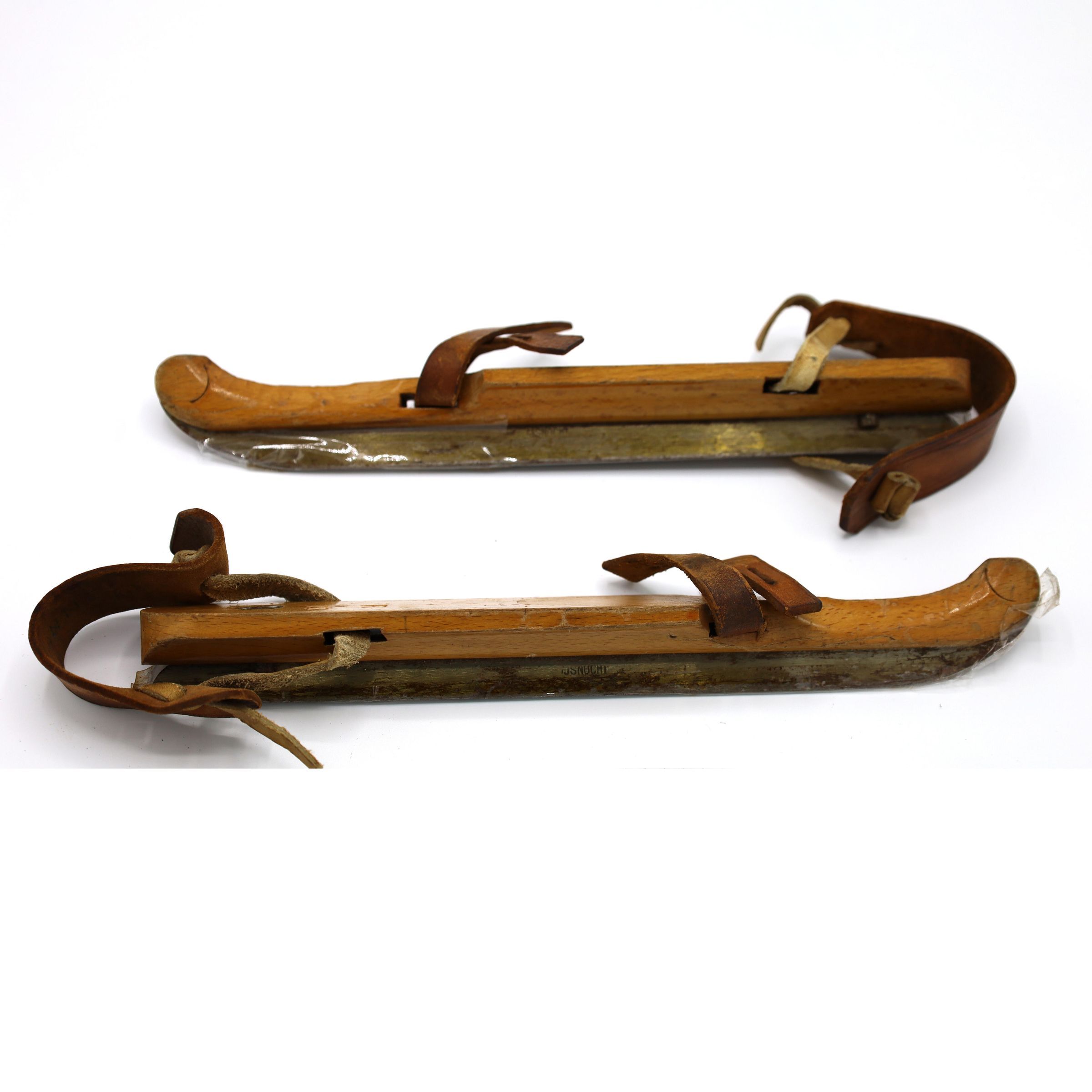 These ice skating blades are complete with leather straps that connect to a skater's boots along with metal blades built into the wooden frame. On the inside of one of the straps is etched the name "Yvonne." The blades appear to have a partially worn-off brand name or the last name etched into them, also.Location
