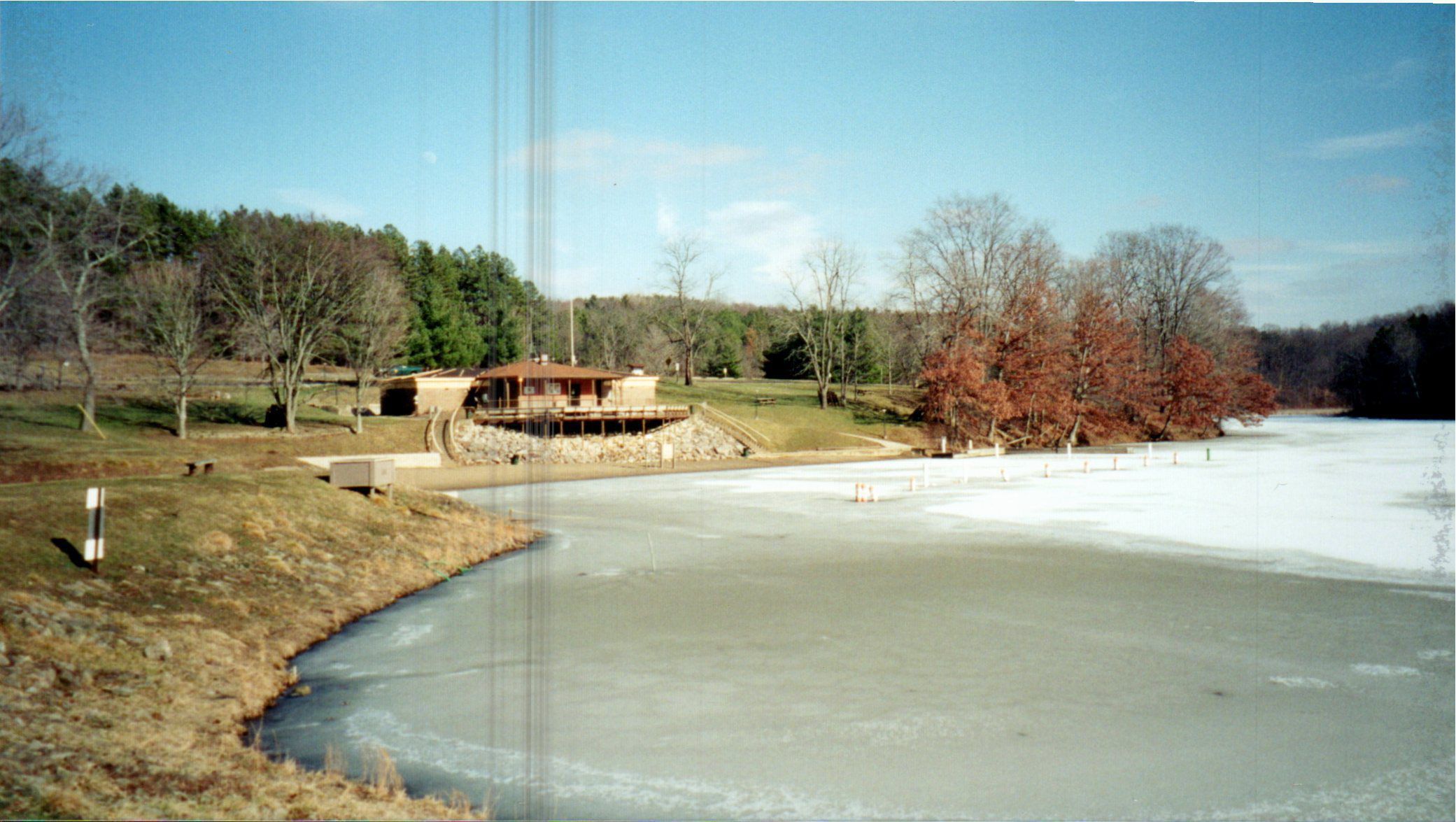 Cutler Lake at Blue Rock State Park is frozen over. On the photograph's right is the park's bathhouse and bathing beach.
