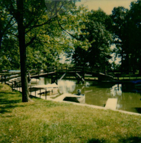 A wooden pedestrian bridge stretches over a channel at Indian Lake State Park. This channel has docks for boats, a few of which are moored here. Sun illuminates the grass and water on what looks to be a gorgeous summer day.Cataloged By
