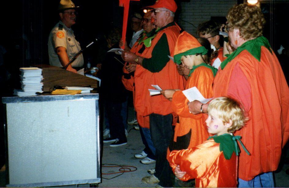 Parkgoers, all dressed in matching jack-o-lantern costumes, line up together in what appears to be a sing-a-long. This program was part of Indian Lake State Park's 1999 Halloween Campout.Cataloged By