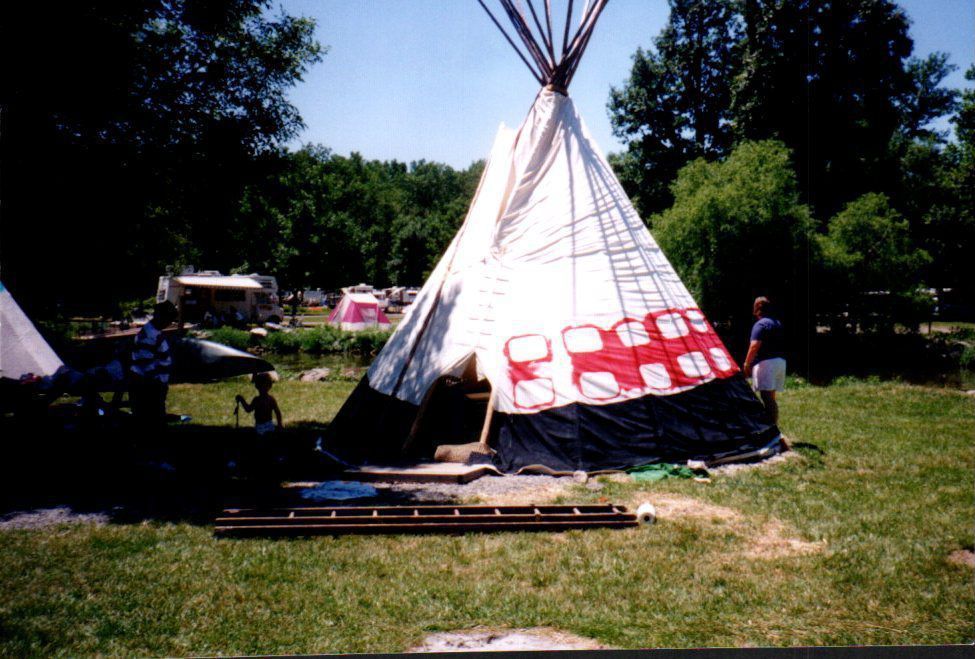 A large white teepee with red detailing and a dark blue base has risen in Indian Lake State Park. Curious parkgoers or, perhaps, campers circle the teepee. Tents and campers in the park's campground fill this photograph's background.Cataloged By