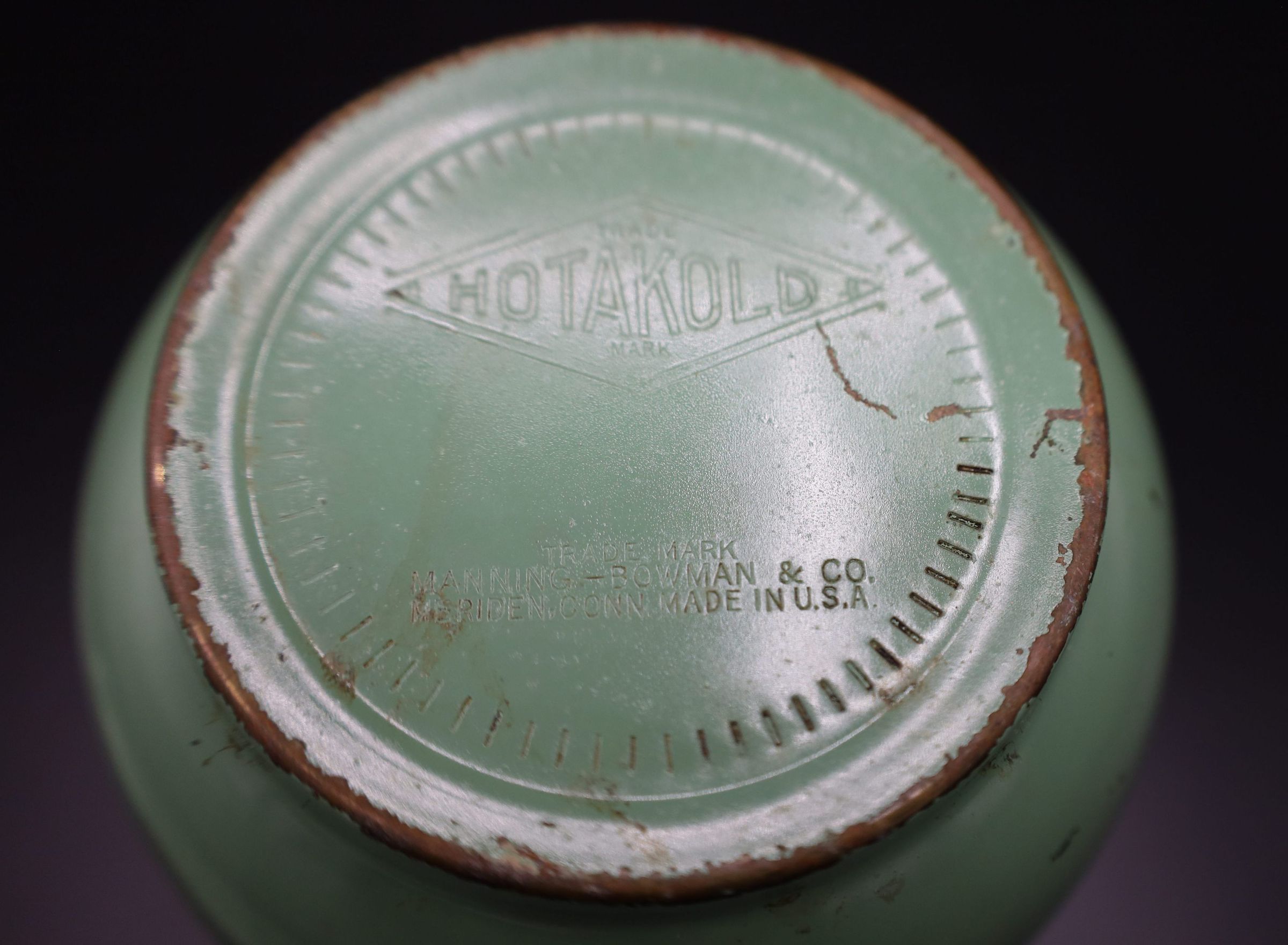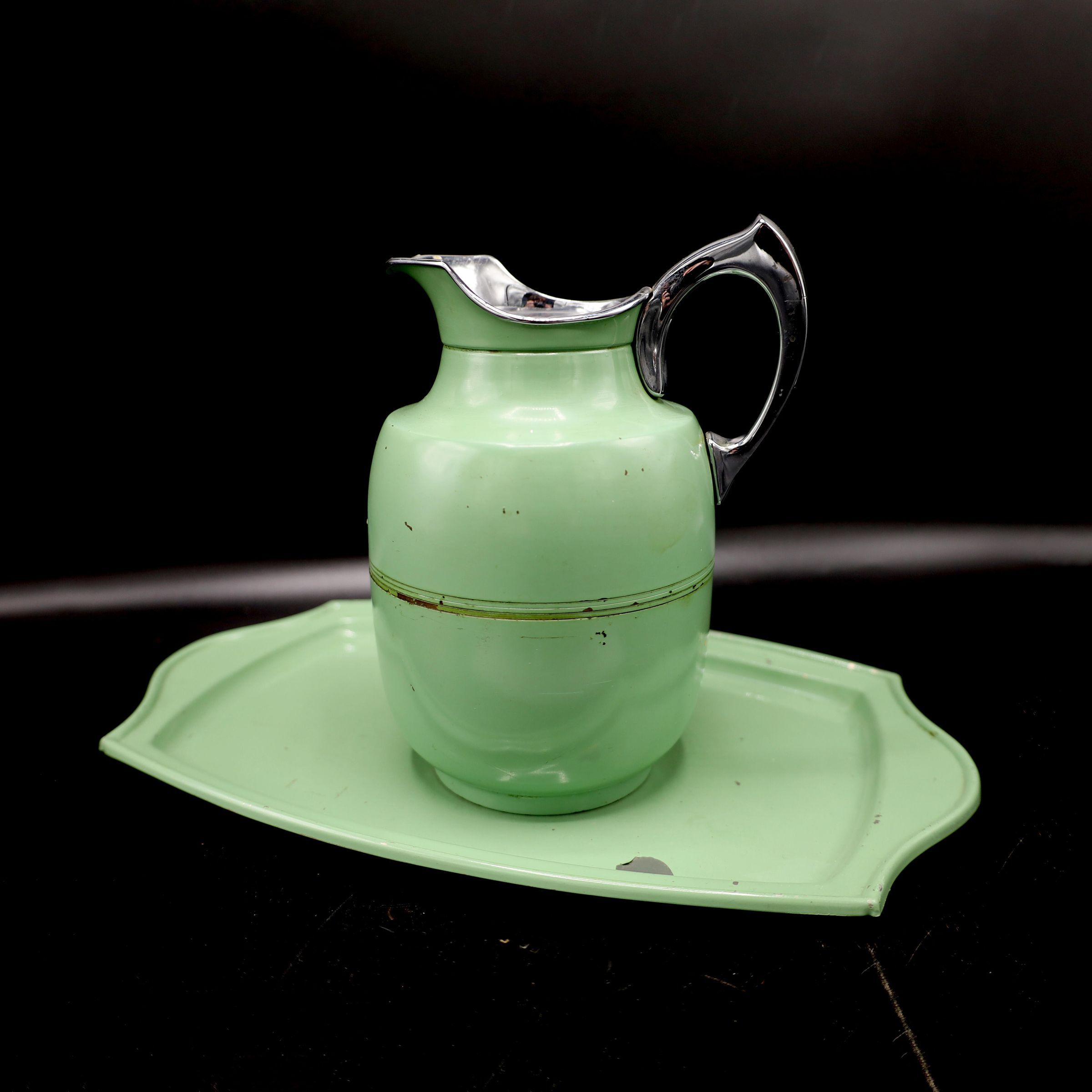 Manning, Bowman & Co. HotAKold insulated carafe with matching platter. Thes are an iconic midcentury modern teal. The pitcher is missing the lid.Location