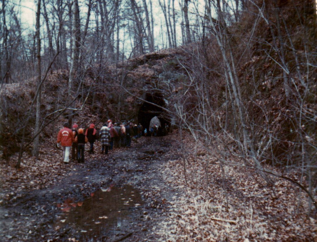 Hikers attending Dillon State Park's Campout Hike trek along a path at nearby Blackhand Gorge State Nature Preserve. This trail leads campers through an interurban rail tunnel that once connected Newark with Zanesville. A railcar regularly ran this route between 1903 and 1929.