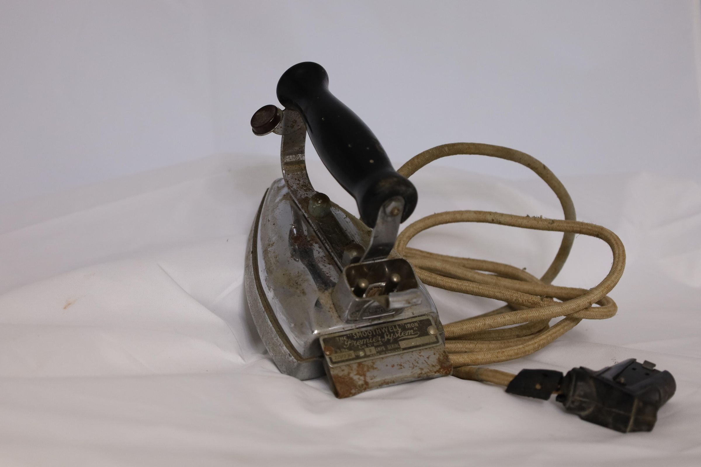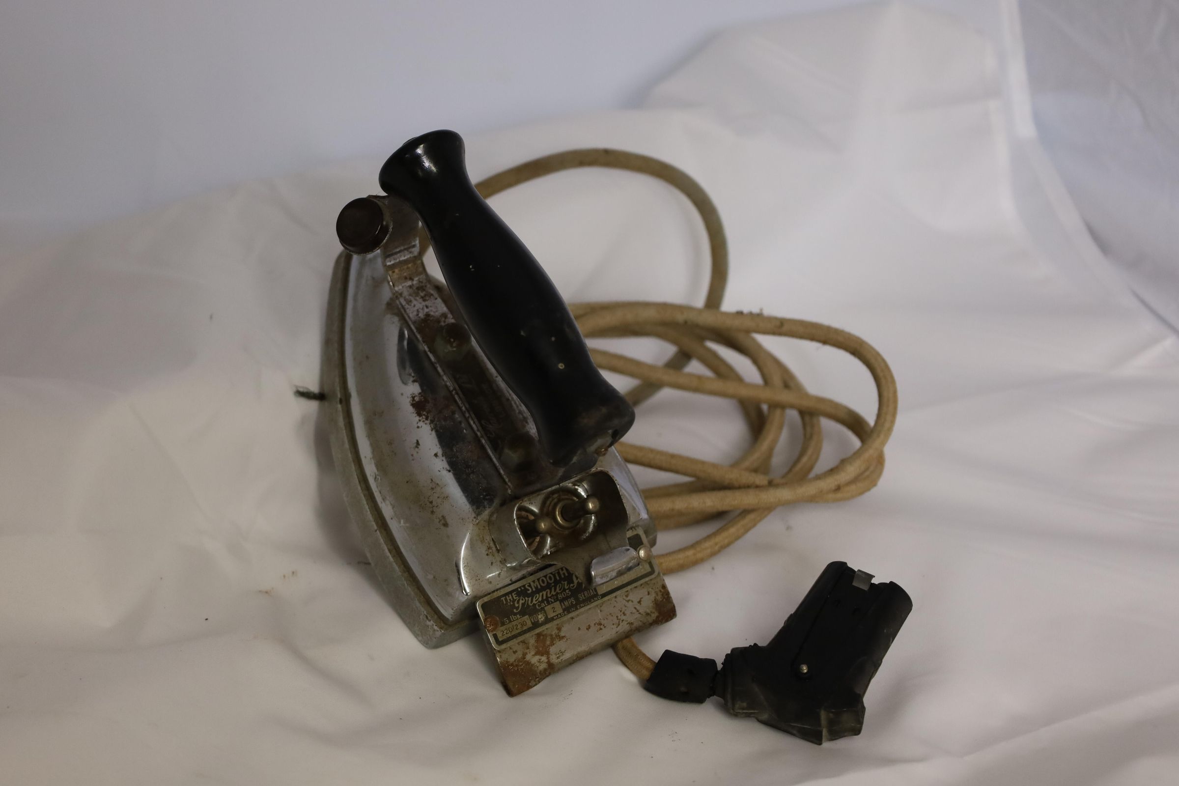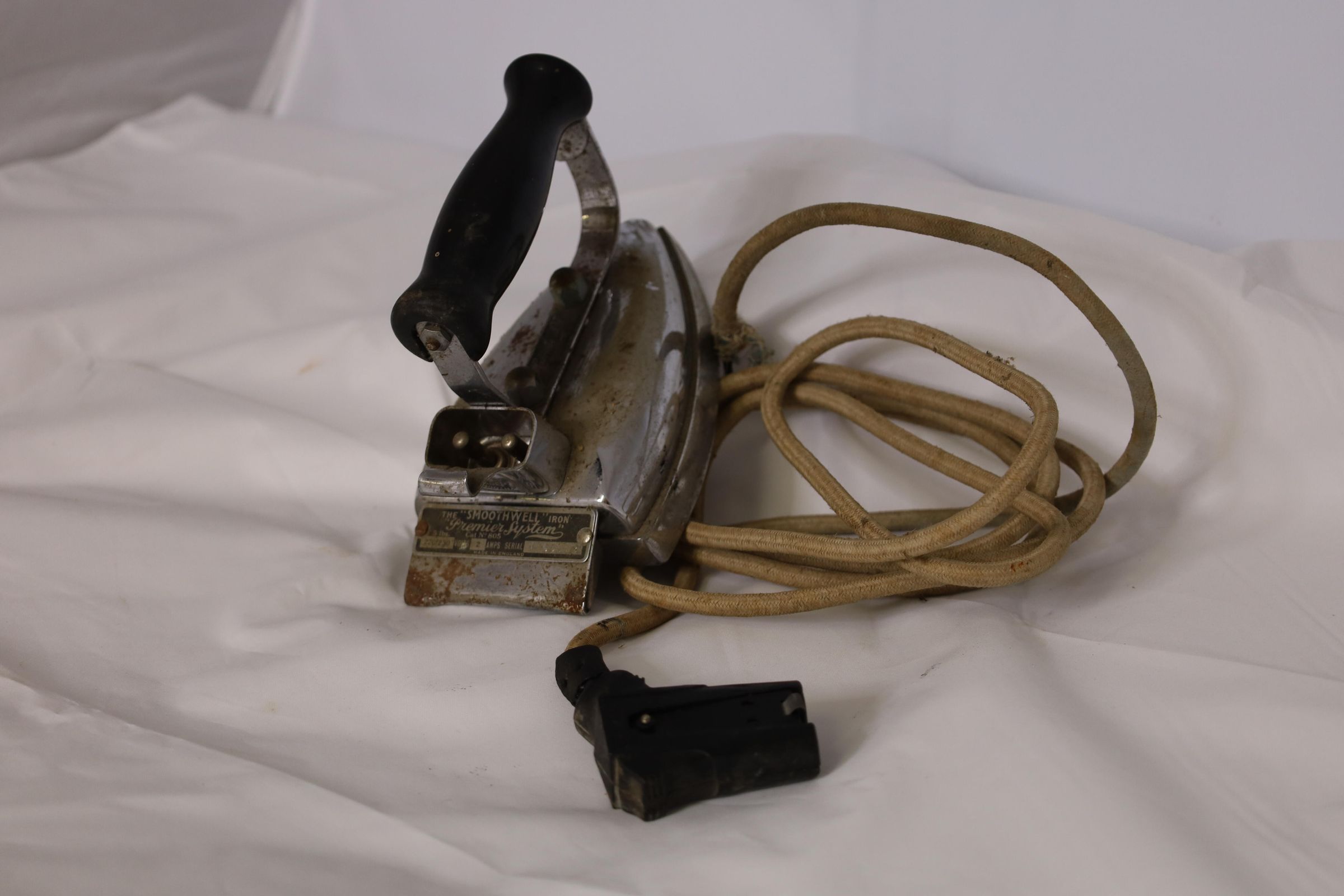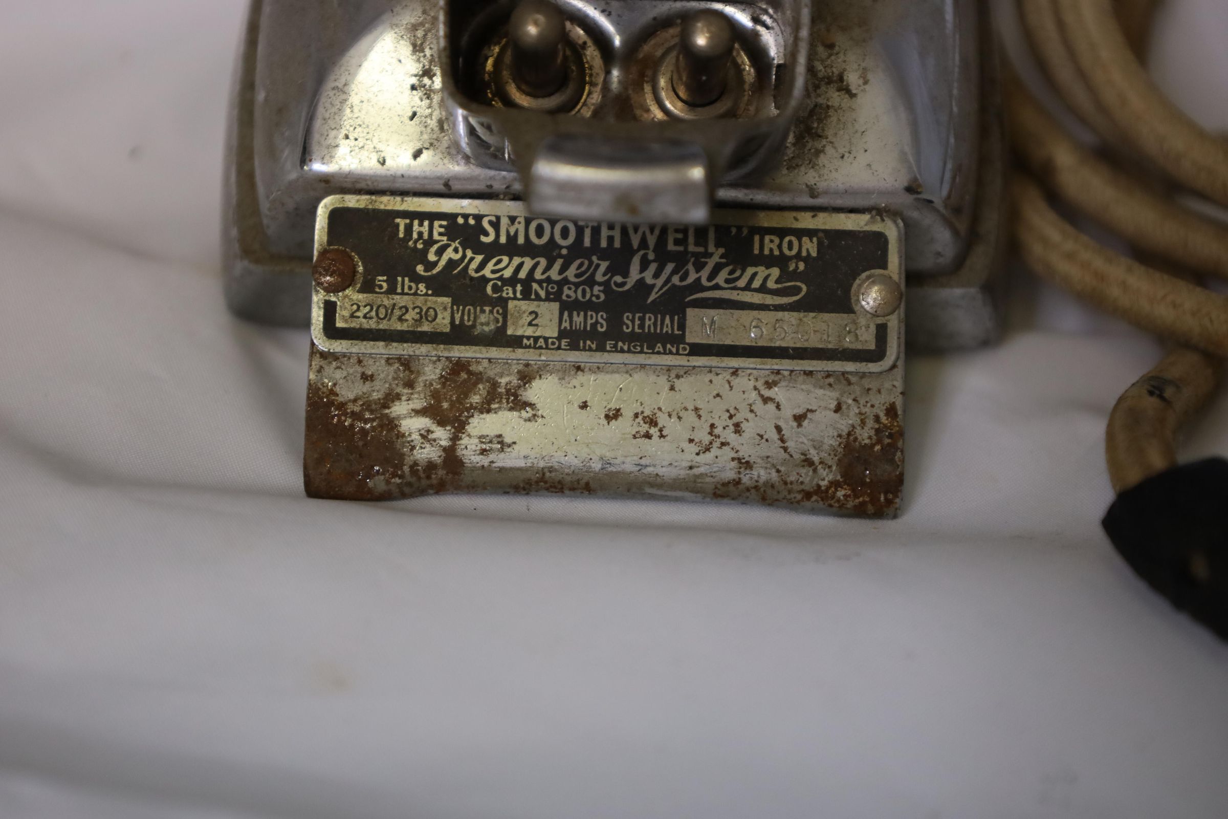 This electric iron is labeled "Smooth Well Iron Premier System 5 lbs." Manufactured in England, it is 220-230 volts 2 amps and has Serial#M65018 and Catalog#805. Circa 1930-1940s, this iron features a painted wood handle and a cloth-covered cord.