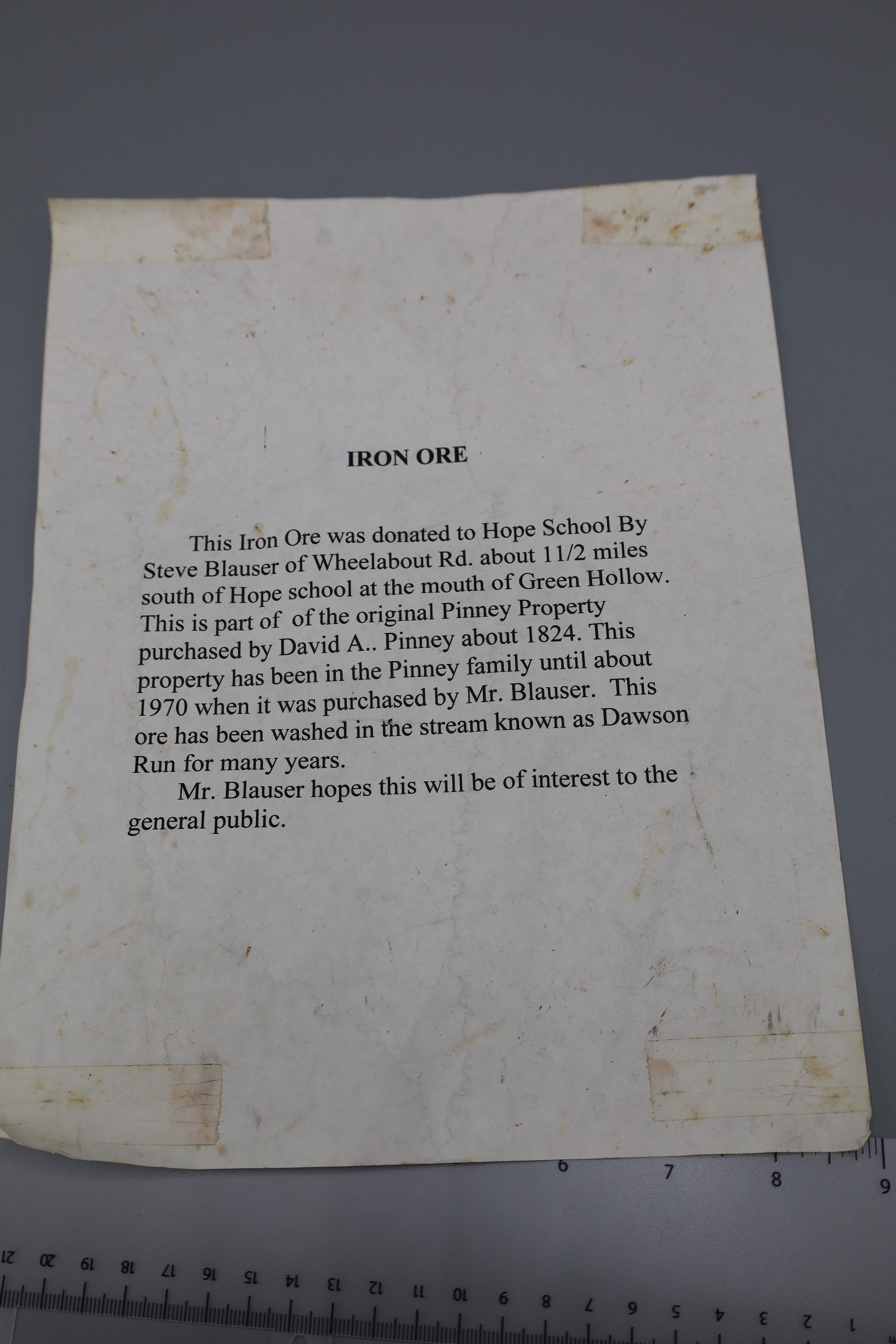 This iron ore was donated to Hope School by Steve Blauser of Wheelabout Road about 1 1/2 miles south of Hope School at the mouth of Green Hollow. This is part of the original Pinney property purchased by David A. Pinney about 1824. This property has been in the Pinney family until about 1970, when it was purchased by Mr. Blauser. This ore has been washed in the stream known as Dawson's Run for many years. Mr. Blauser hopes this will be of interest to the public.Location