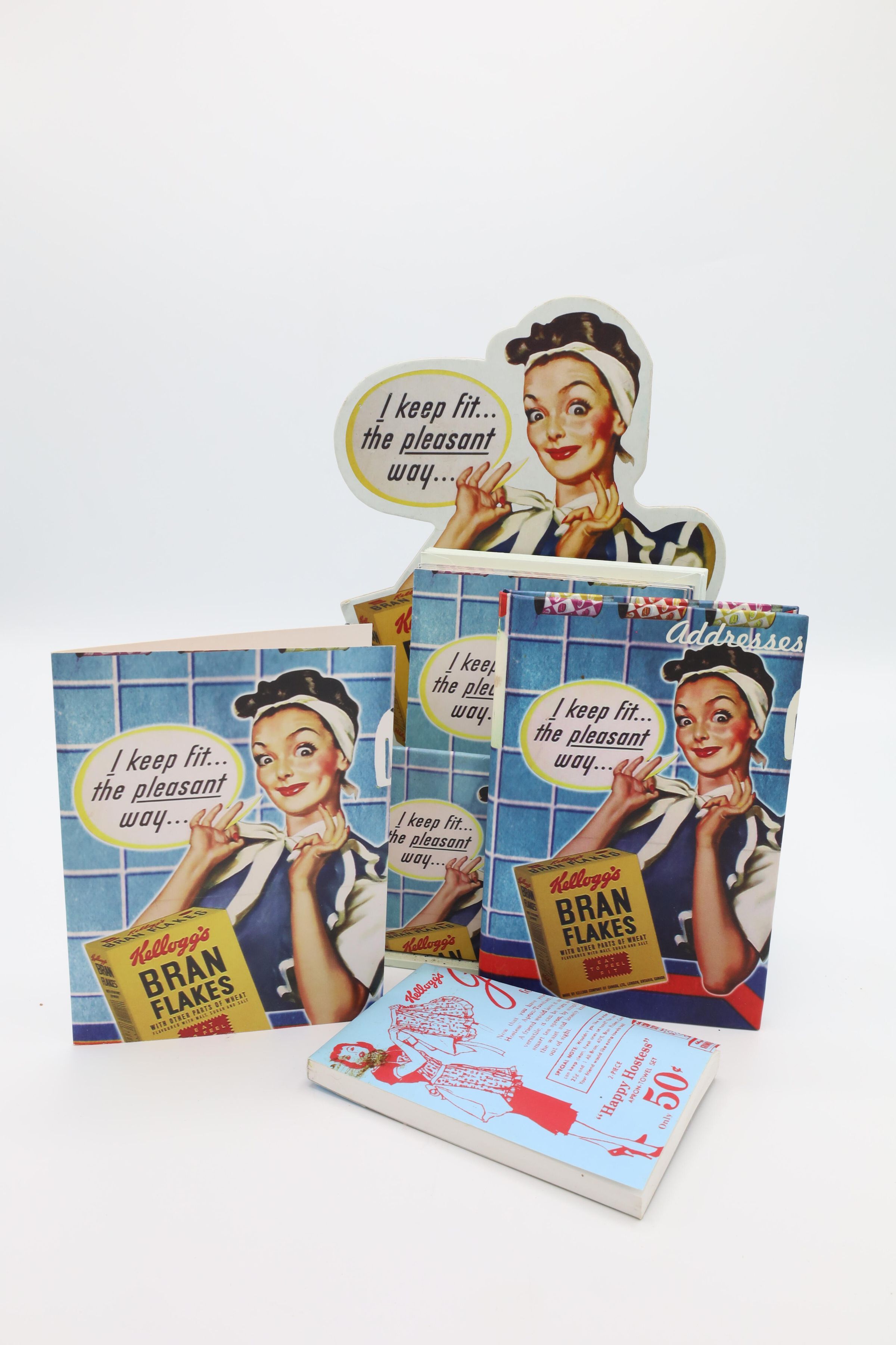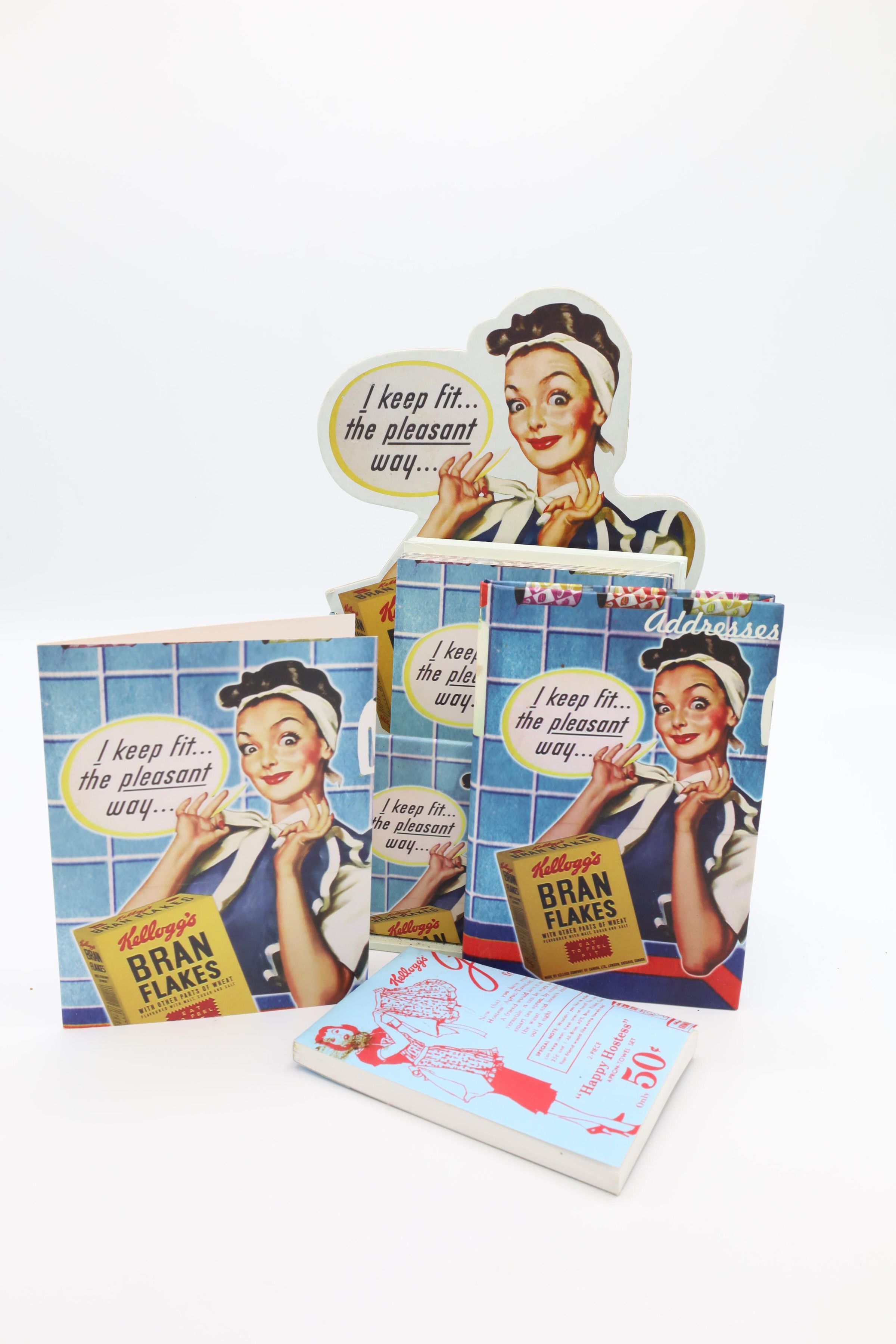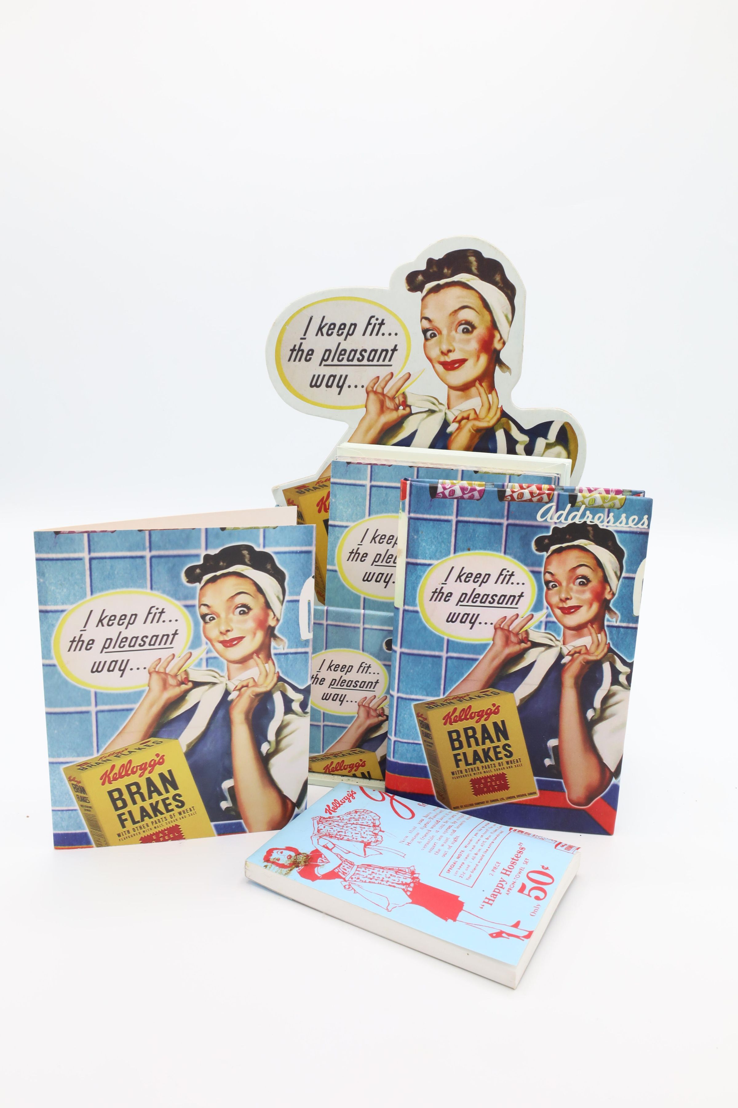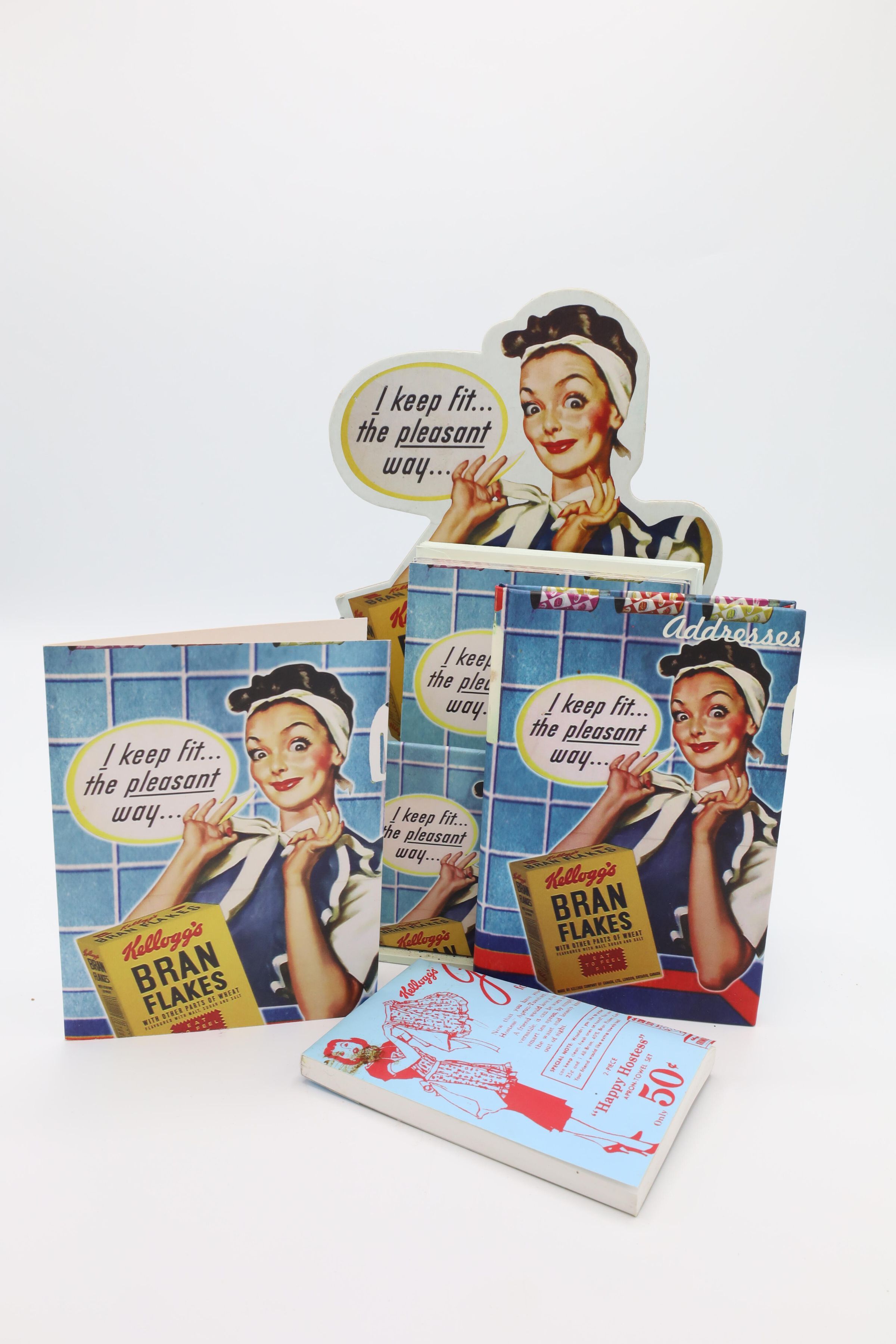 This Kellogg's Bran Flakes caddy set featuring the 1950s Happy Hostess with the Mostess comes with a journal, a notepad, an address book and 10 notecards with envelopes. Kellogg's uses an illustration of a woman smiling while tying a white ribbon at the nape of her neck as the cover picture on the caddy's contents and on the caddy itself. The woman is wearing a blue apron and has a white bandanna on her head. She is pictured in a kitchen with blue tiled walls, her elbow resting on a blue counter with a red stripe and a box of Kellogg's Bran Flakes in front of her. Her speech bubble reads, "I keep fit...the peasant way..."