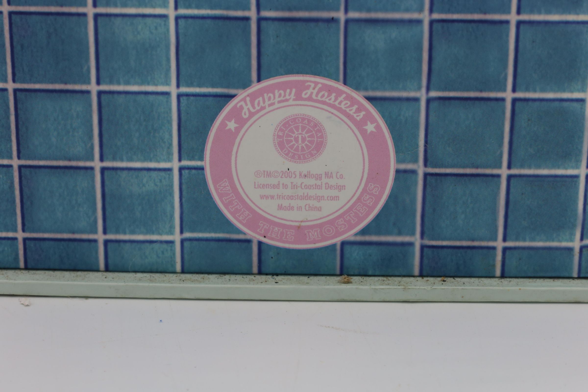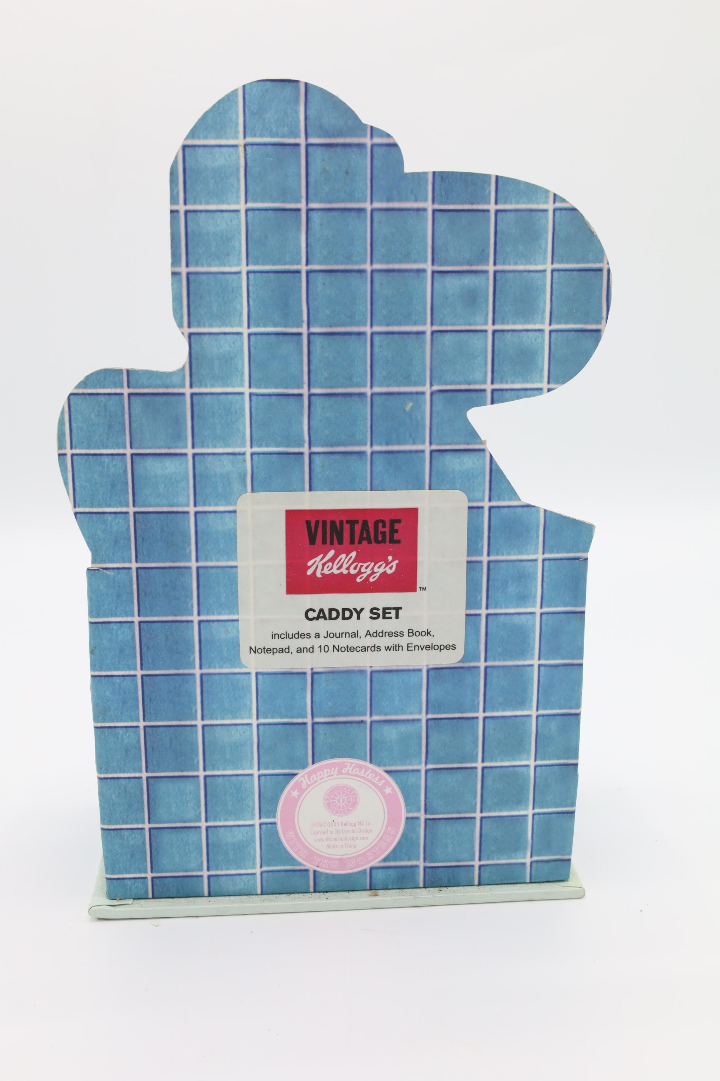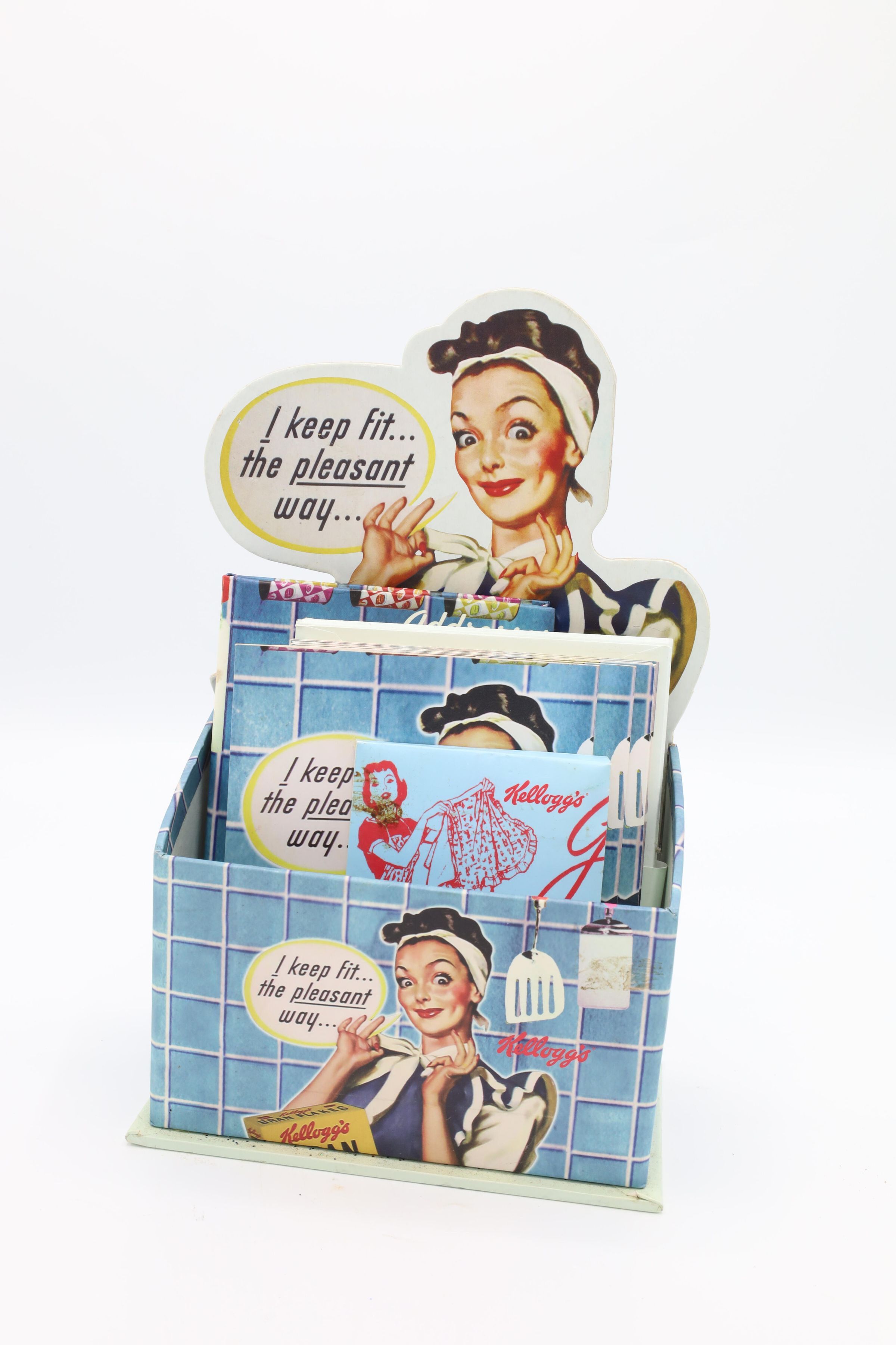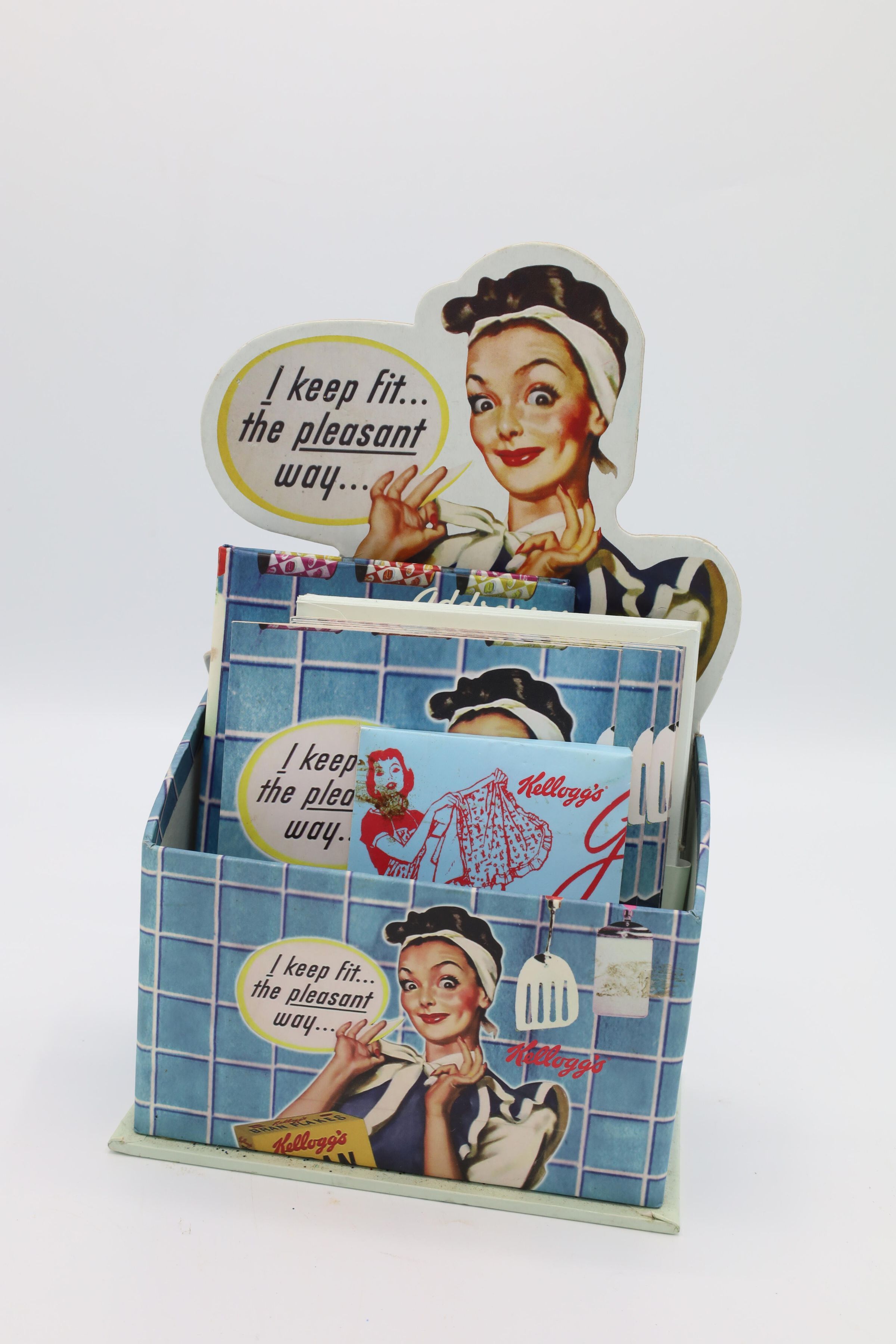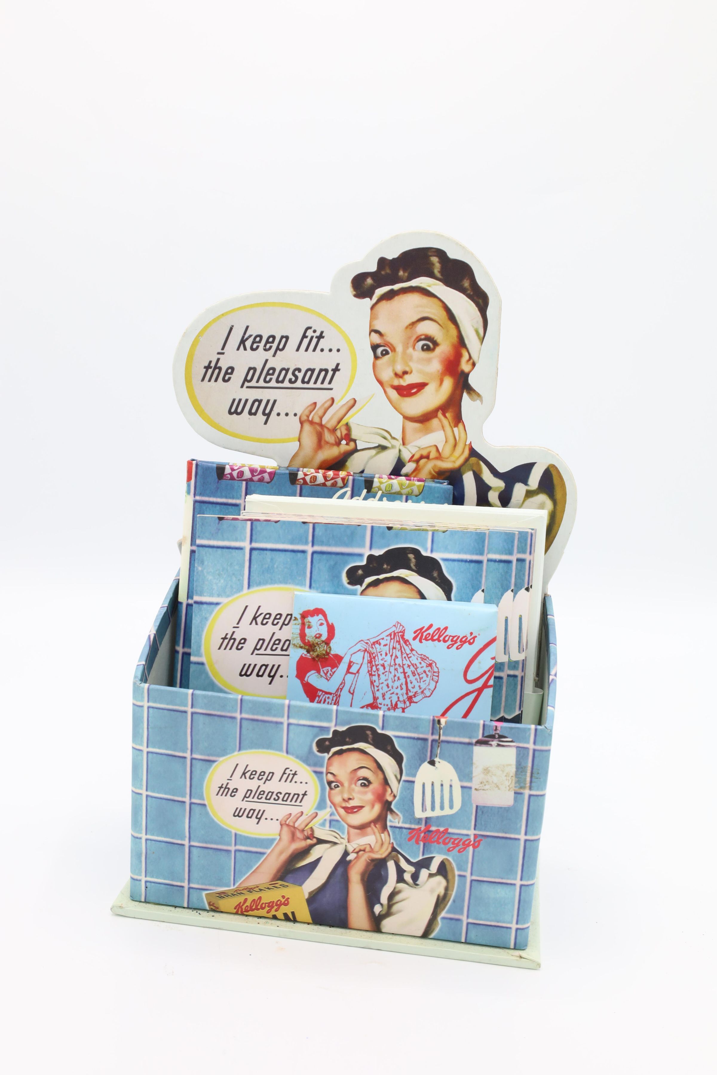 This Kellogg's Bran Flakes caddy set featuring the 1950s Happy Hostess with the Mostess comes with a journal, a notepad, an address book and 10 notecards with envelopes. Kellogg's uses an illustration of a woman smiling while tying a white ribbon at the nape of her neck as the cover picture on the caddy's contents and on the caddy itself. The woman is wearing a blue apron and has a white bandanna on her head. She is pictured in a kitchen with blue tiled walls, her elbow resting on a blue counter with a red stripe and a box of Kellogg's Bran Flakes in front of her. Her speech bubble reads, "I keep fit...the peasant way..."