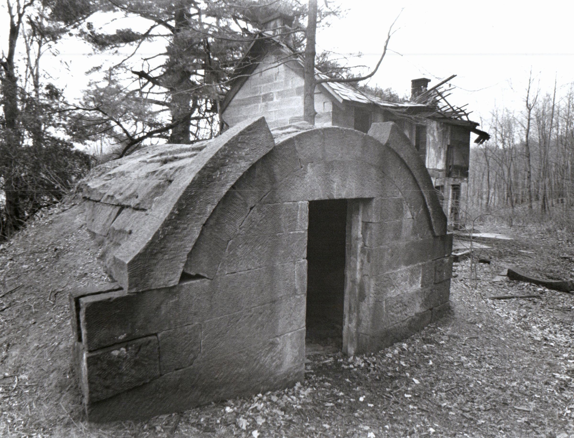 The Root Cellar and Kennedy Stone House in 1995 prior to their restoration. Note the home's roof has caved in.