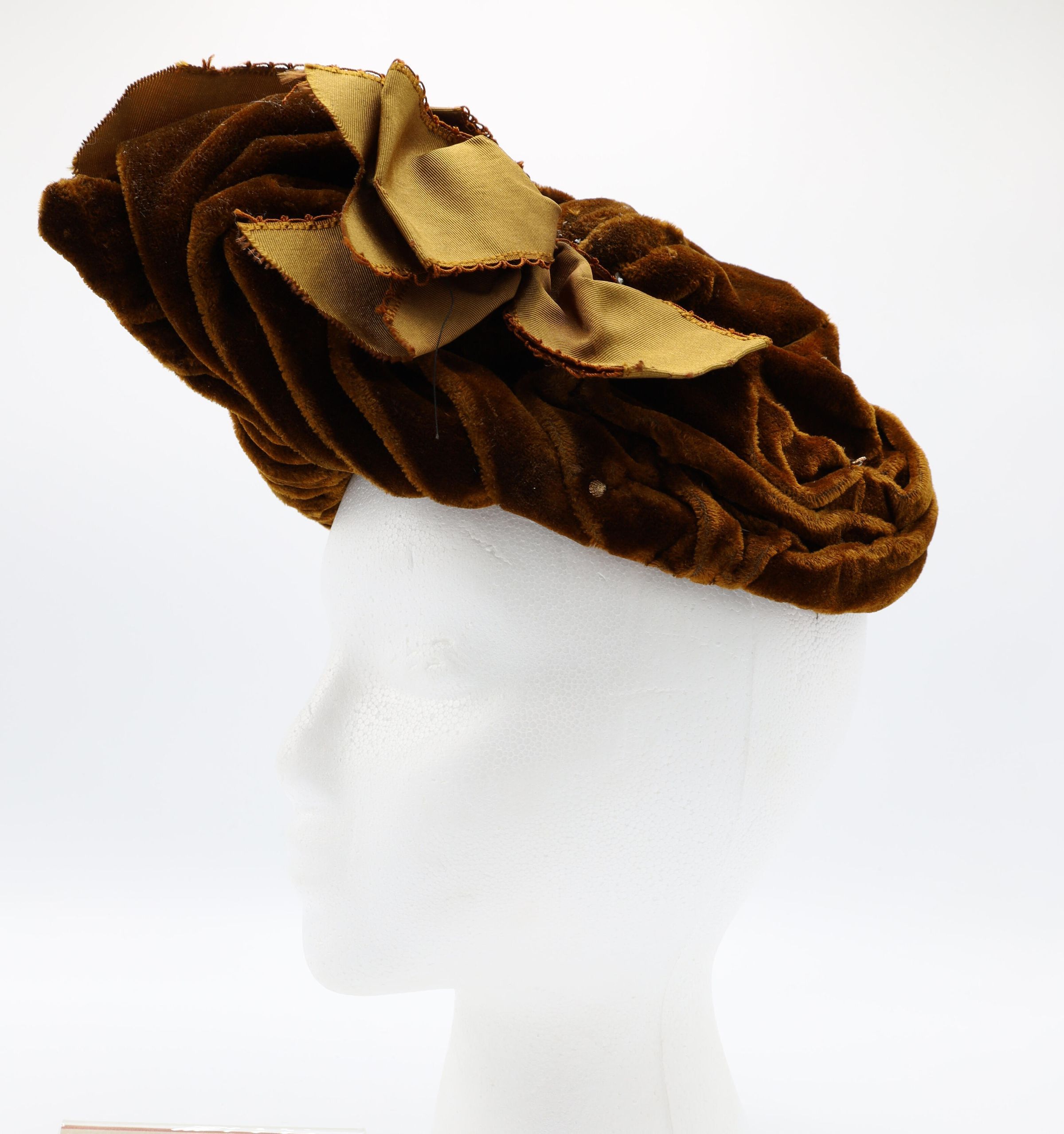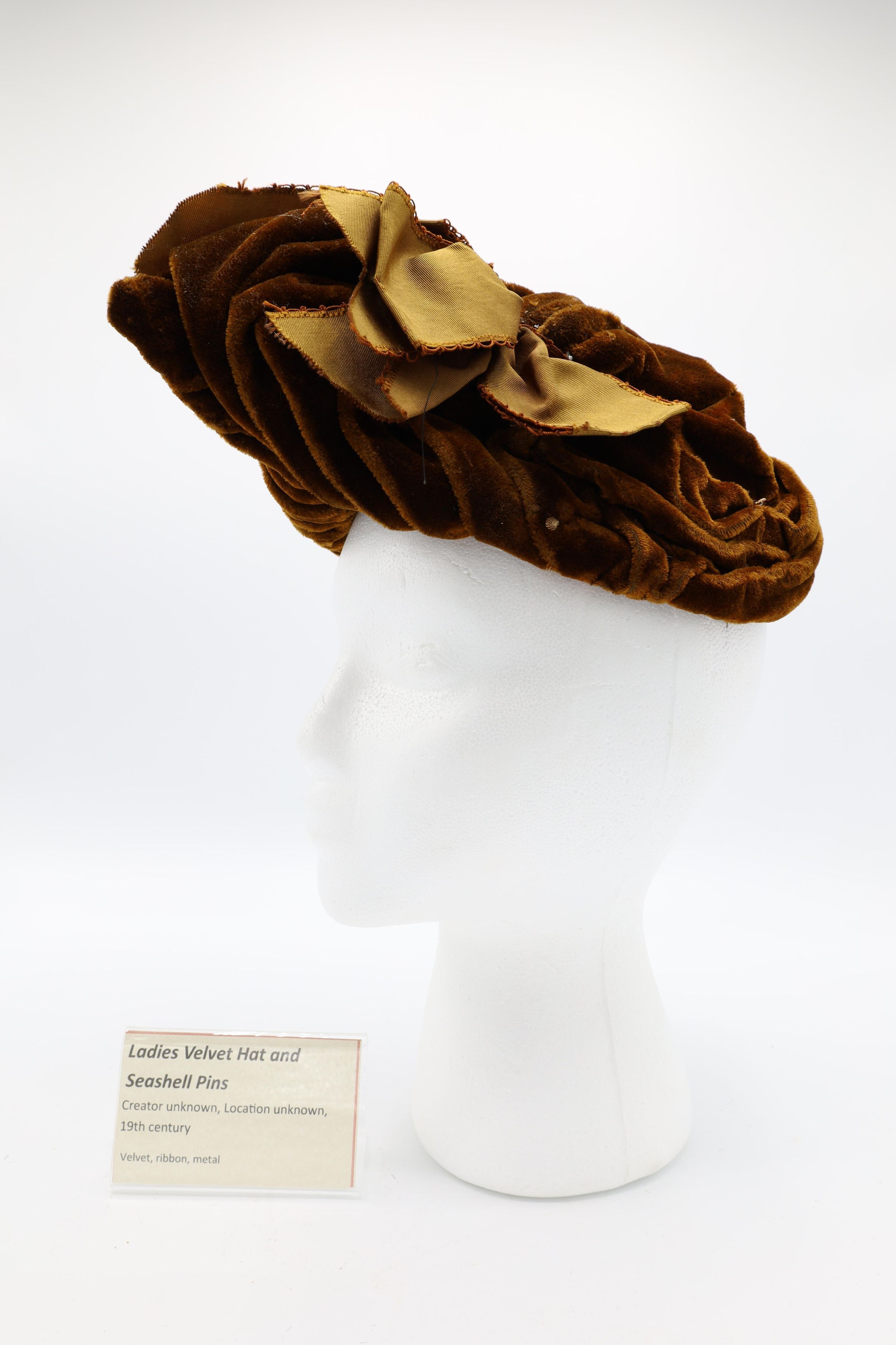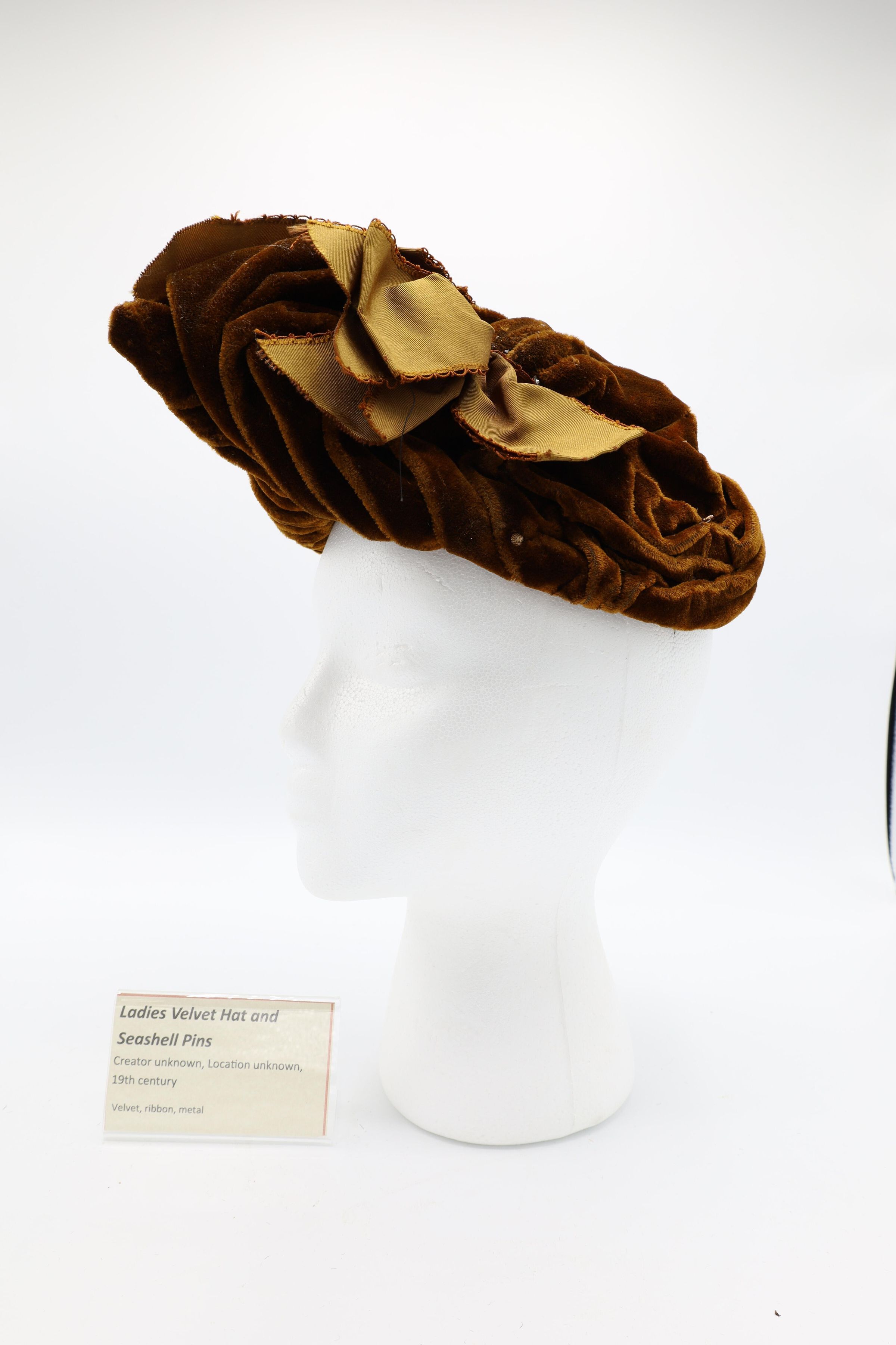 This is a 19th-century simple lady's brown velvet hat with ribbon carefully placed on top. Held in place with seashell pins, this hat may have been fashioned on a wire frame and made by a home milliner.Use
