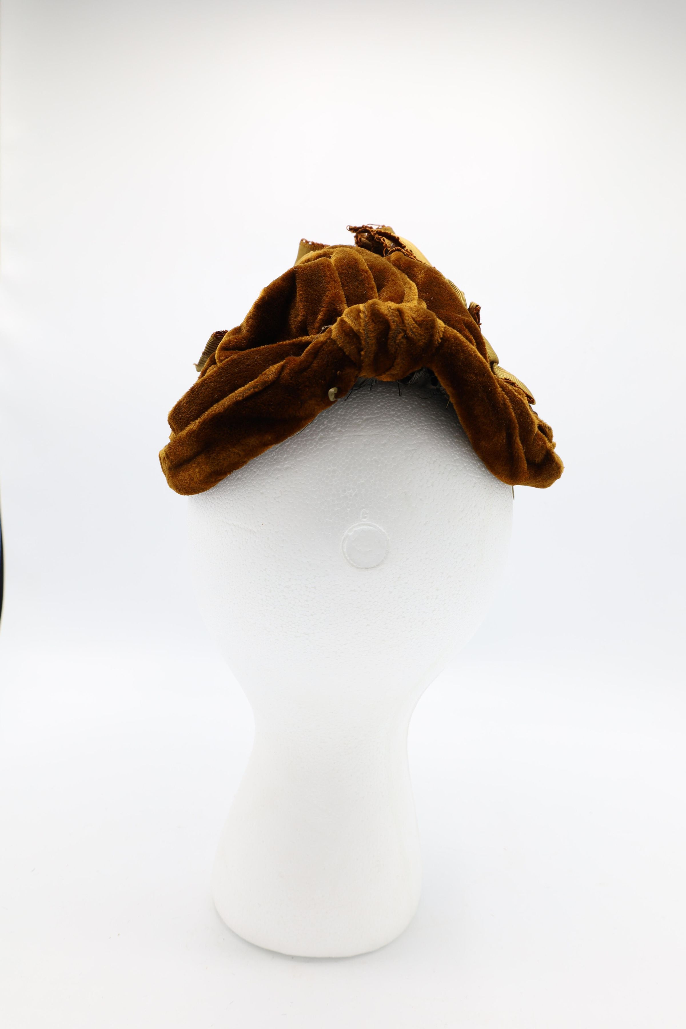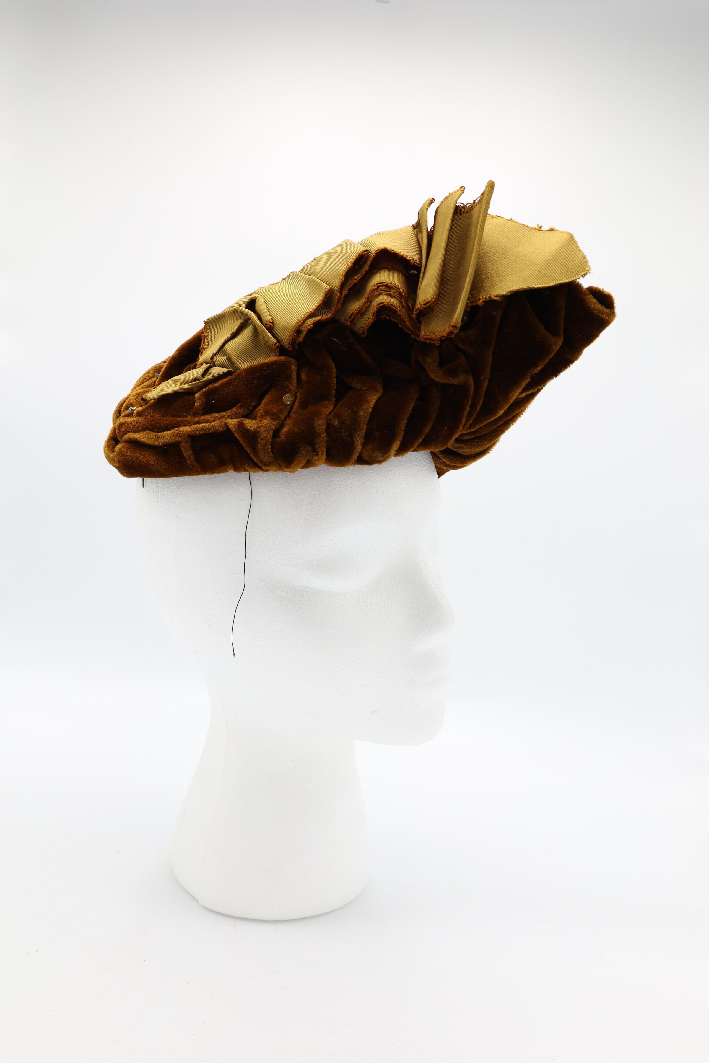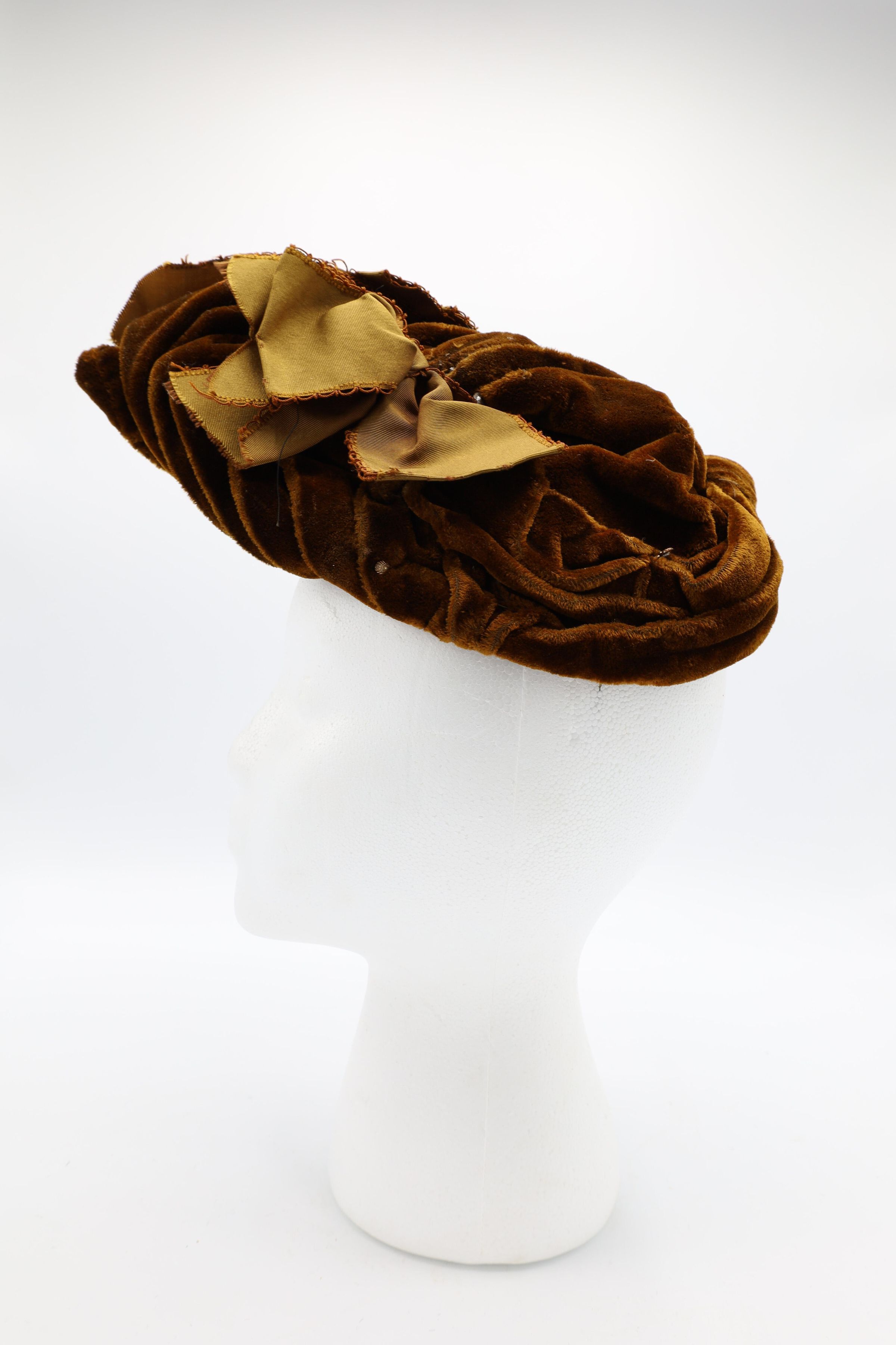This is a 19th-century simple lady's brown velvet hat with ribbon carefully placed on top. Held in place with seashell pins, this hat may have been fashioned on a wire frame and made by a home milliner.Use