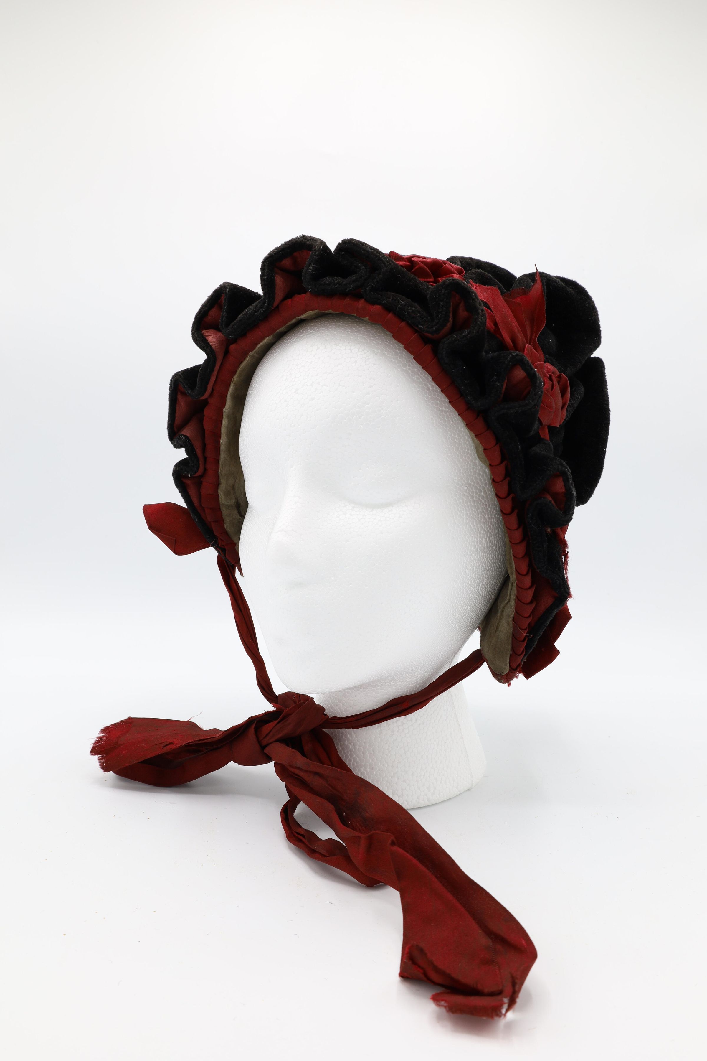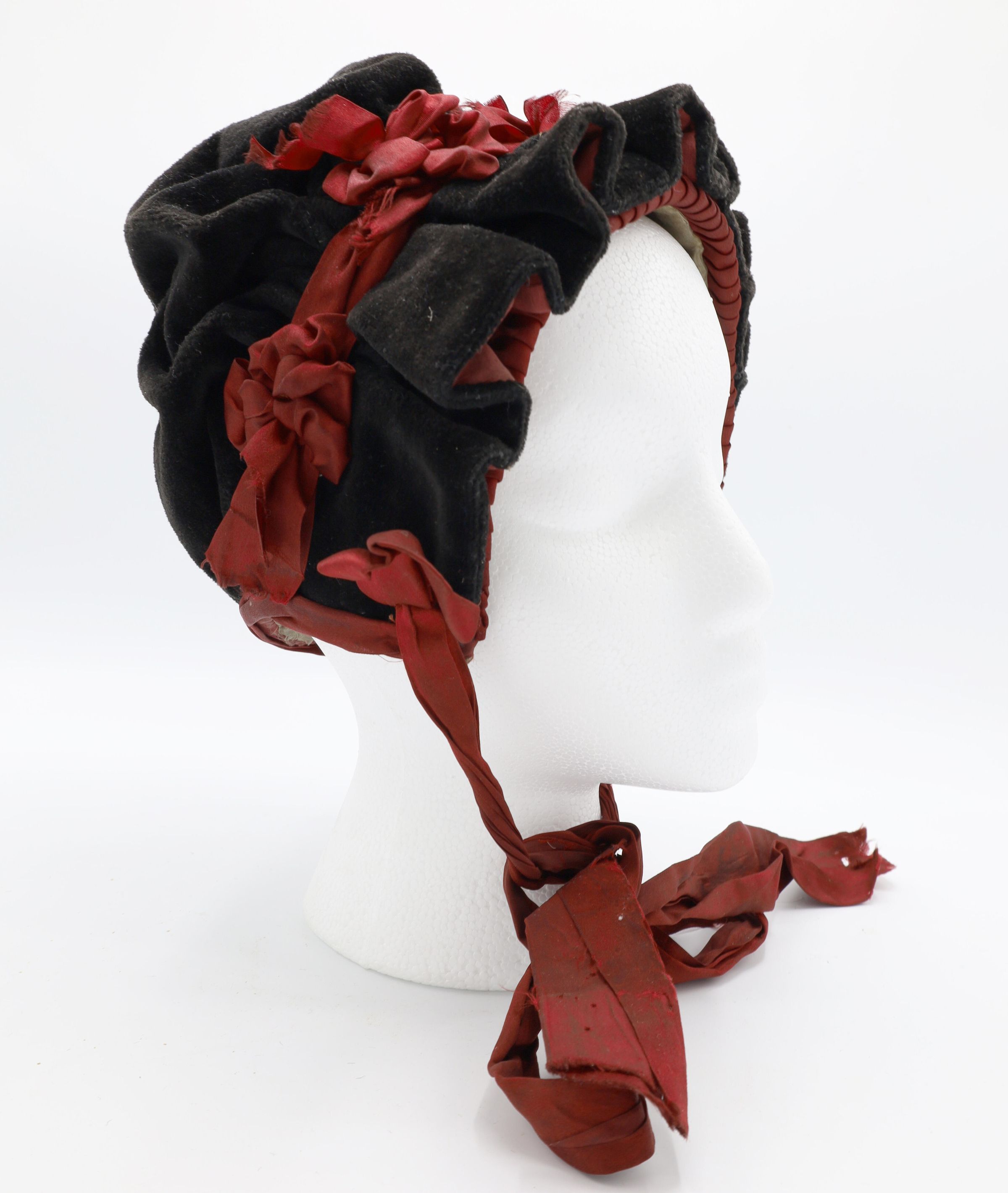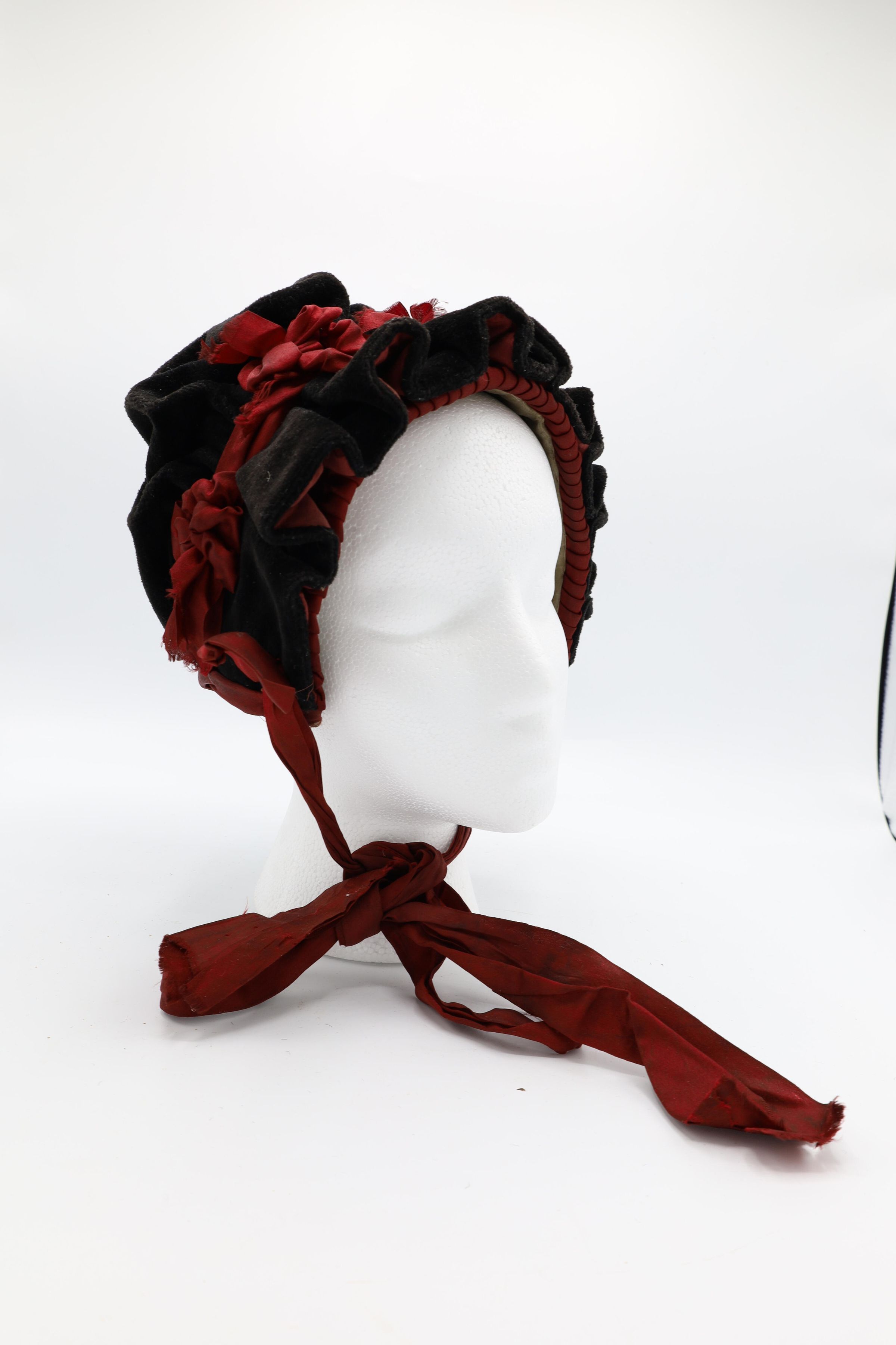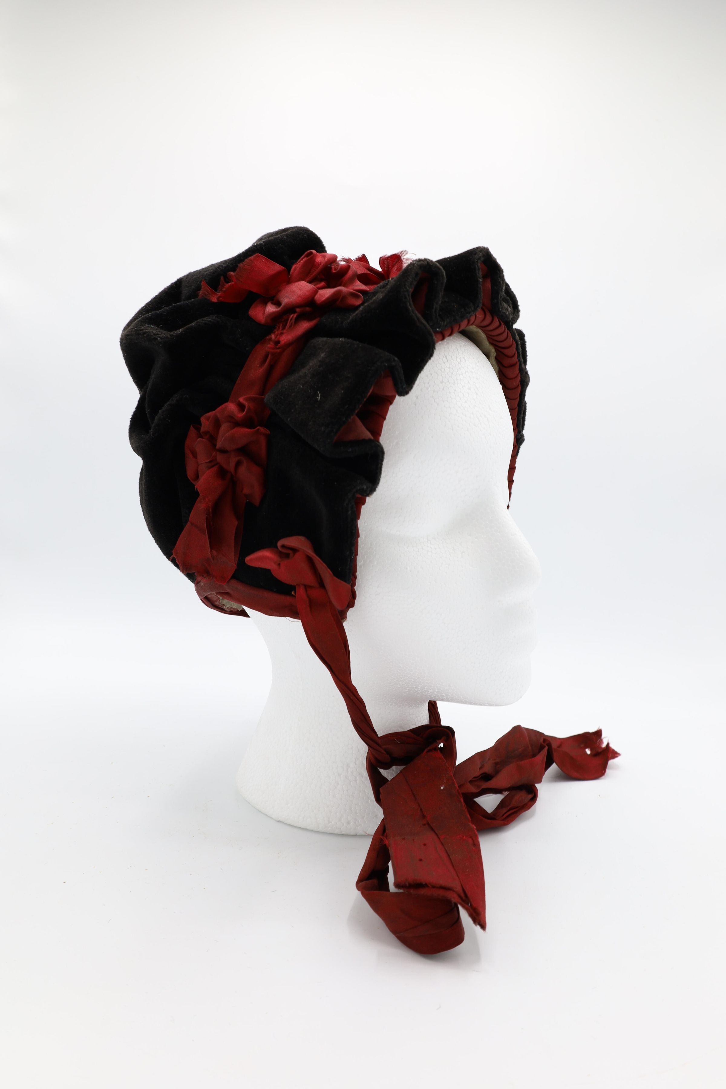 This is a mid-19th-century lady's black velvet bonnet with burgundy trim and ribbon. This bonnet has a simple and elegant design bound to complement its wearer.Use
