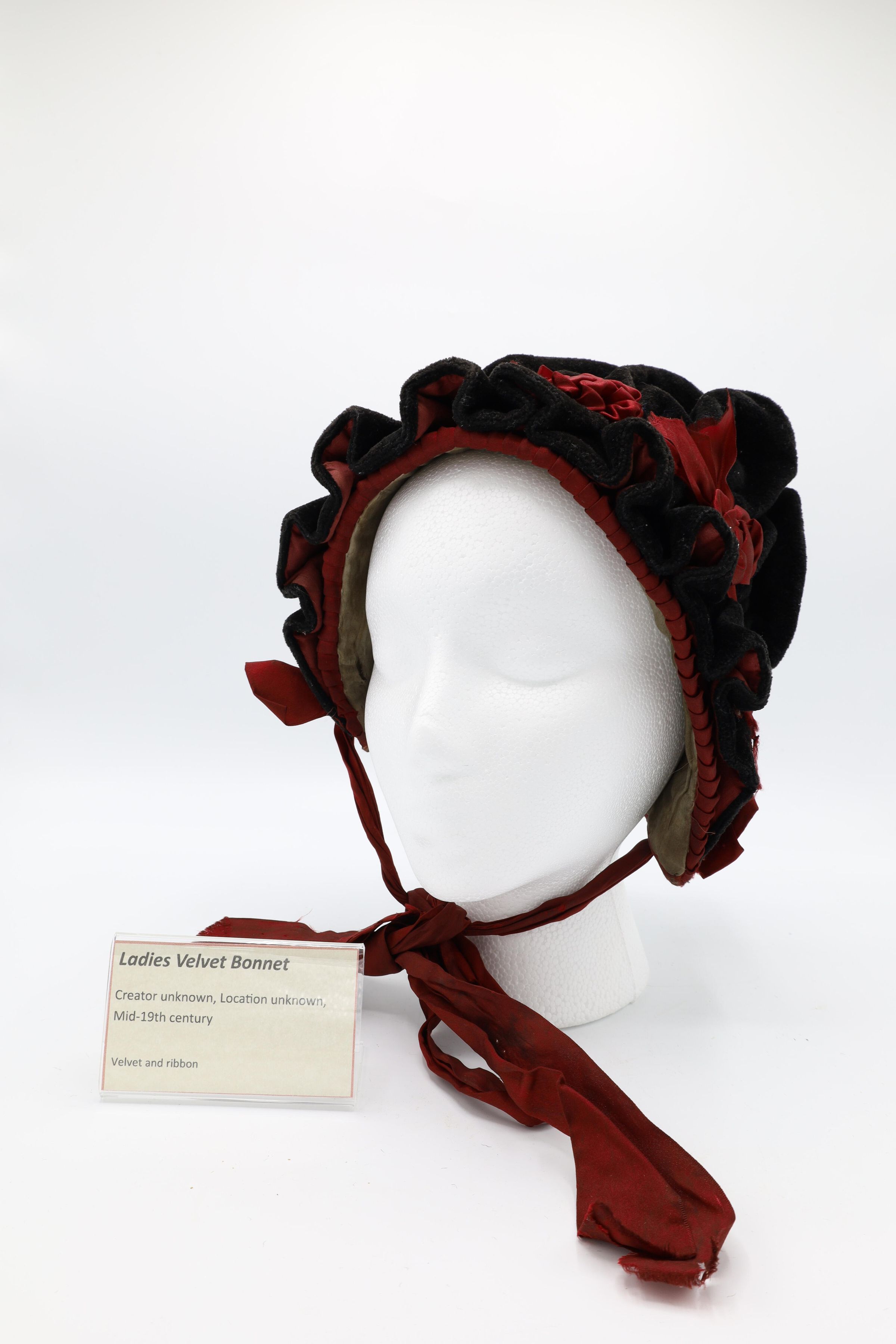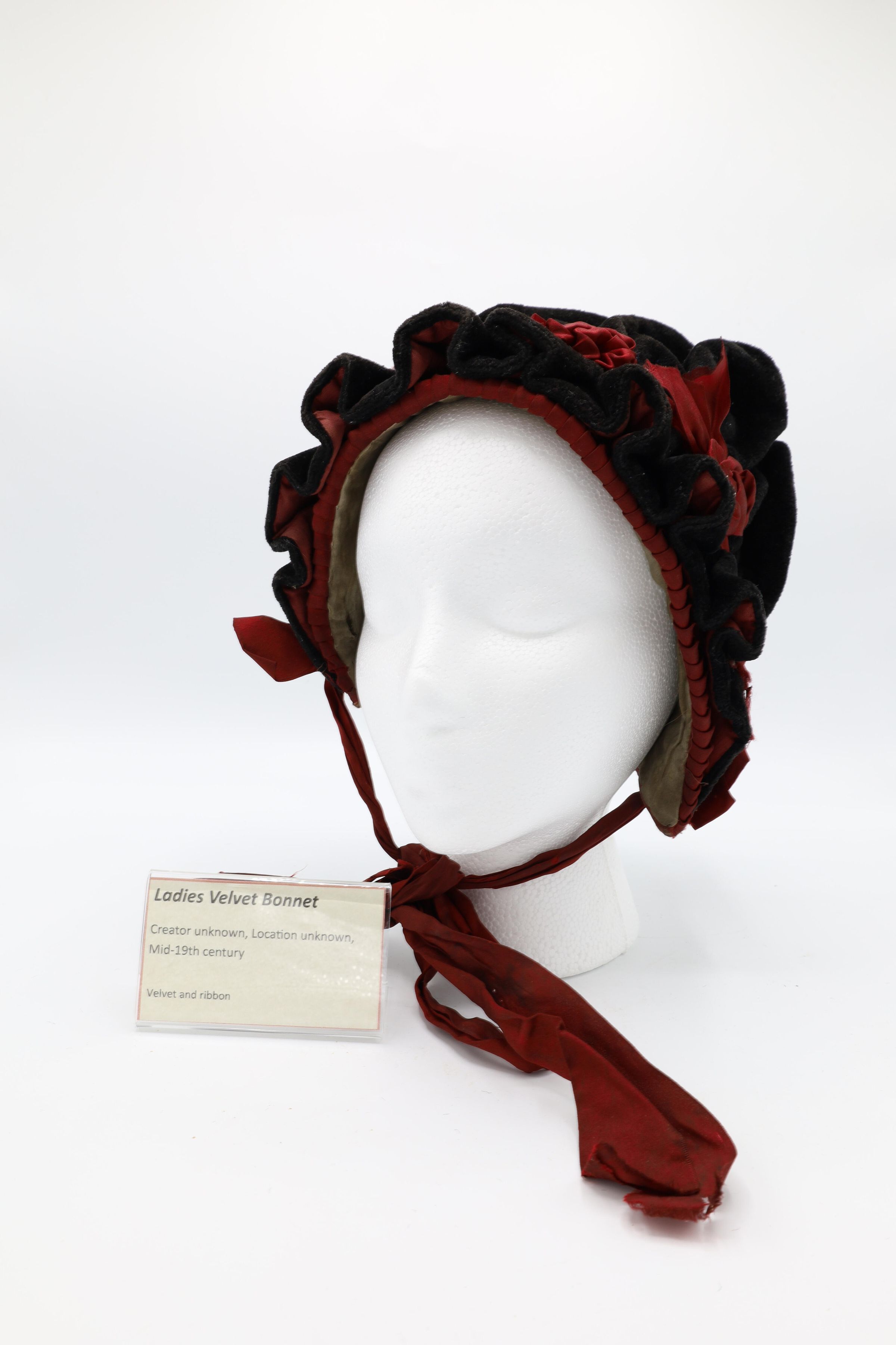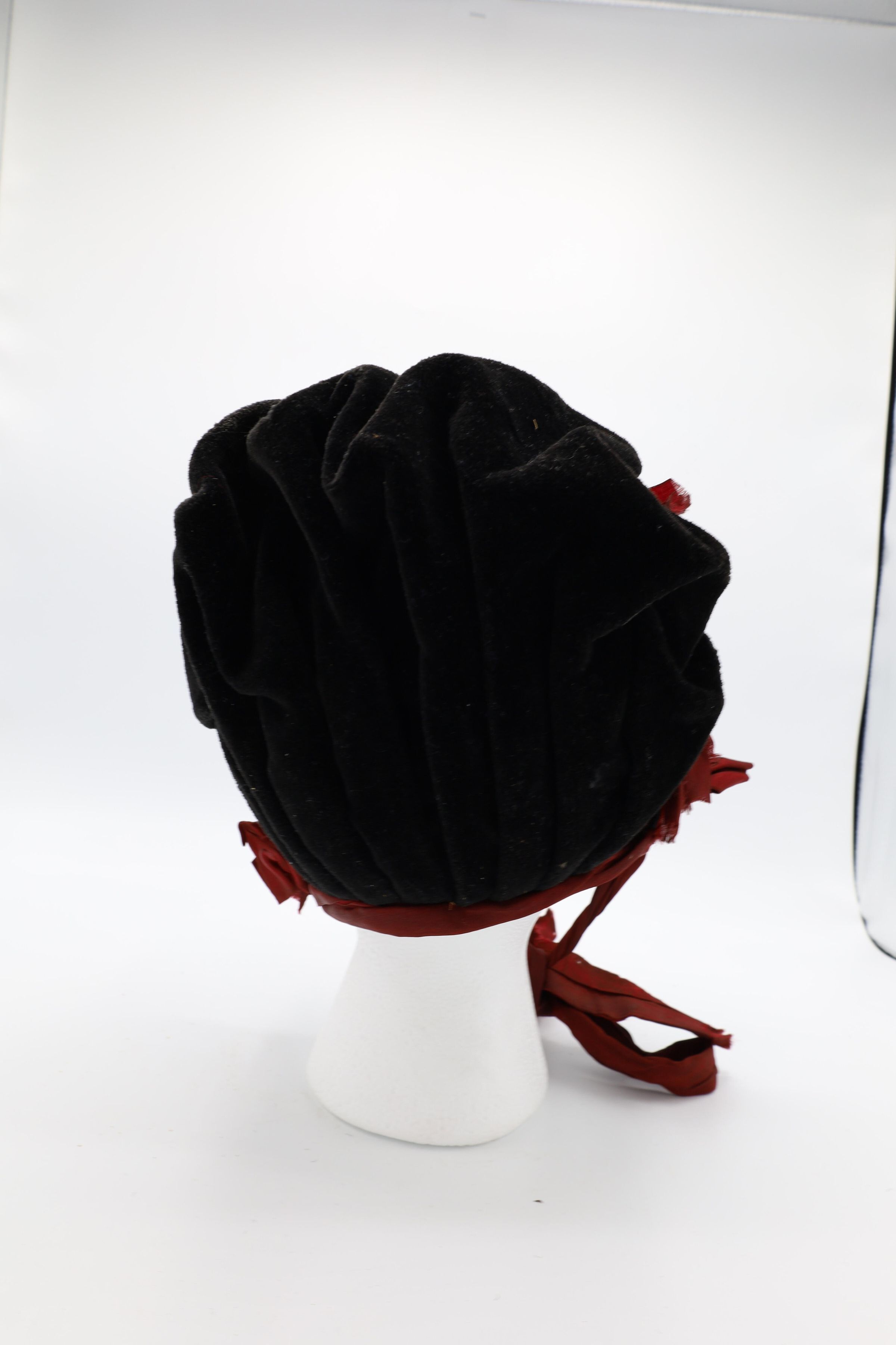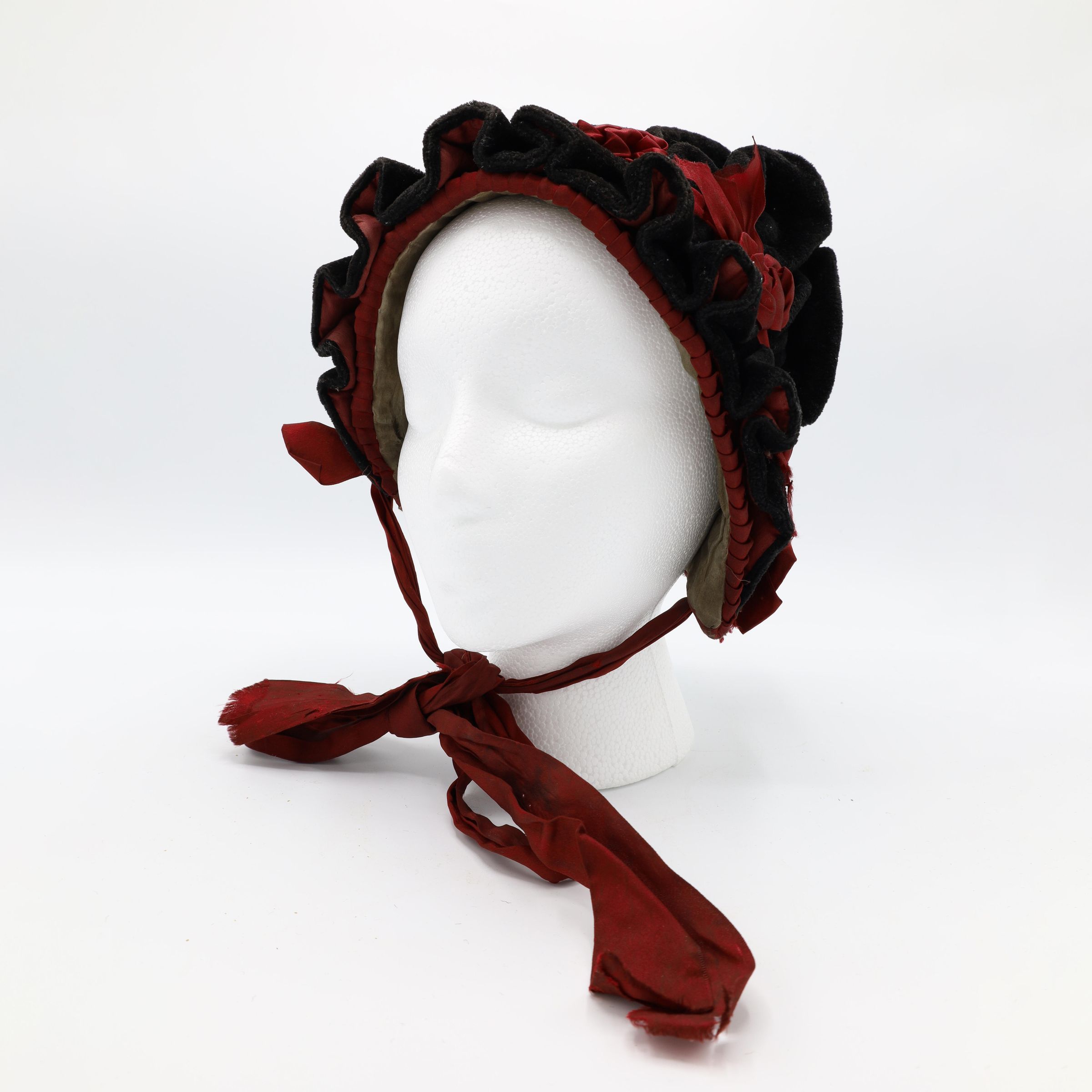 This is a mid-19th-century lady's black velvet bonnet with burgundy trim and ribbon. This bonnet has a simple and elegant design bound to complement its wearer.Use