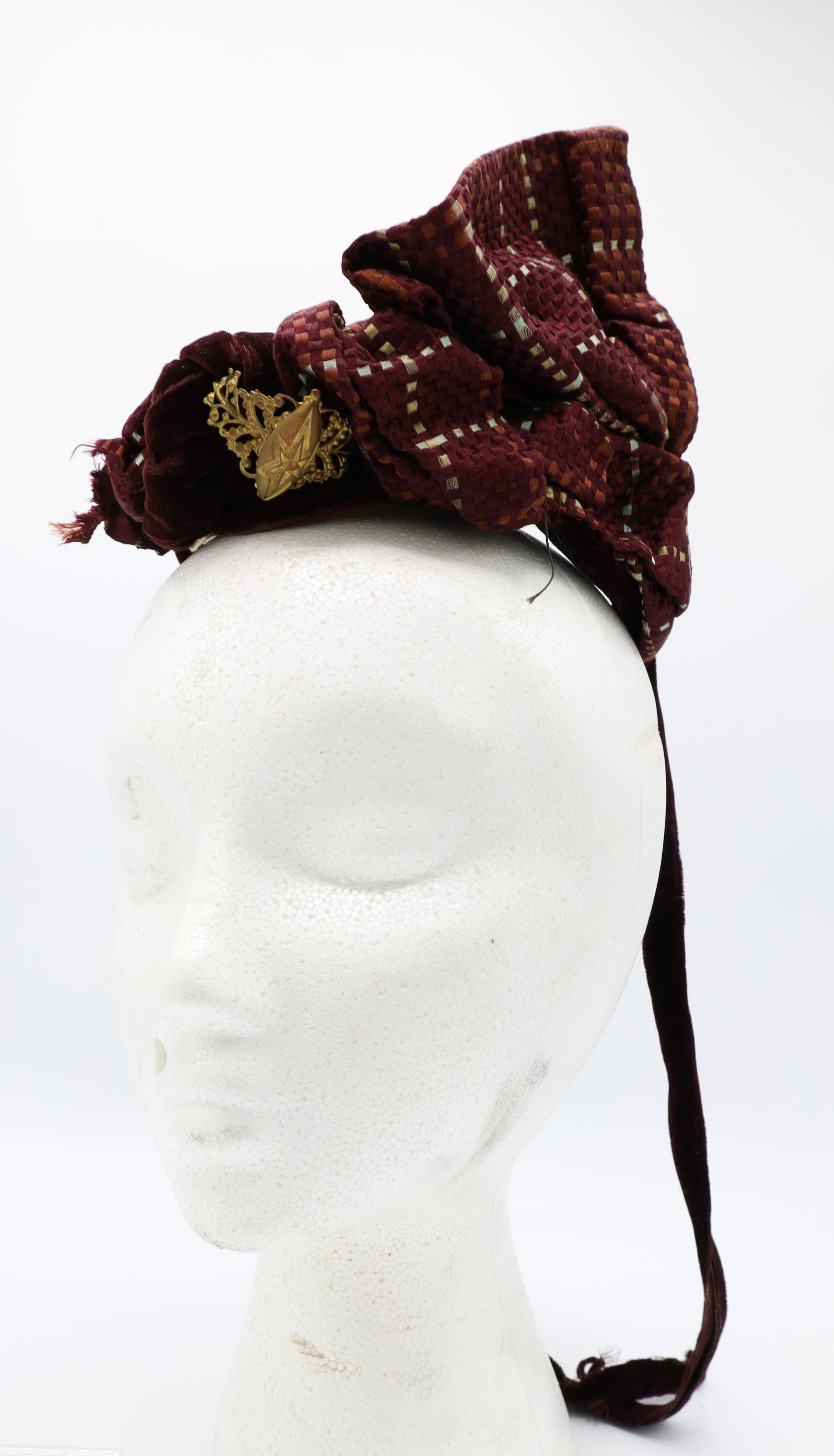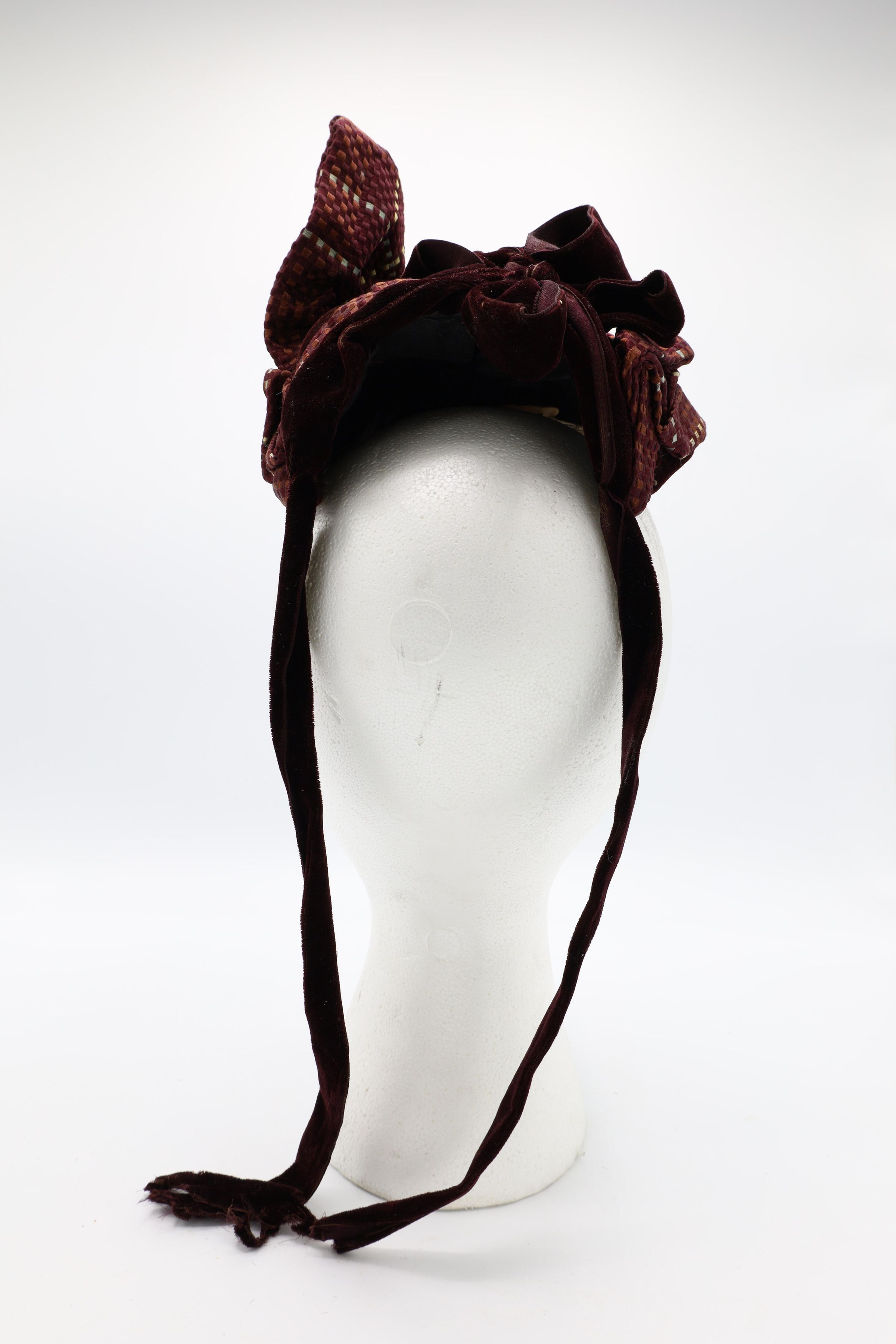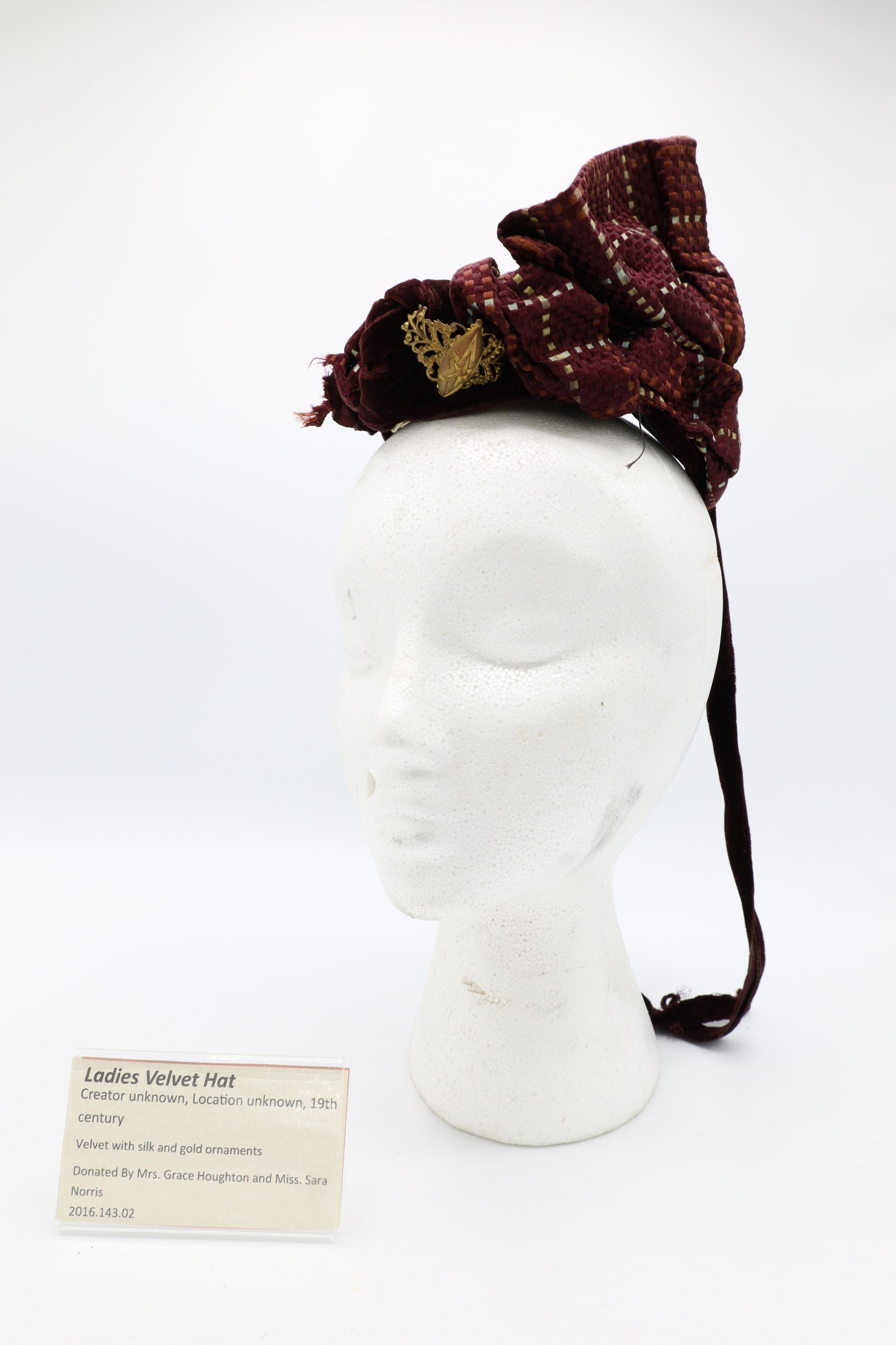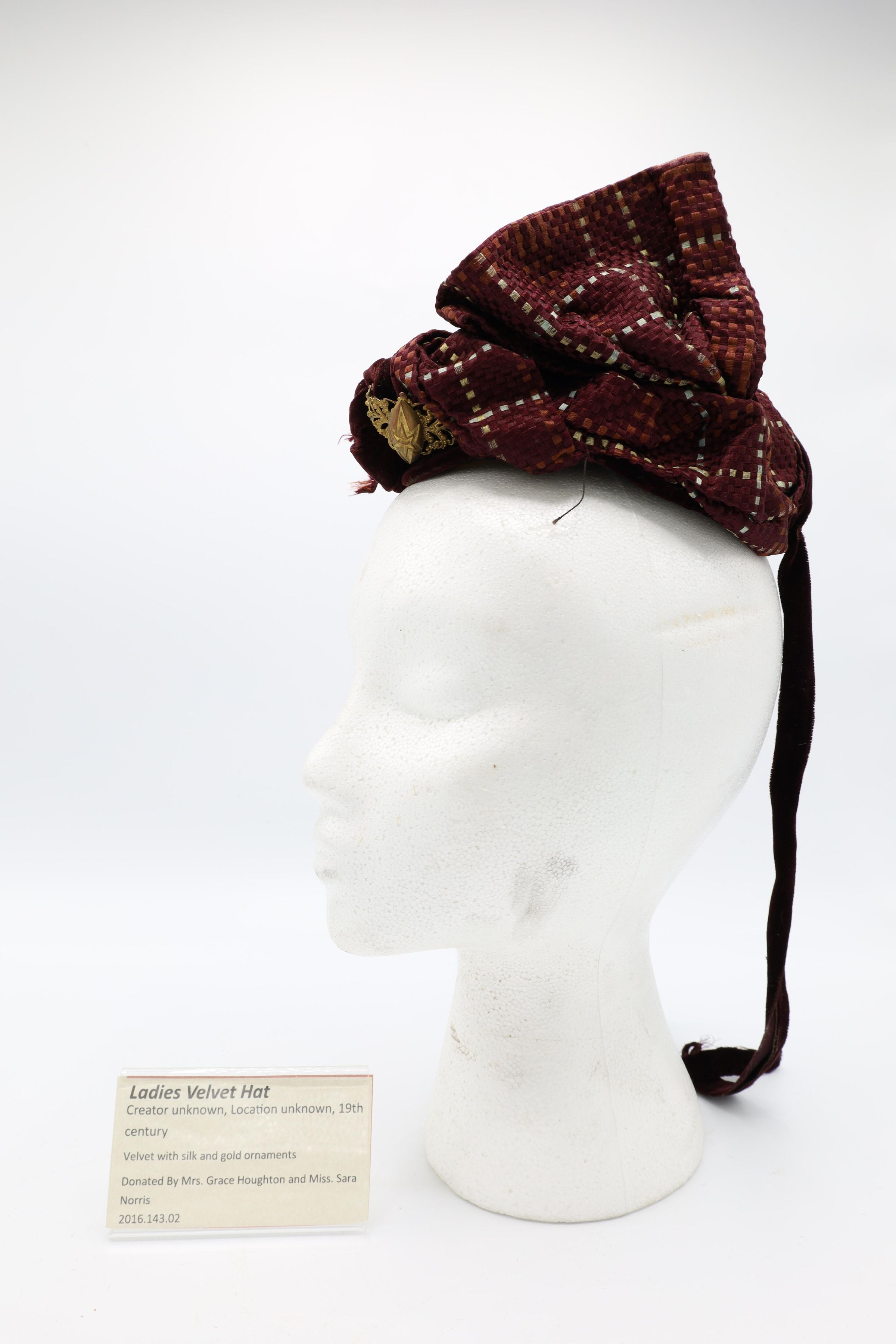 This 19th-century lady's velvet hat is adorned by silk and gold ornaments with a ribbon tied about the chin.Use