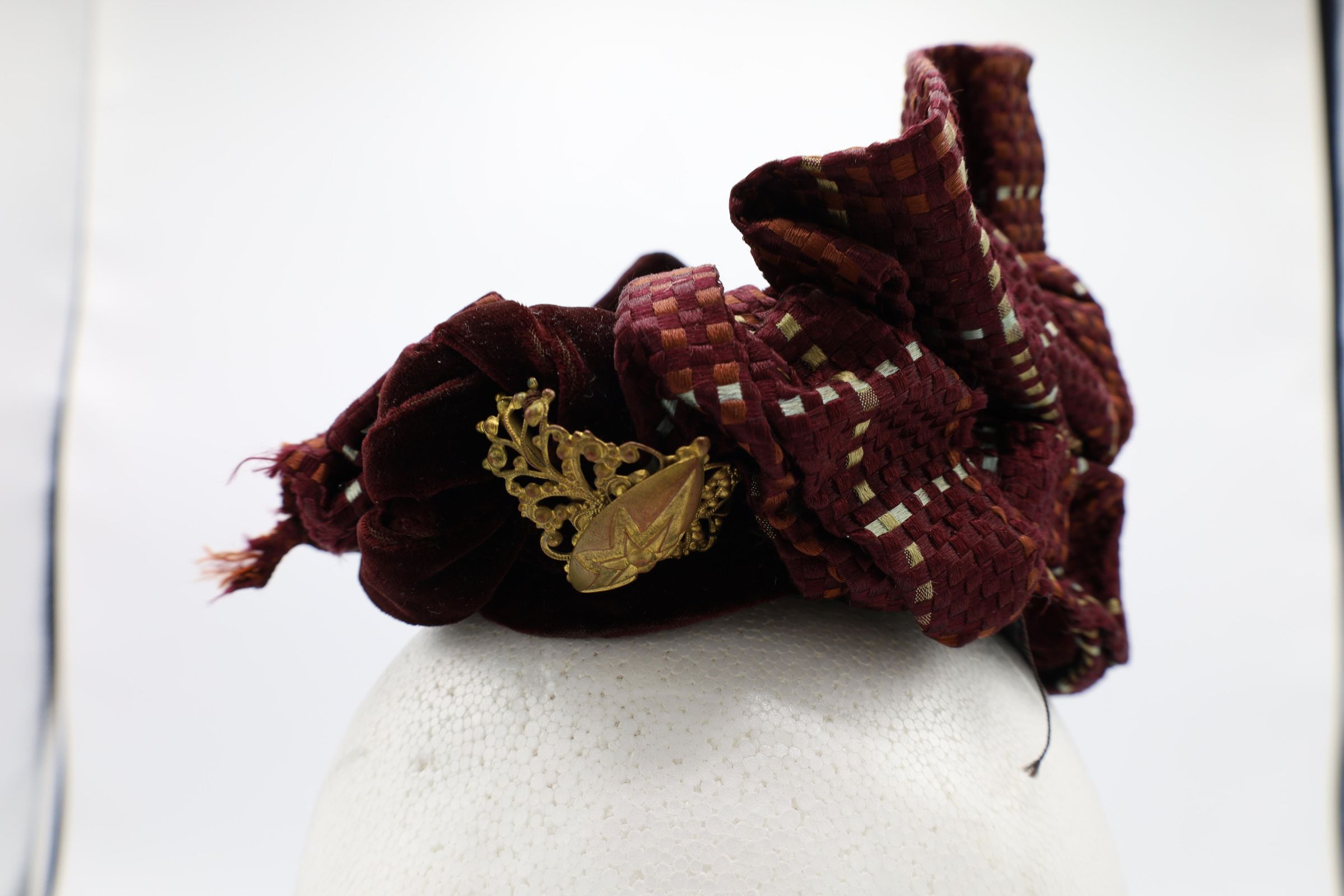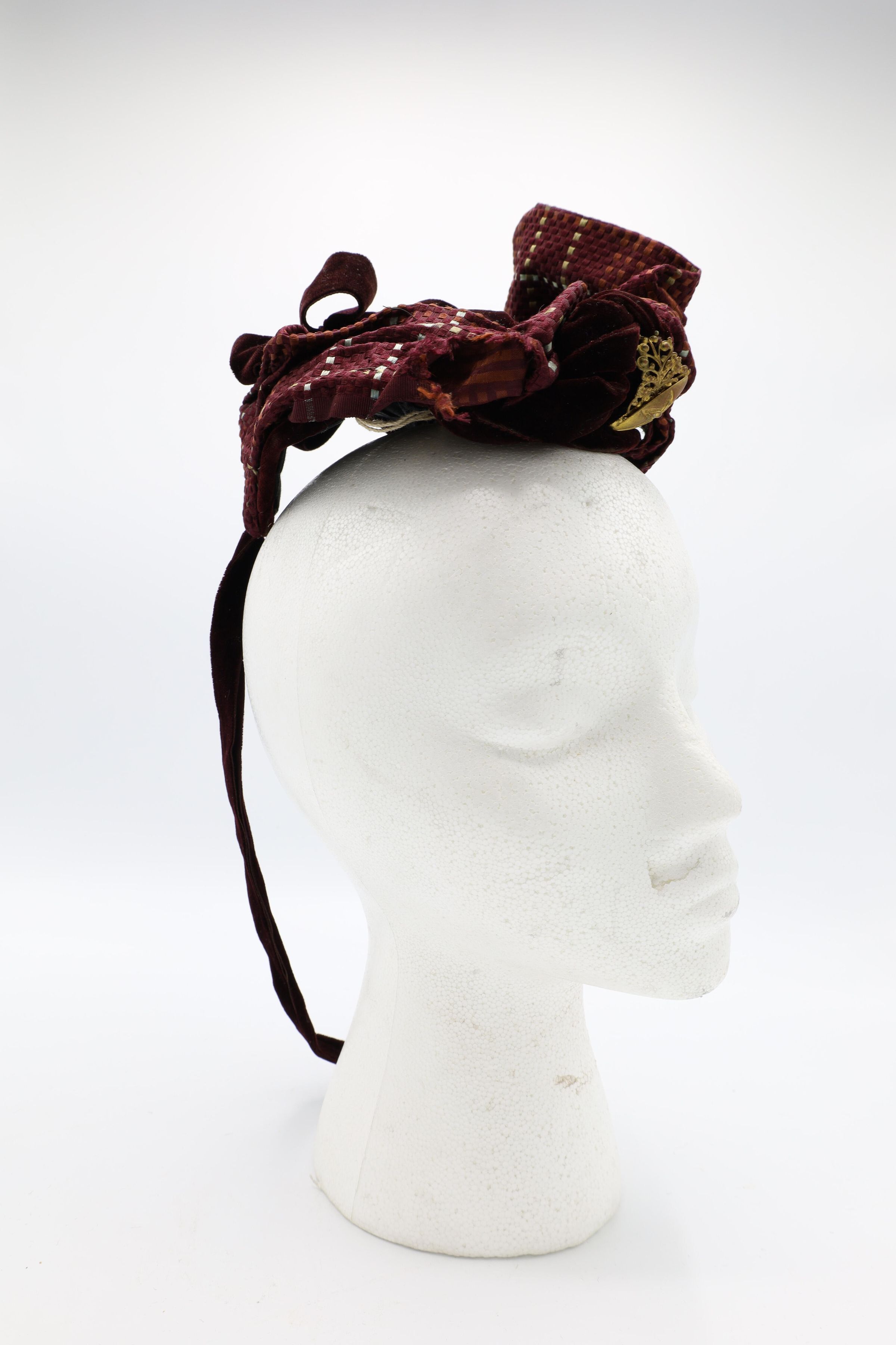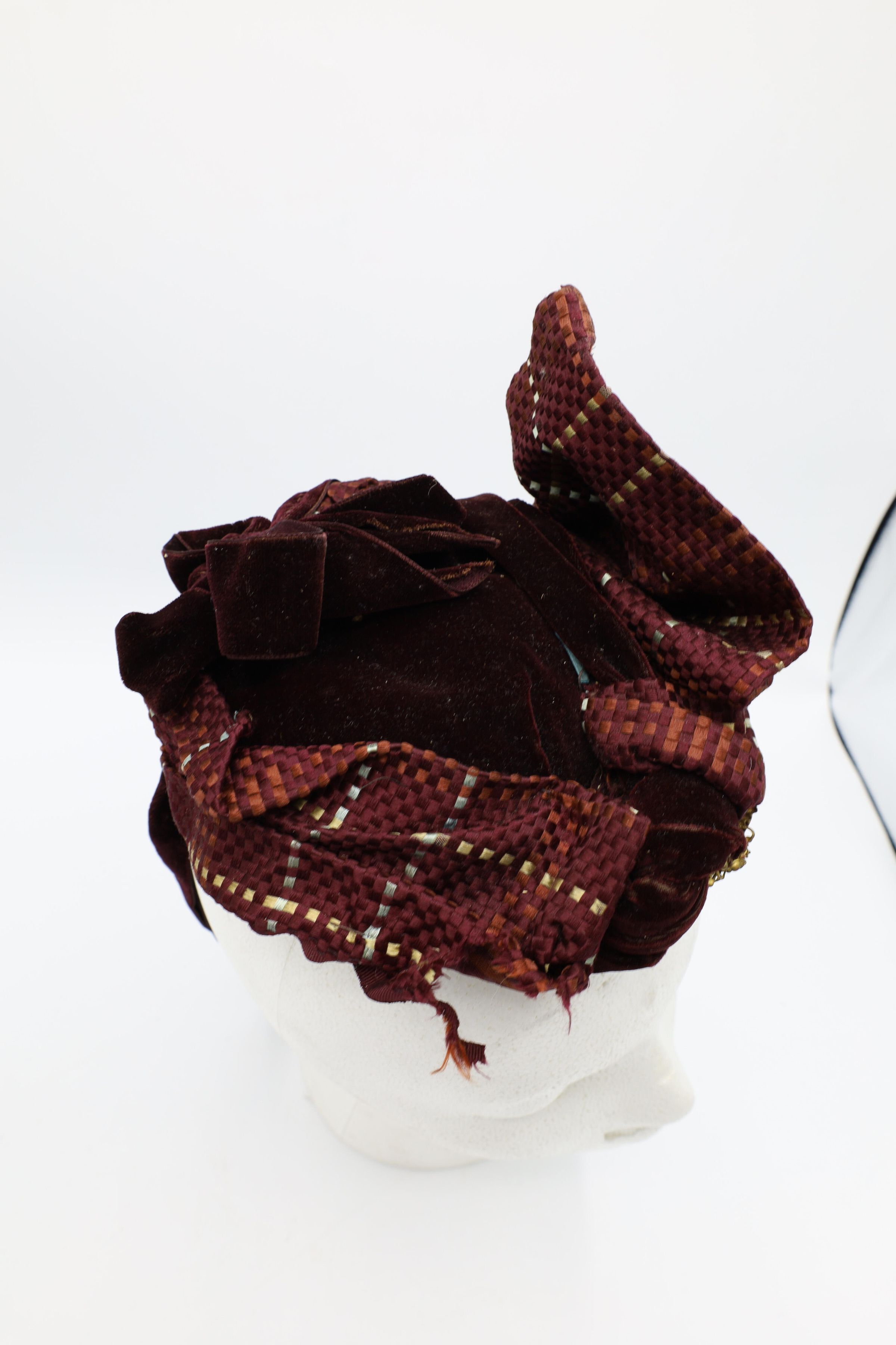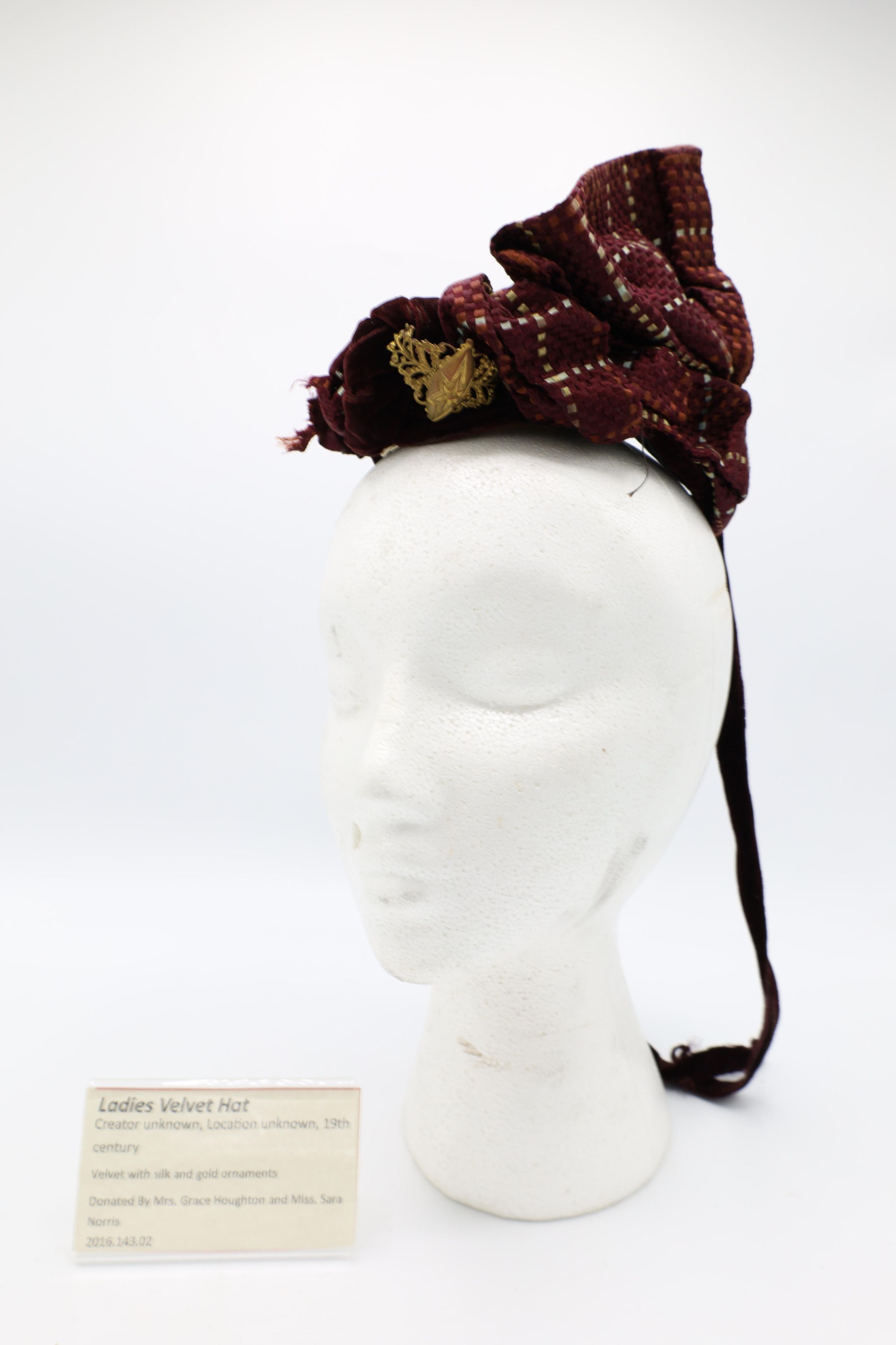 This 19th-century lady's velvet hat is adorned by silk and gold ornaments with a ribbon tied about the chin.Use