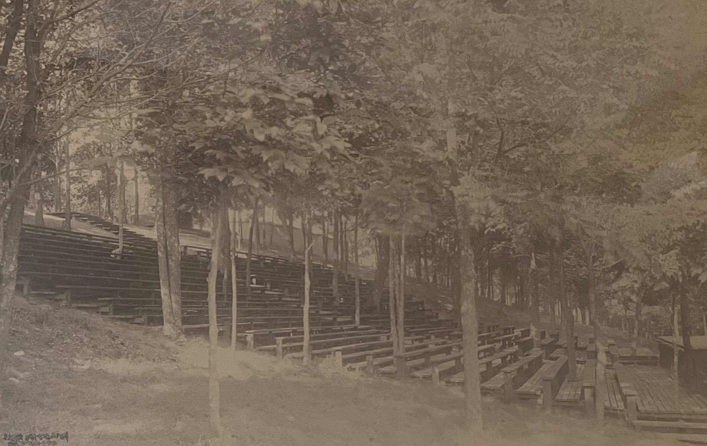 A wooded amphitheater on the grounds of Alma Lake Park.