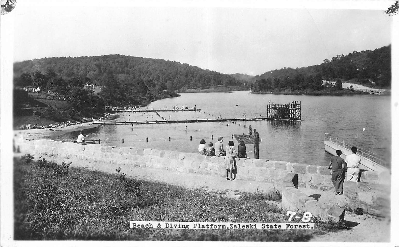 Visitors stand along the retaining wall at Lake Hope's spillway and look out onto the park's beach, swimming area, and diving pier. Parkgoers flock to these attractions in the distance. All of Lake Hope State Park was once part of the Zaleski State Forest. Today, the Zaleski State Forest surrounds Lake Hope State Park.
