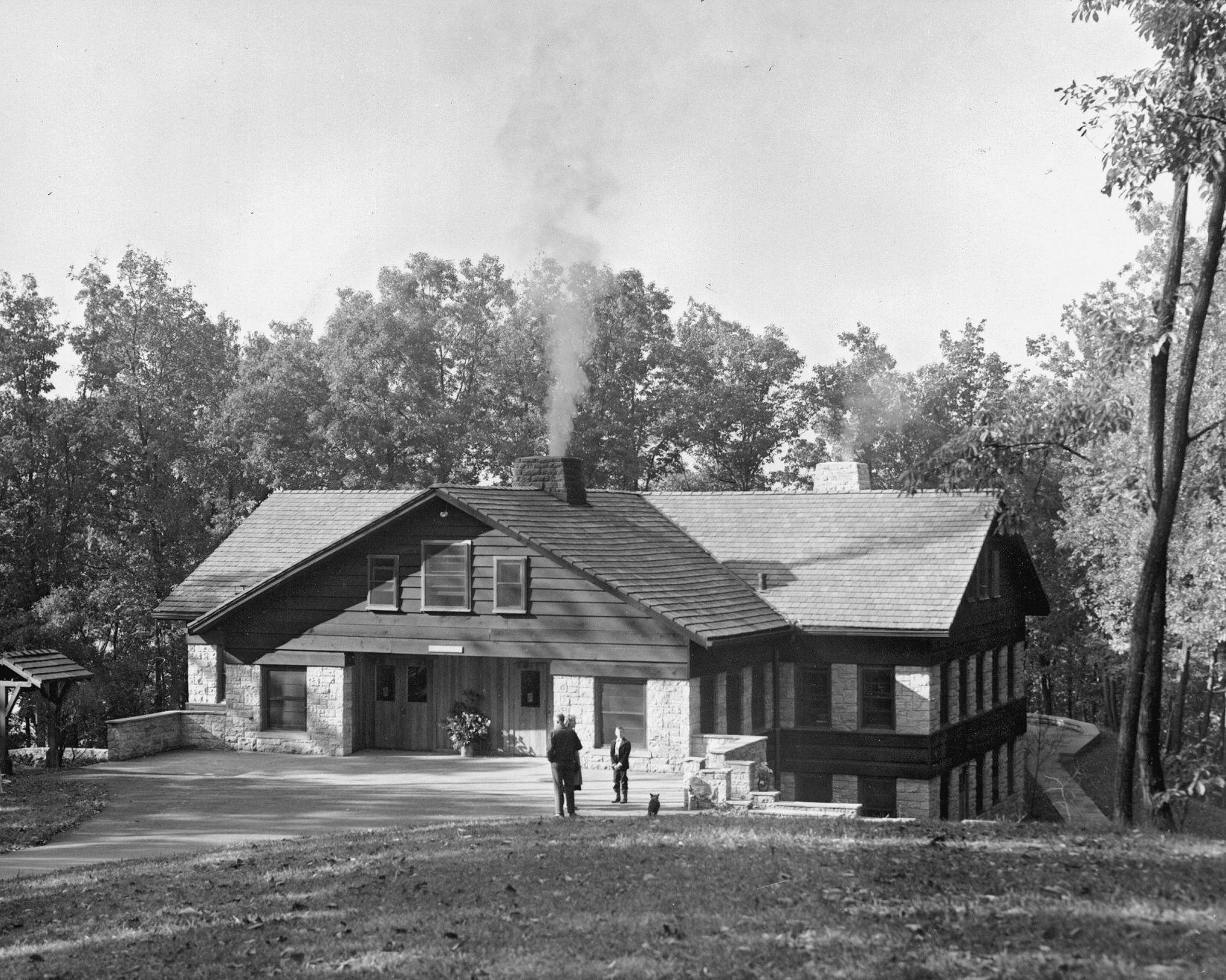 Guests stand outside of Lake Hope's dining lodge, perhaps discussing their meal or their plans for the day. It appears that one diner has brought their dog with them. Smoke pours from the building's chimneys as the staff inside the lodge cook delectable food for hungry customers.