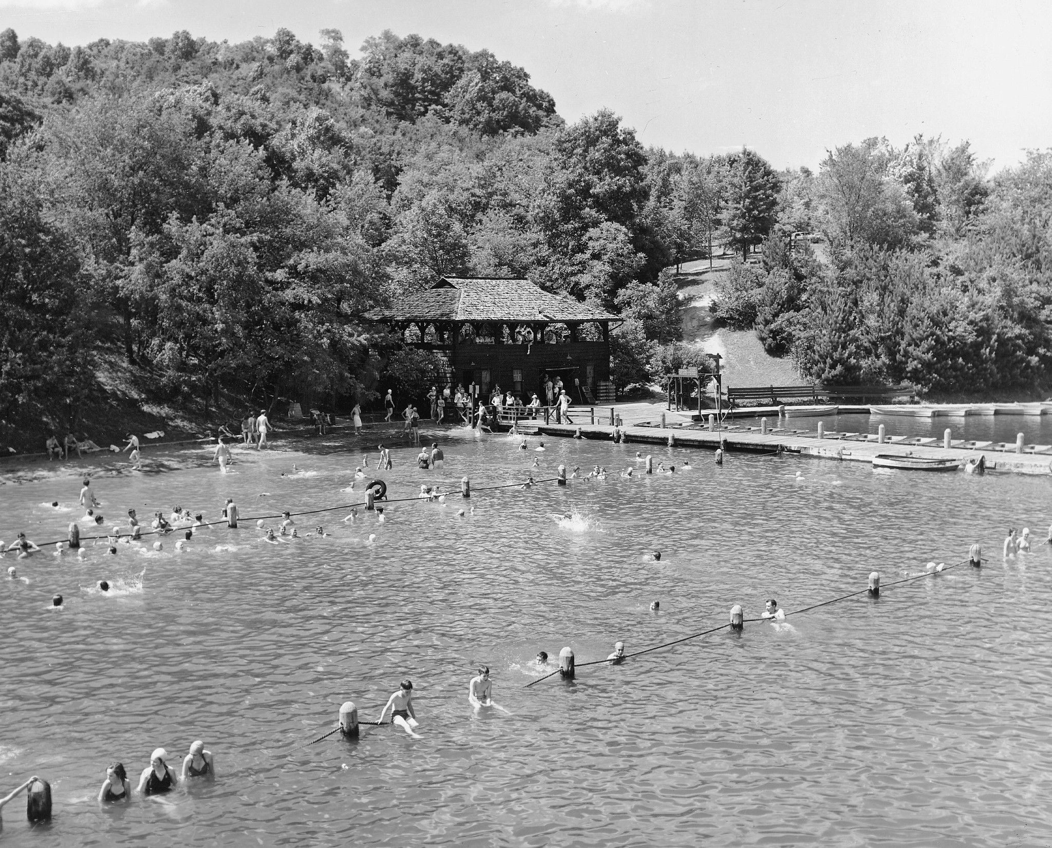 Swimmers play in the swimming areas of Lake Hope. Those looking to relax sit along the rope that marks the boundaries of the swimming area.