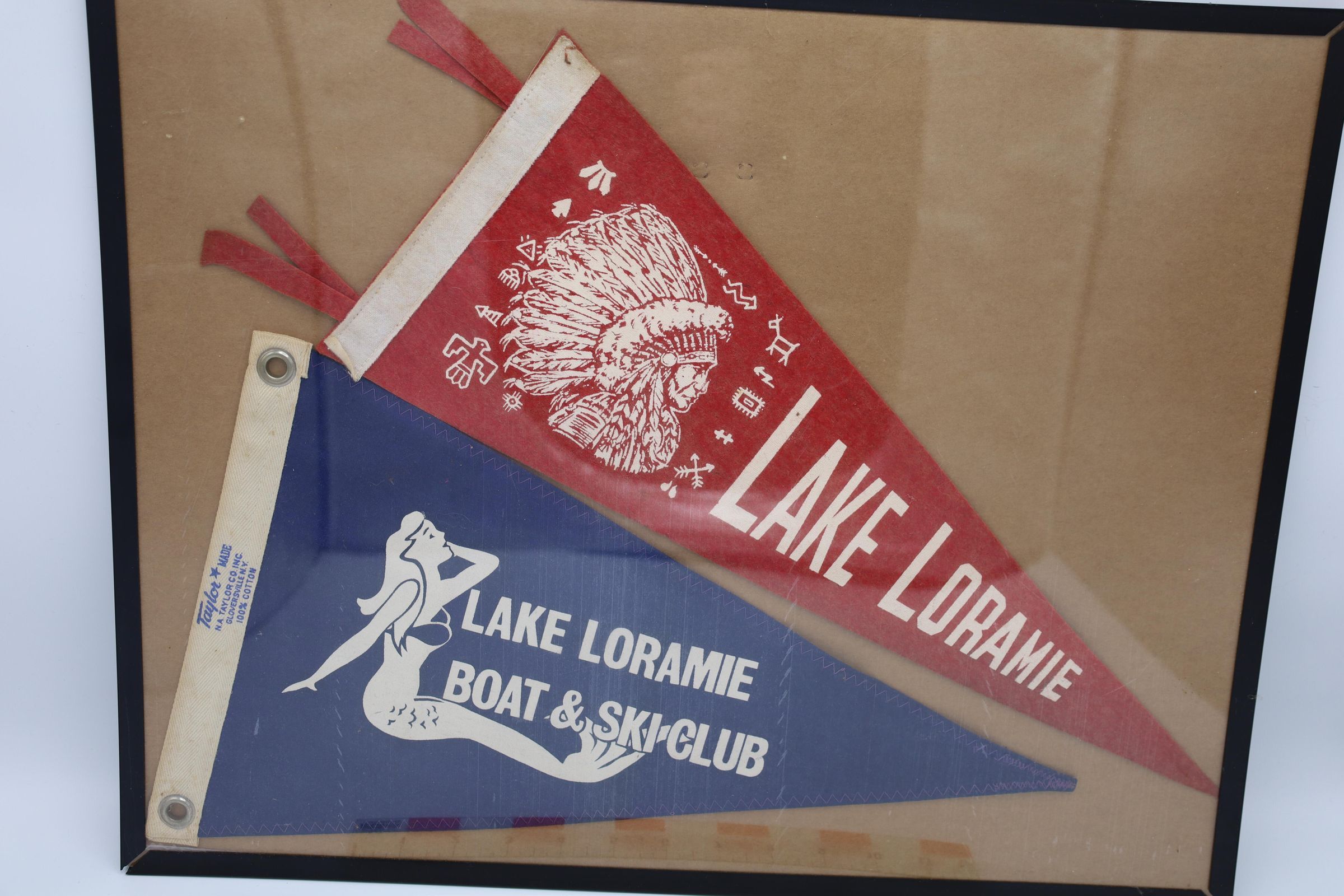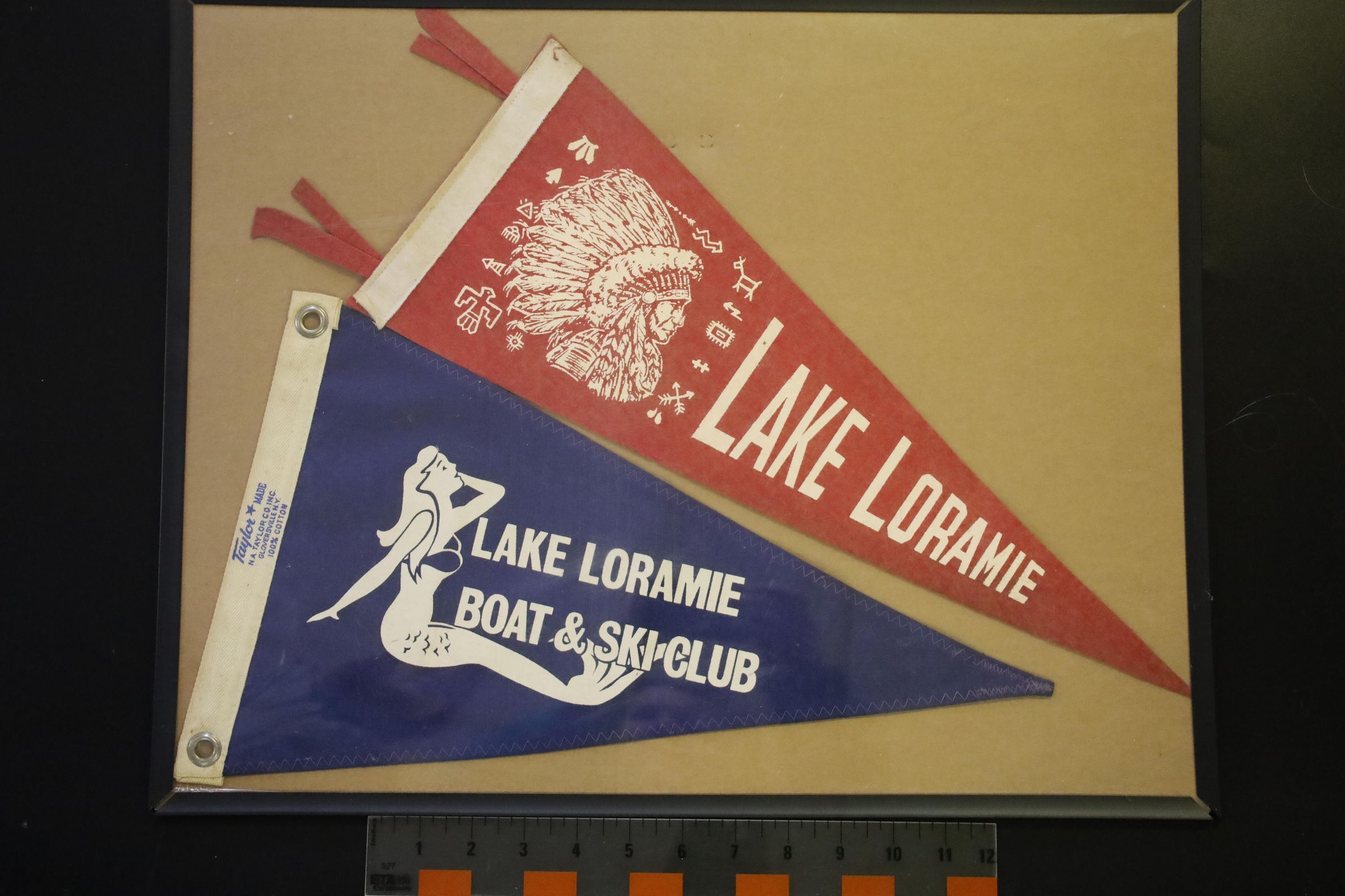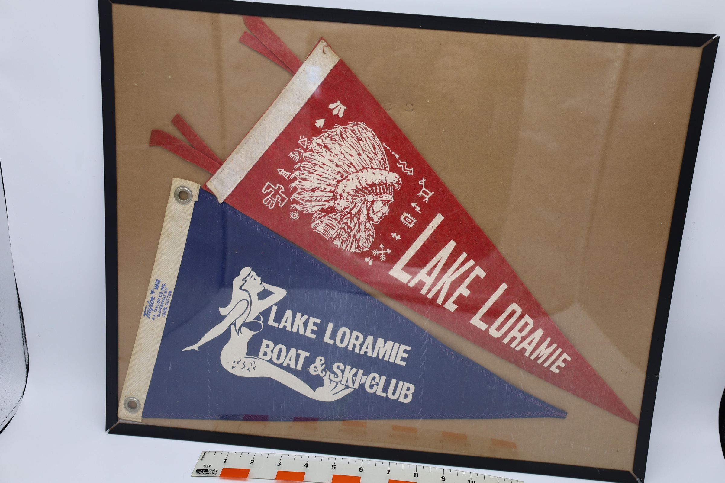 This is a set of two felt pennants. One of these felt pennants is royal blue with a mermaid-themed logo for the Lake Loramie Boat & Ski Club written in white. The other pennant is made of red felt with an American Indian with a headdress surrounded by various symbols, along with "Lake Loramie" spelled out in white.Location