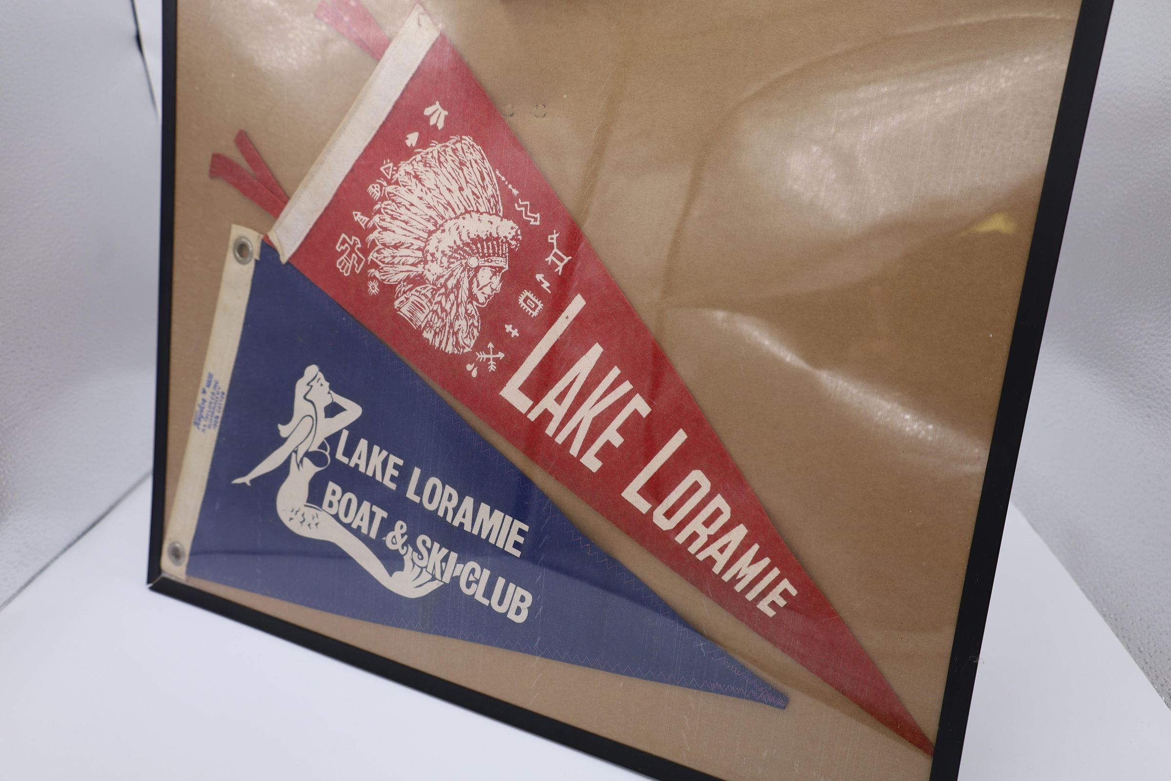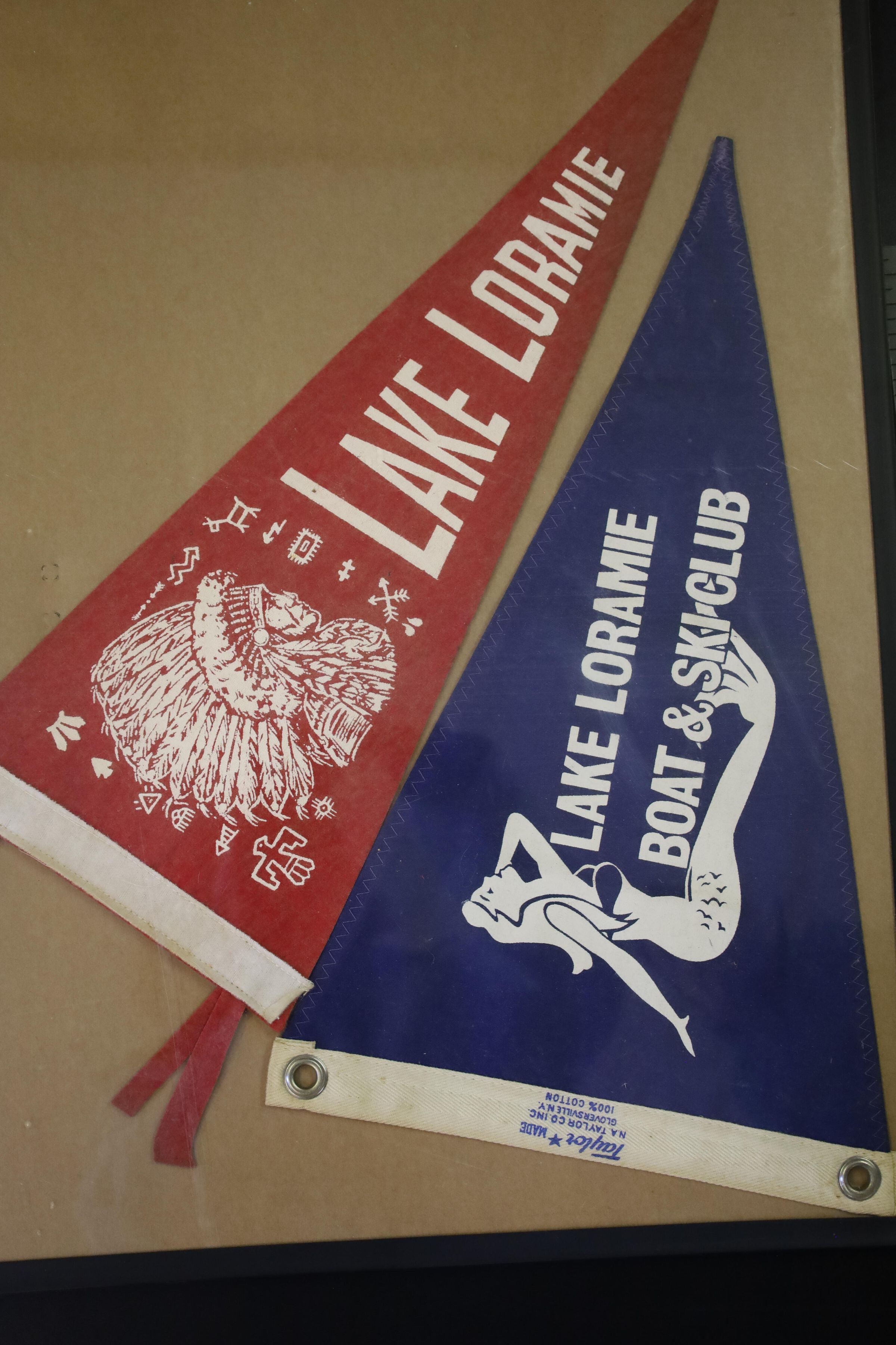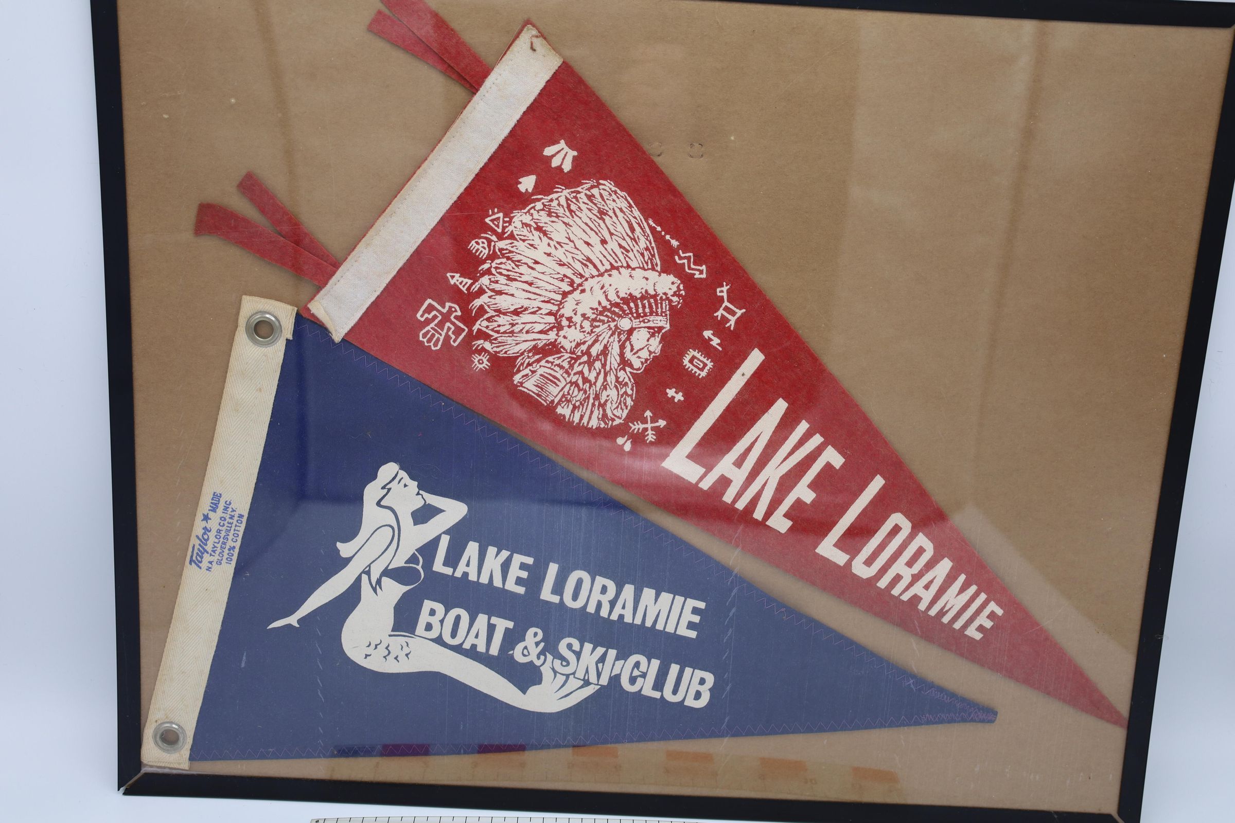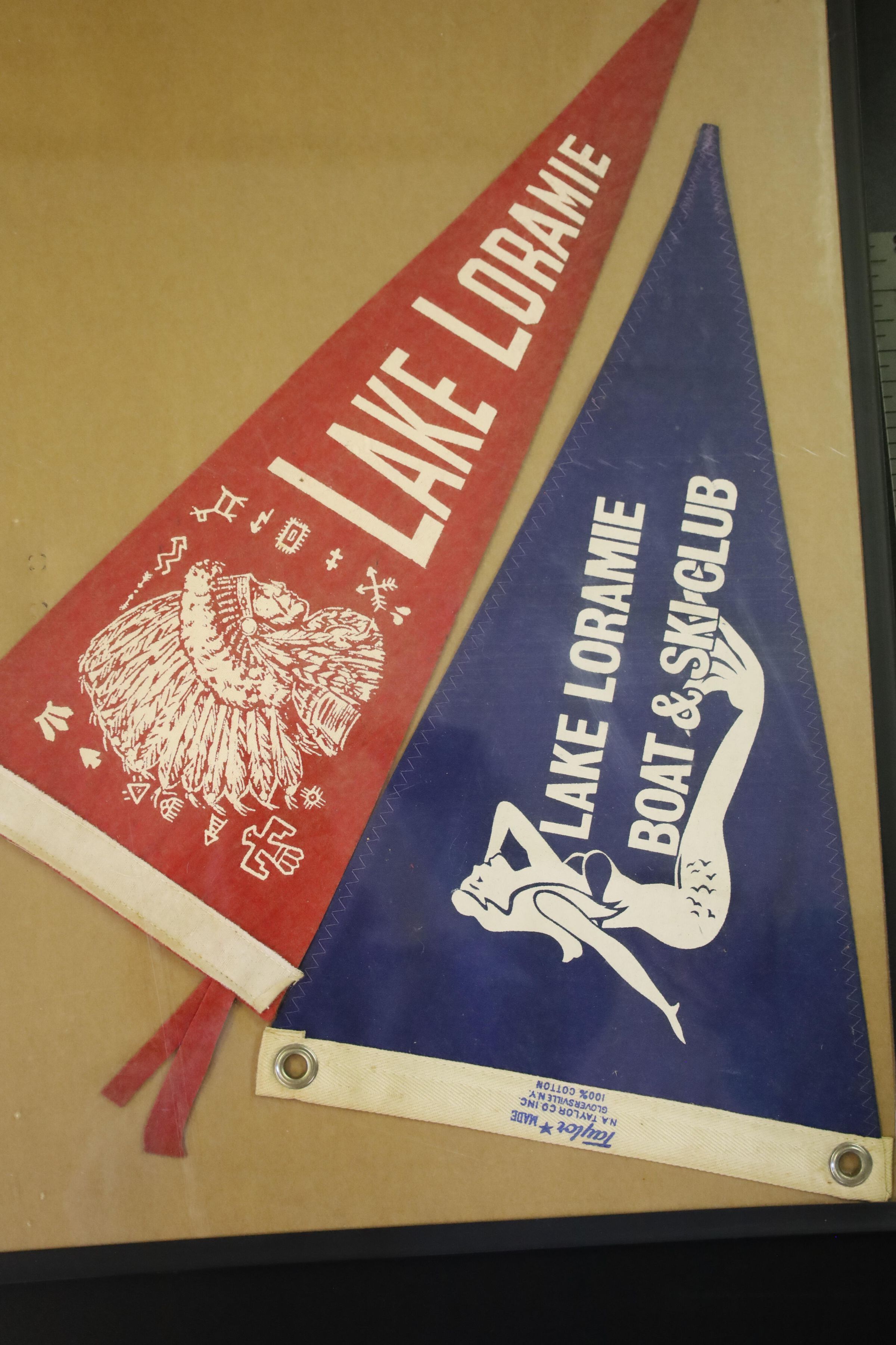 This is a set of two felt pennants. One of these felt pennants is royal blue with a mermaid-themed logo for the Lake Loramie Boat & Ski Club written in white. The other pennant is made of red felt with an American Indian with a headdress surrounded by various symbols, along with "Lake Loramie" spelled out in white.Location