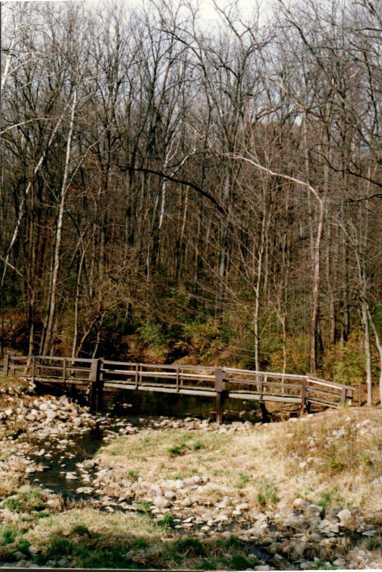 The footbridge over Sam's Creek just below Mount Gilead Lake Dam is surrounded by bare trees indicative of late autumn while the underbrush still hangs onto its leaves.Cataloged By