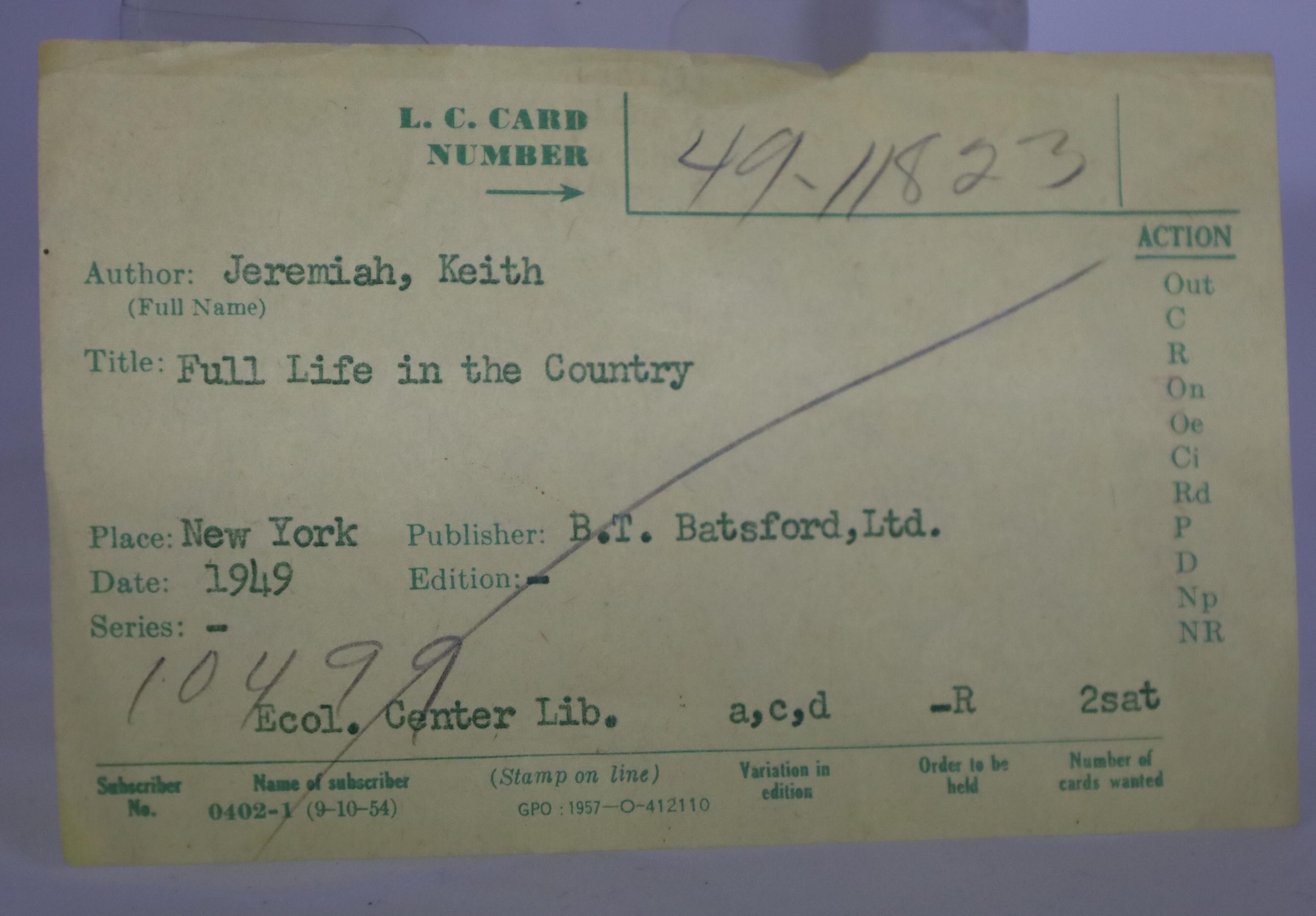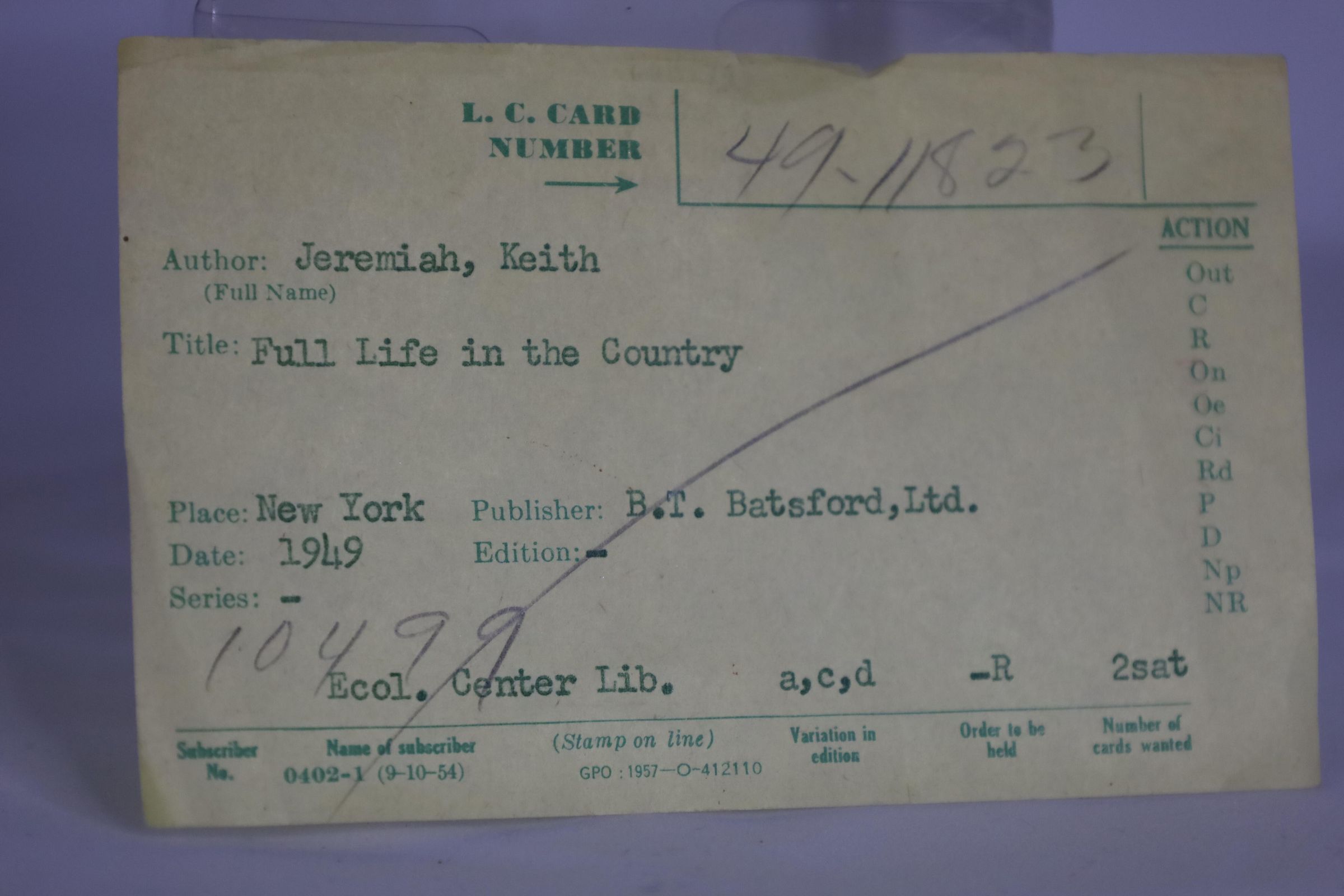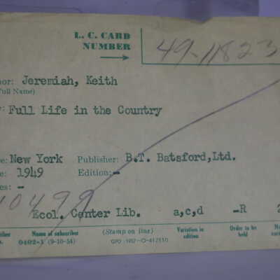 This receipt from the Ecological Center Library for Keith Jeremiah's Full Life in the County is one of many that made their way across Bromfield's desk. An avid reader, which is clearly shown by the number of books found throughout Bromfield's office and house, Bromfield also regularly used various libraries to access titles. [NOTE--The SUBSCRIBER is the Ecological Center Library? Not Bromfield? No date of borrow. 1949 is date of publication.]Location