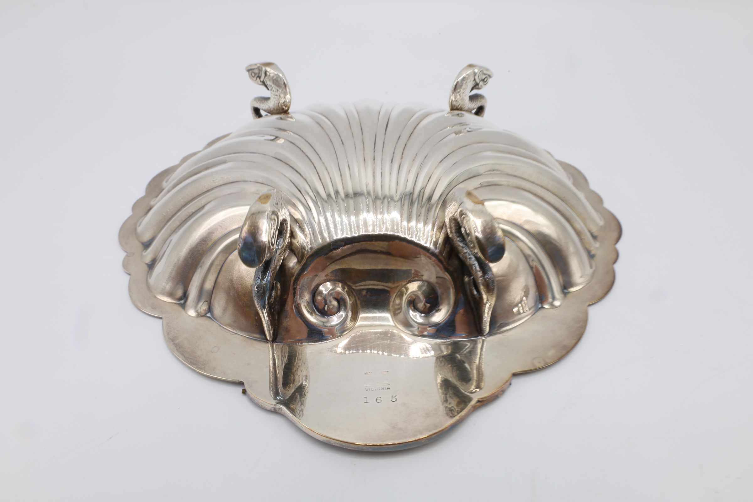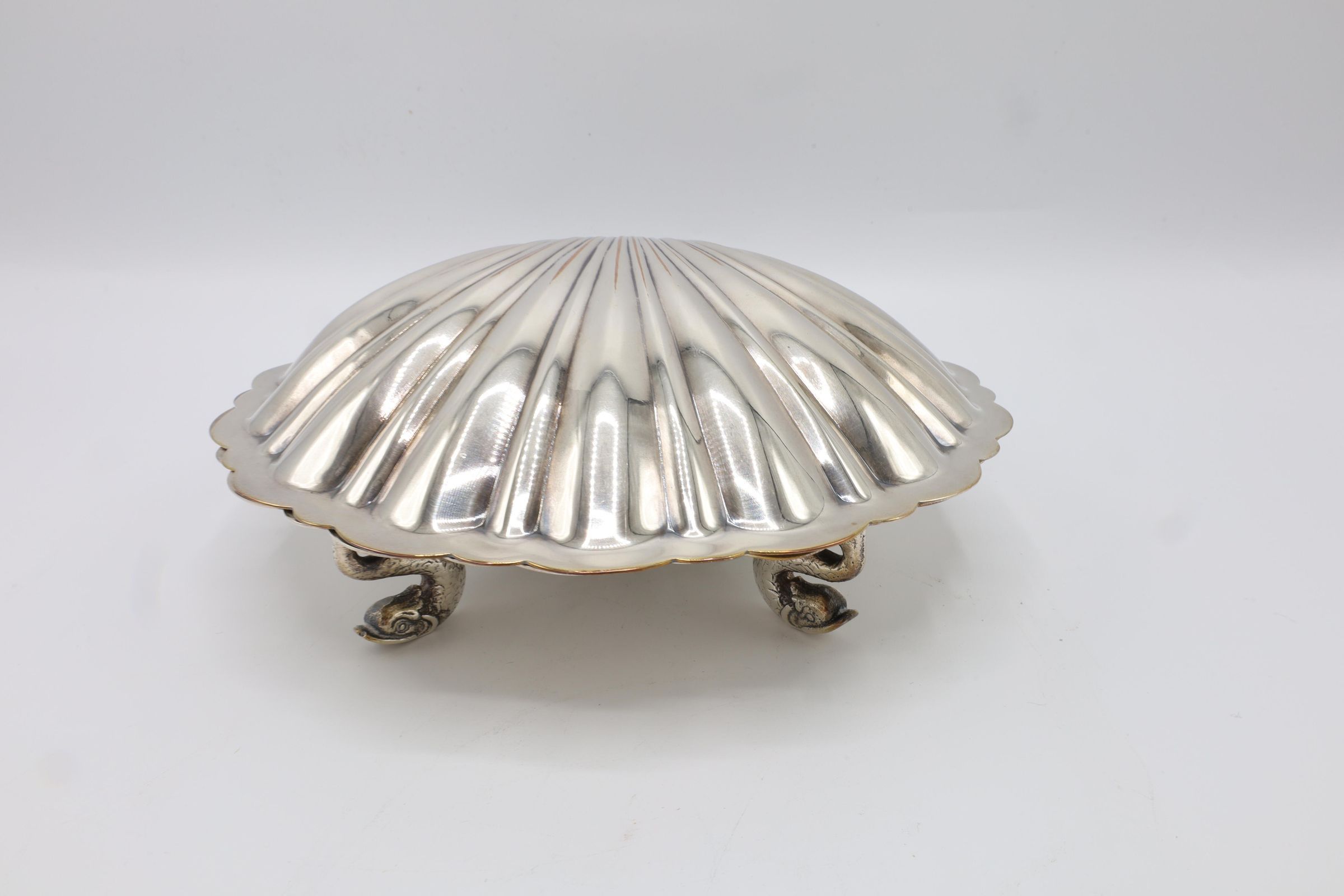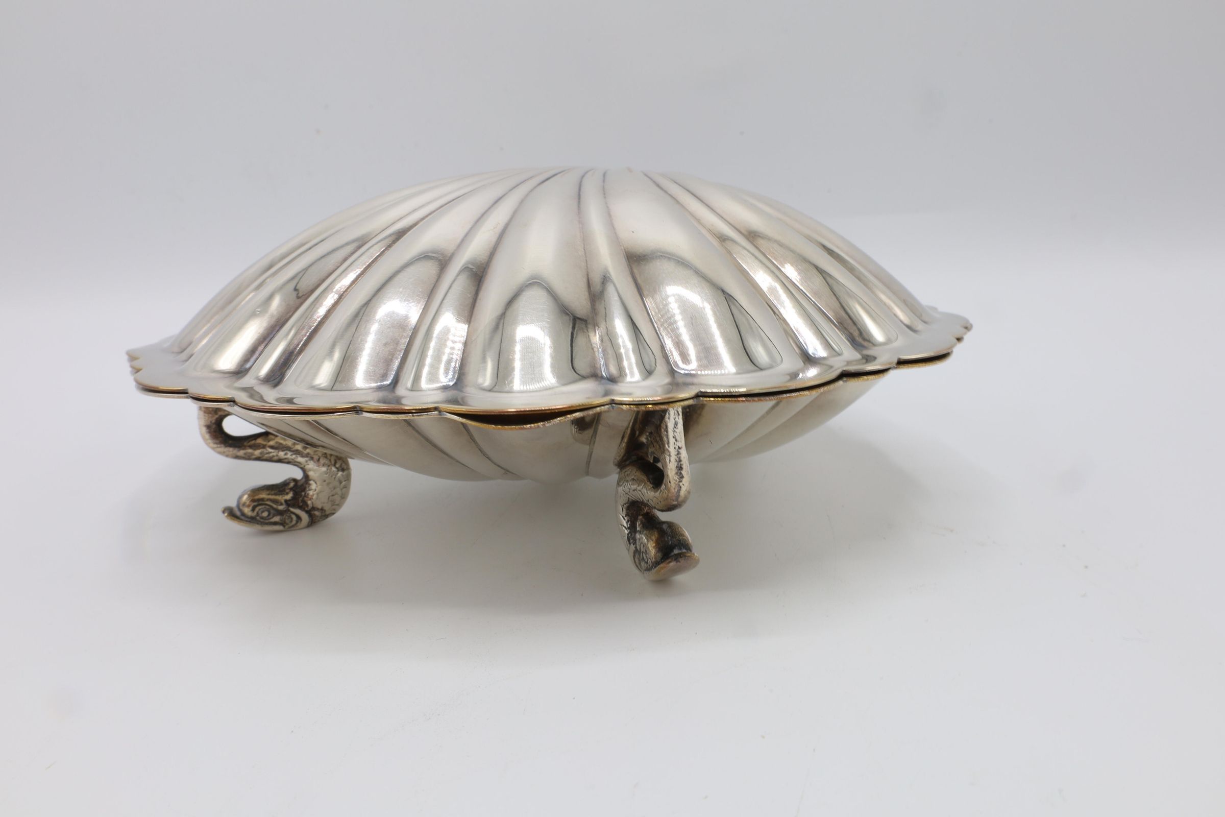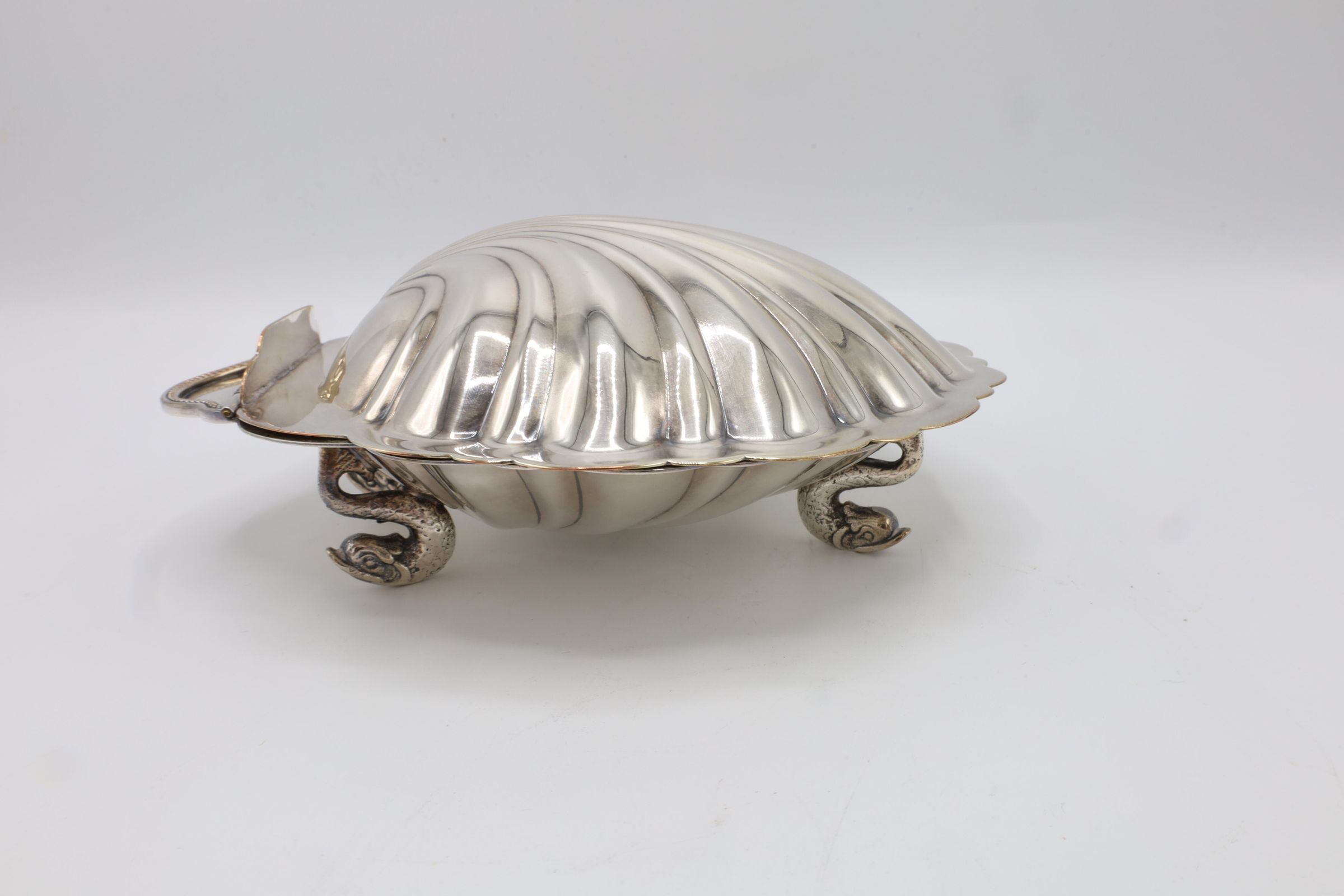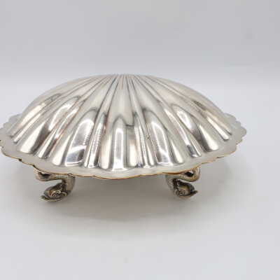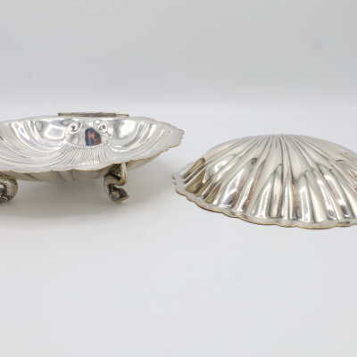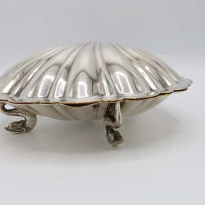 This lidded shell shaped dish is likely used for butter or caviar. The hinge on the back is broken, and the shell is marked victoria 165. The four feet are in the shape of fish.
