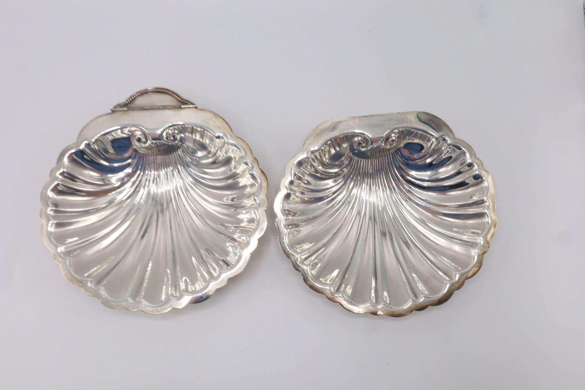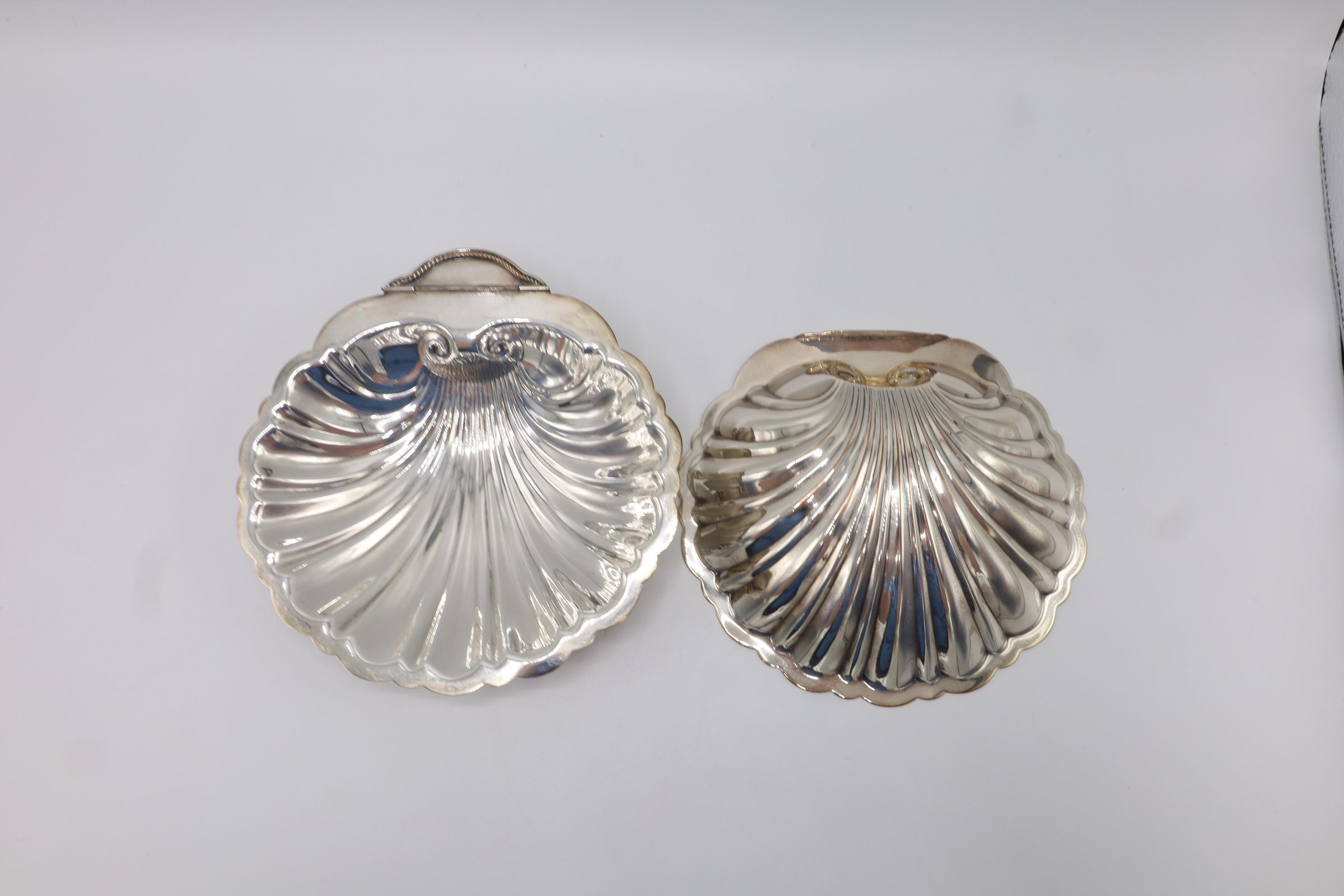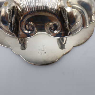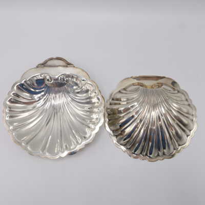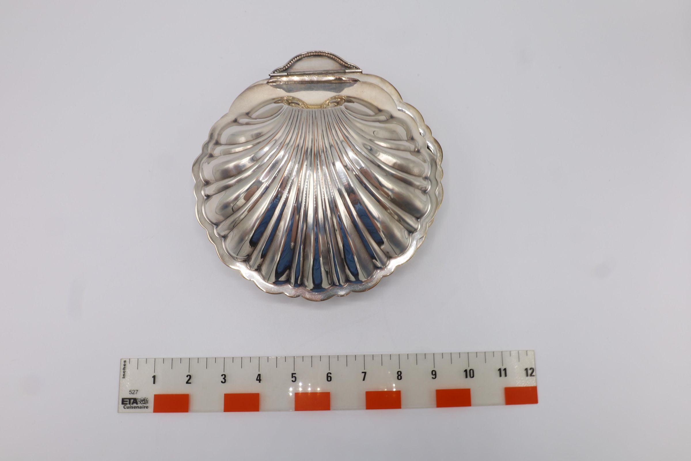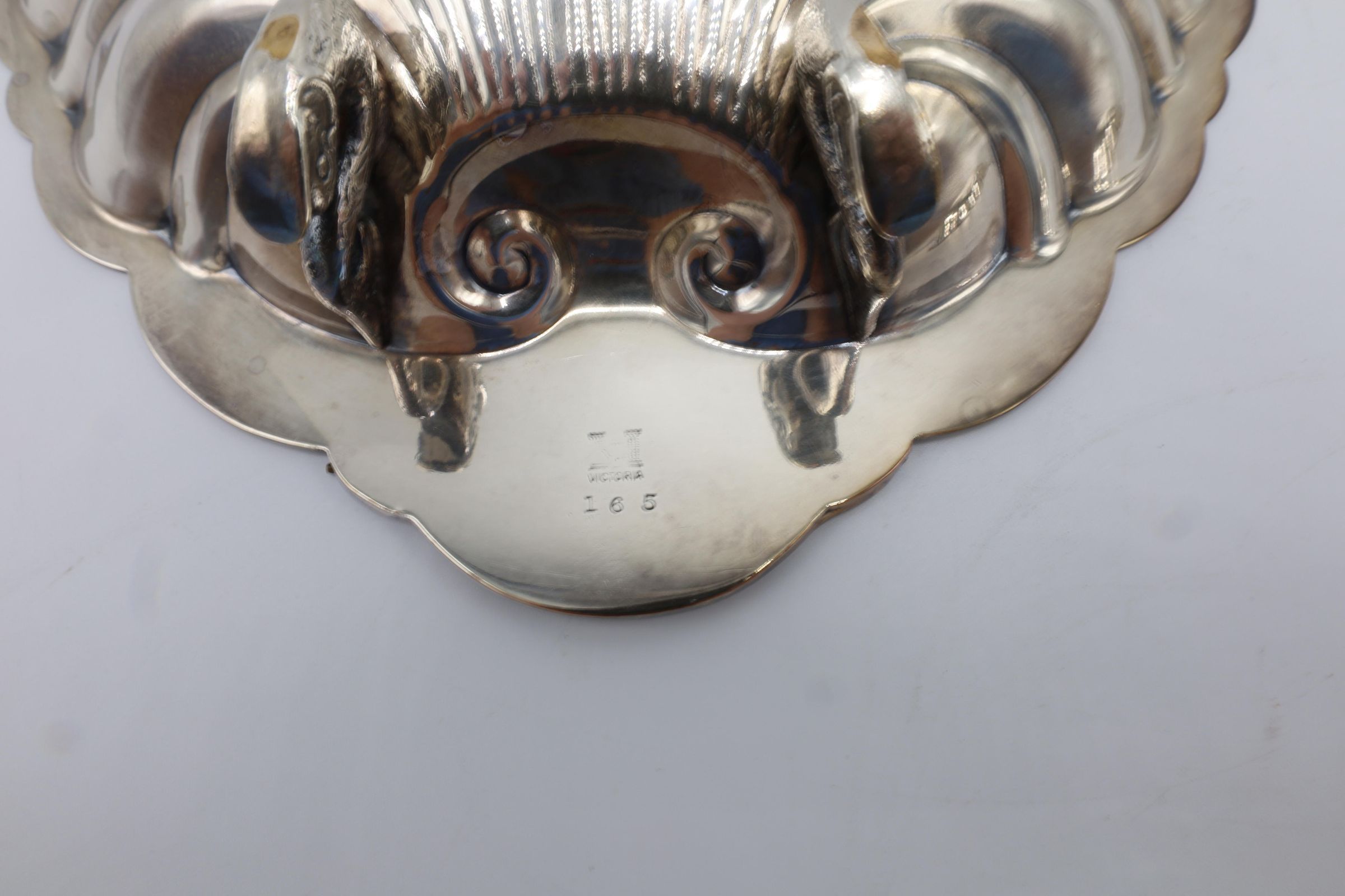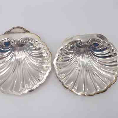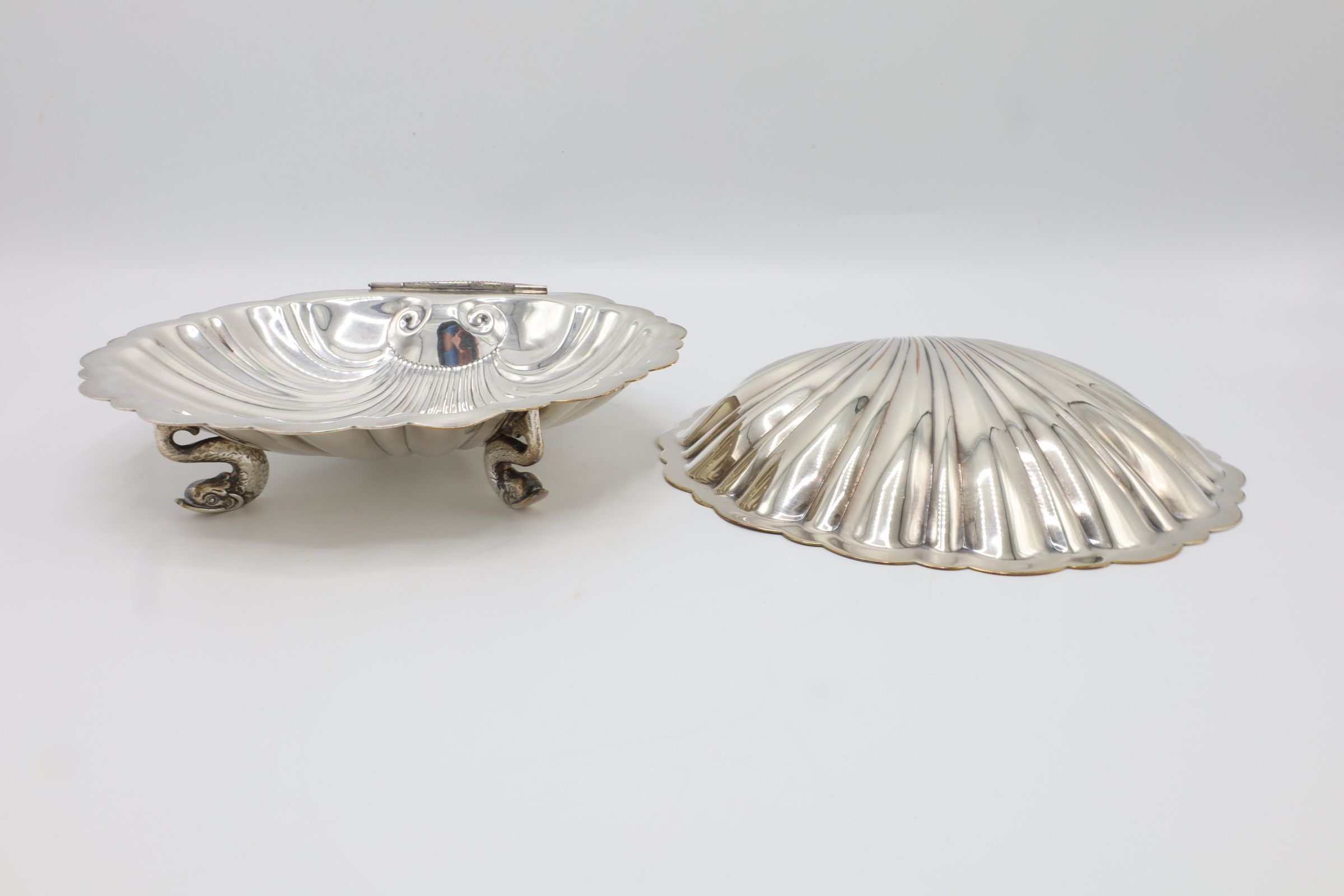 This lidded shell shaped dish is likely used for butter or caviar. The hinge on the back is broken, and the shell is marked victoria 165. The four feet are in the shape of fish.