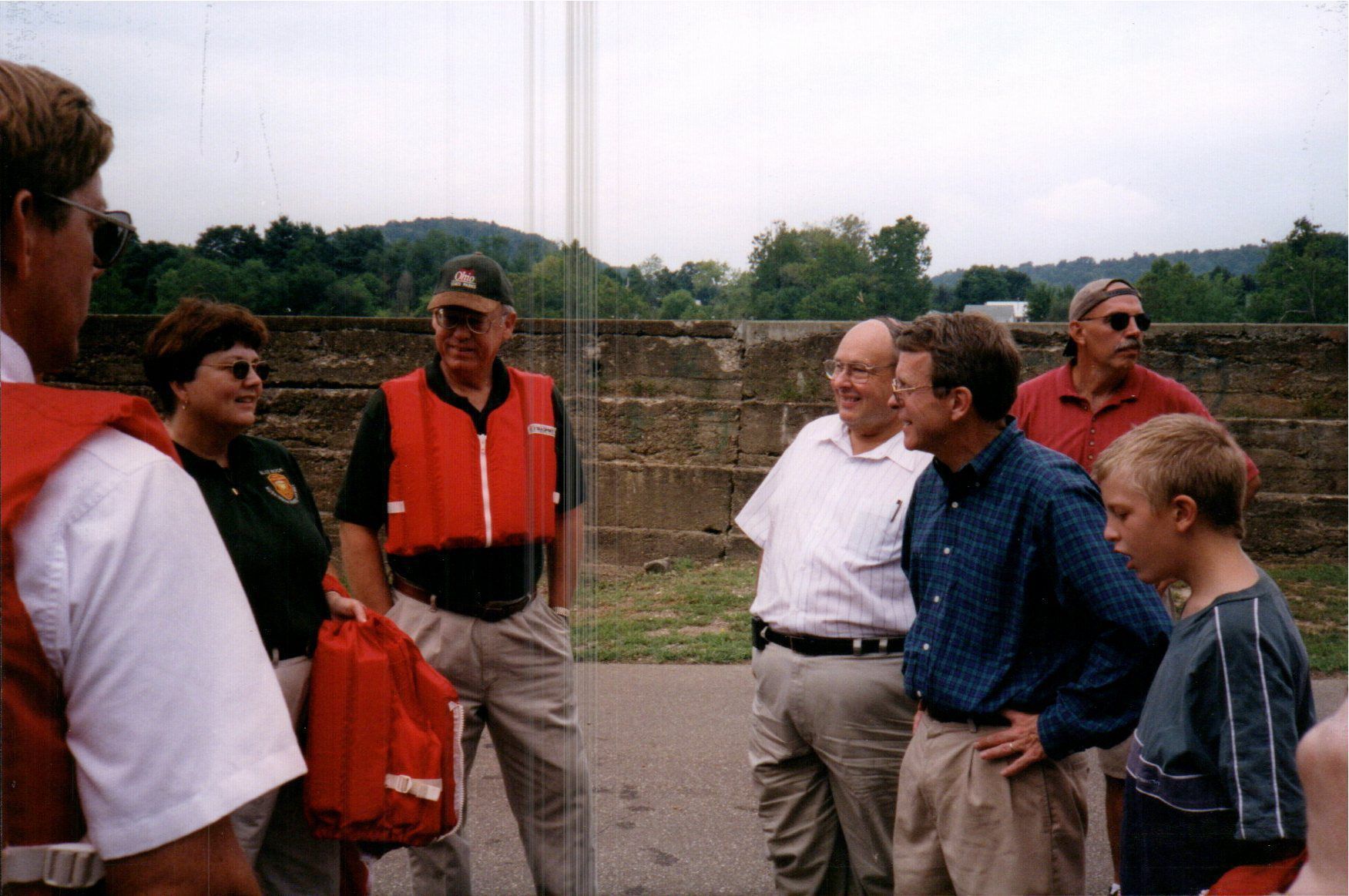 A member of Muskingum State Park's staff hands life jackets to Senator Mike Dewine and Ohio Senator James E. Carnes before embarking on a canoe trip on the Muskingum River. Mike DeWine (wearing a blue plaid shirt) served in the United States Senate between 1994 and 2006. As of 2025, Dewine became Ohio's 70th governor in 2018. James E. Carnes (next to DeWine in a white striped shirt) served in the Ohio Senate from 1995 until his resignation in 2004 to become deputy director of the Ohio Department of Natural Resources.