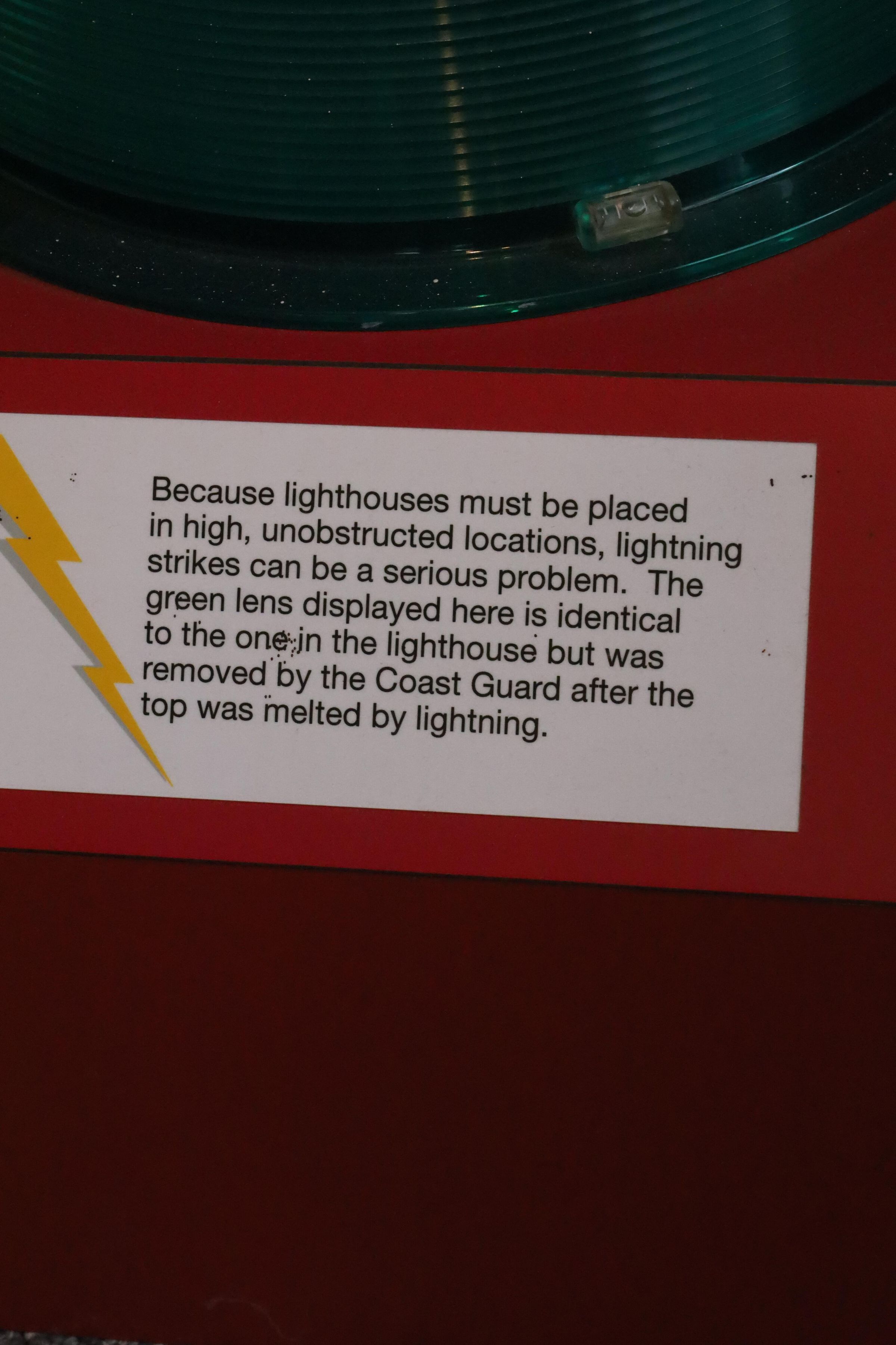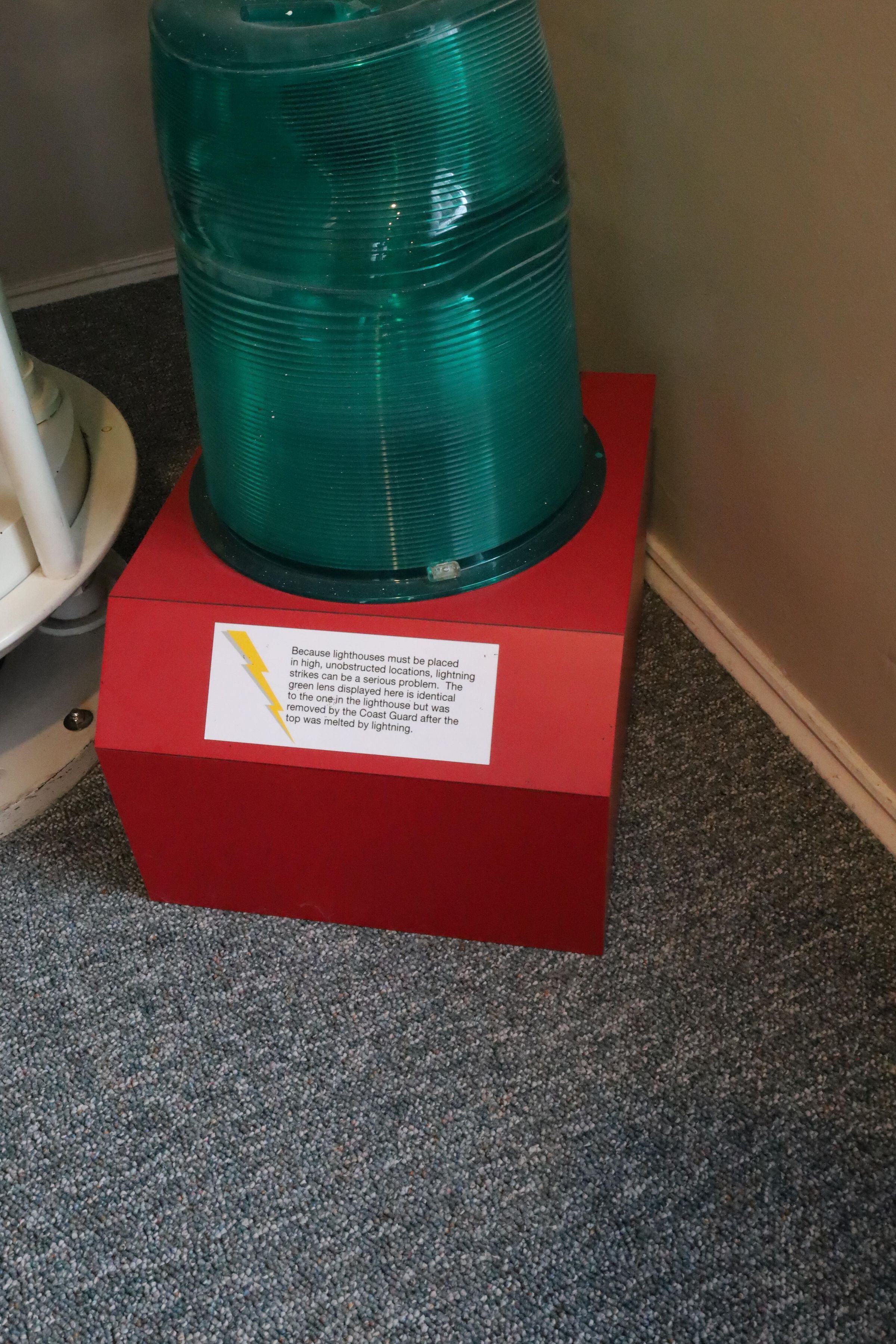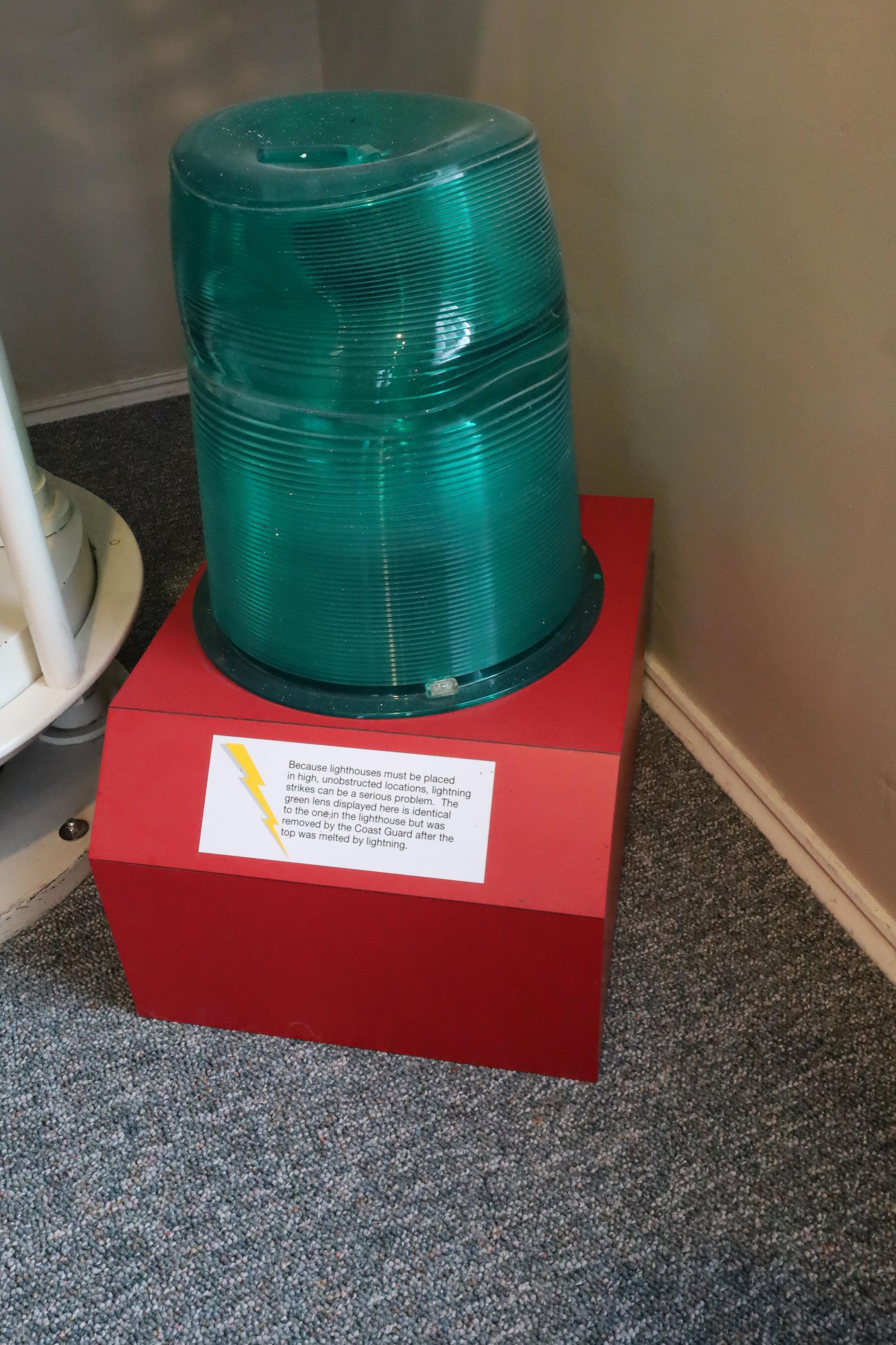 This green plastic lighthouse lens is identical to the one in the Marblehead Lighthouse. However, the Coast Guard removed this lens after the top was struck by lightning and melted. Because lighthouses must be placed in high, unobstructed locations, lightning strikes can be a severe problem that can damage the lens.