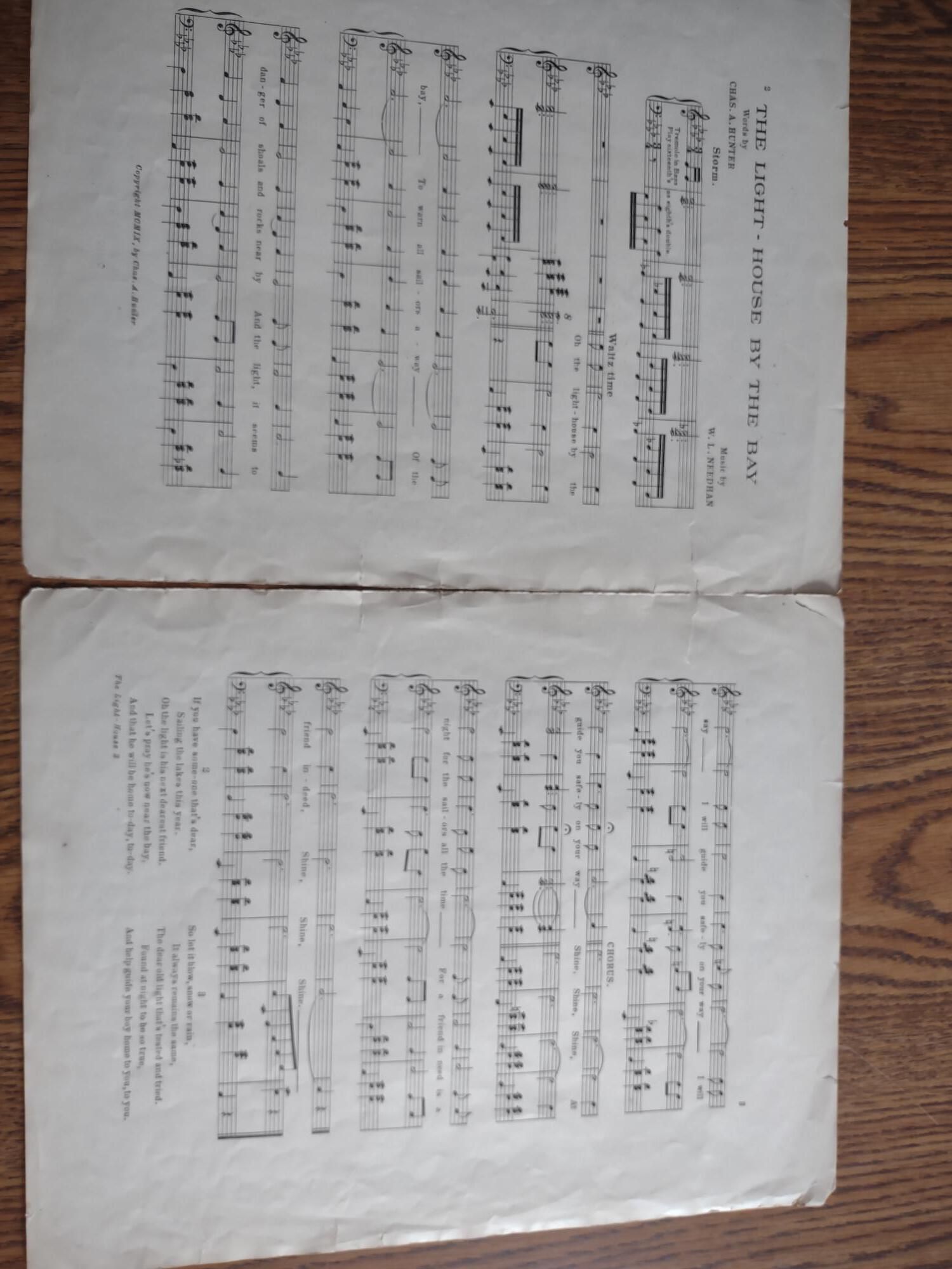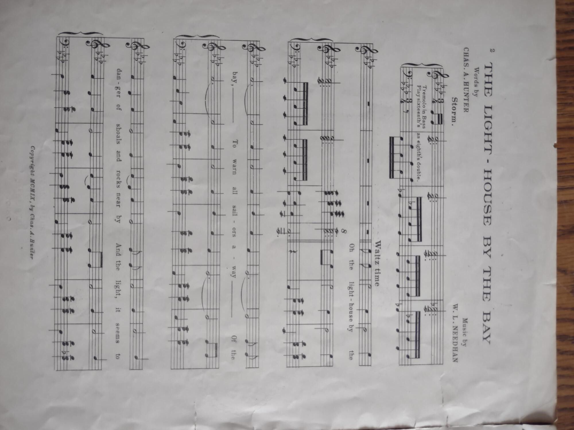 The Lighthouse by the Bay music, written in 1909, "Words by Chas A Hunter", and "Music by W. L. Needhan". Charles A. Hunter published the song. The words were a tribute to the Lighthouse and how it warned and safely guided sailors through the waters with its shining light.