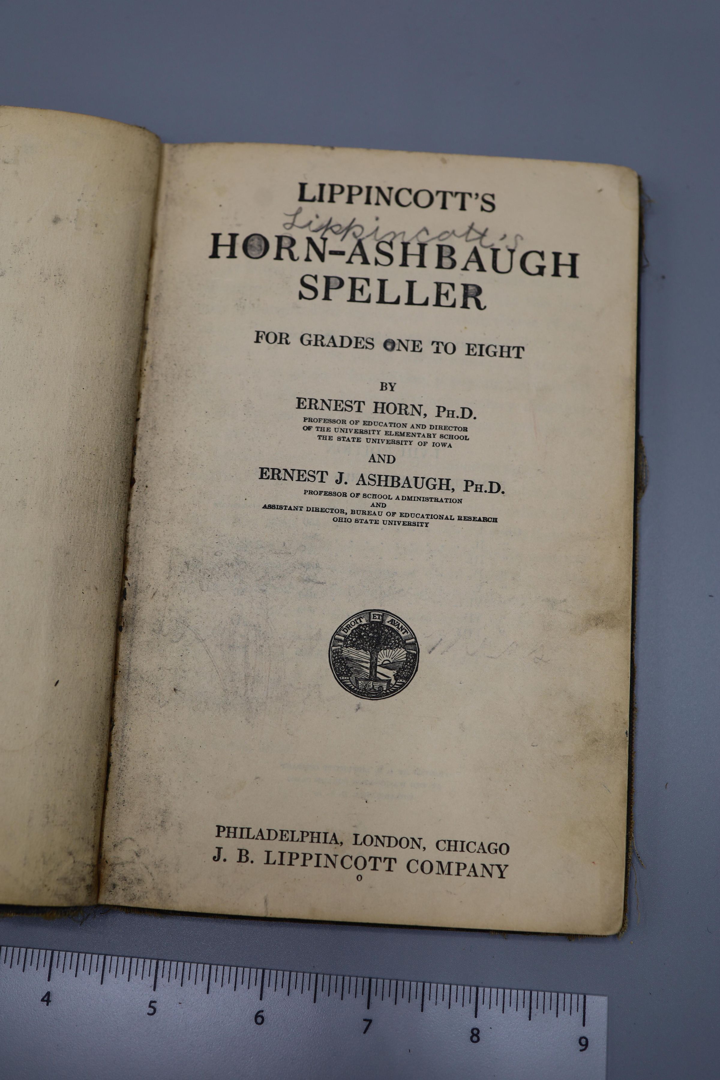 Lippincott's Horn-Ashbaugh Spelling Book, Grade 1-8, JB Lippincott Co, Copyright 1920. Numerous doodles and graffiti in the front end pages.Location