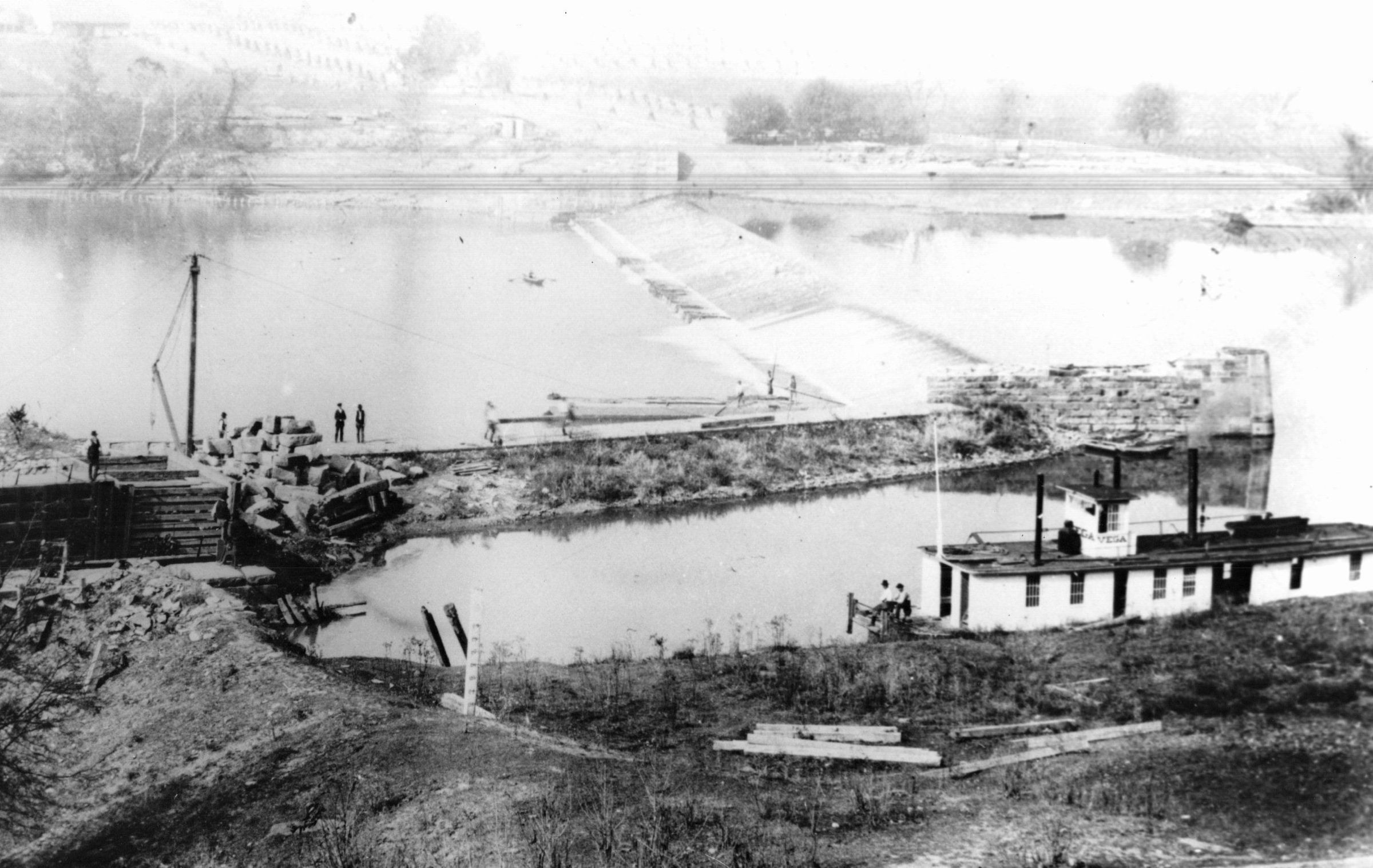 Lock #4 on the Muskingum River near the town of Beverly. In this photograph's foreground, a steamboat is docked near the entrance to the lock. People sit and stand in various places and gaze out over the river and surrounding farmland on what appears to be a summer day.