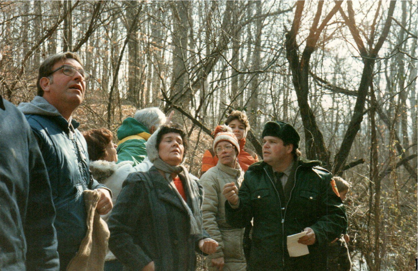 A park ranger explains something to a parkgoer as the crowd of visitors look up--perhaps to a bird, leaf, or some aspect of a tree. This guided hike was part of East Fork State Park's 1987 Winter Campout.Cataloged By
