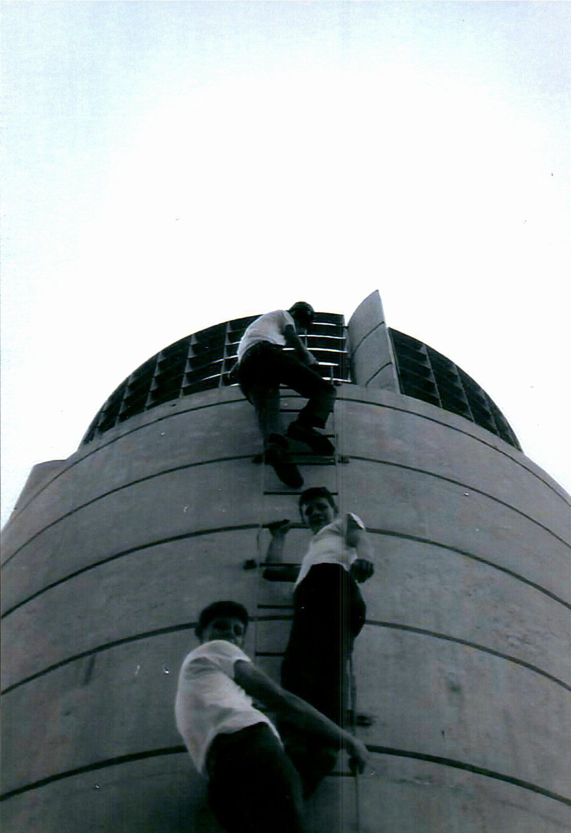 Three young men (potentially construction workers) pose for a picture on the ladder leading to the top of the lake's new intake or outlet tower.