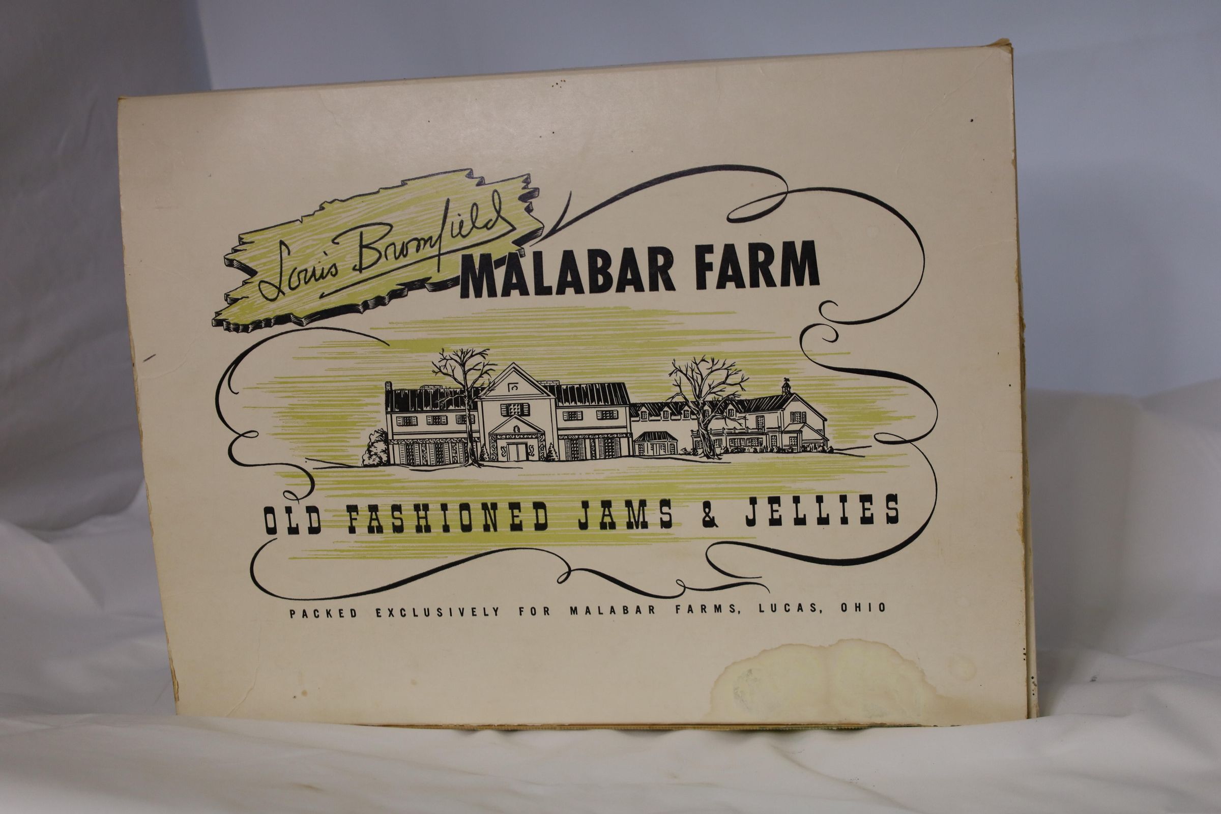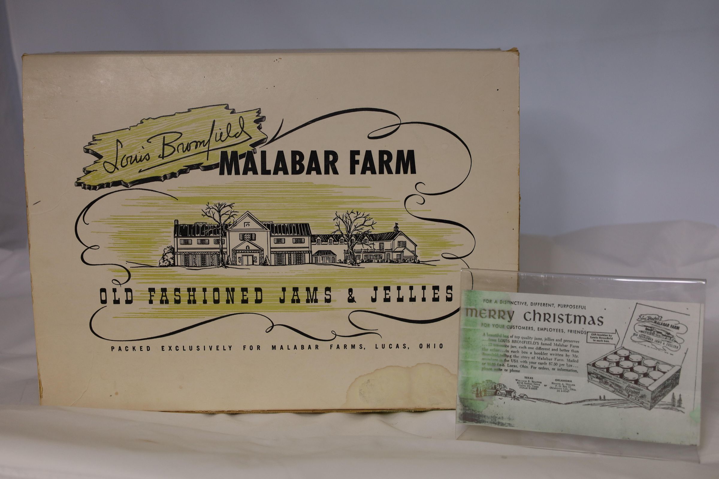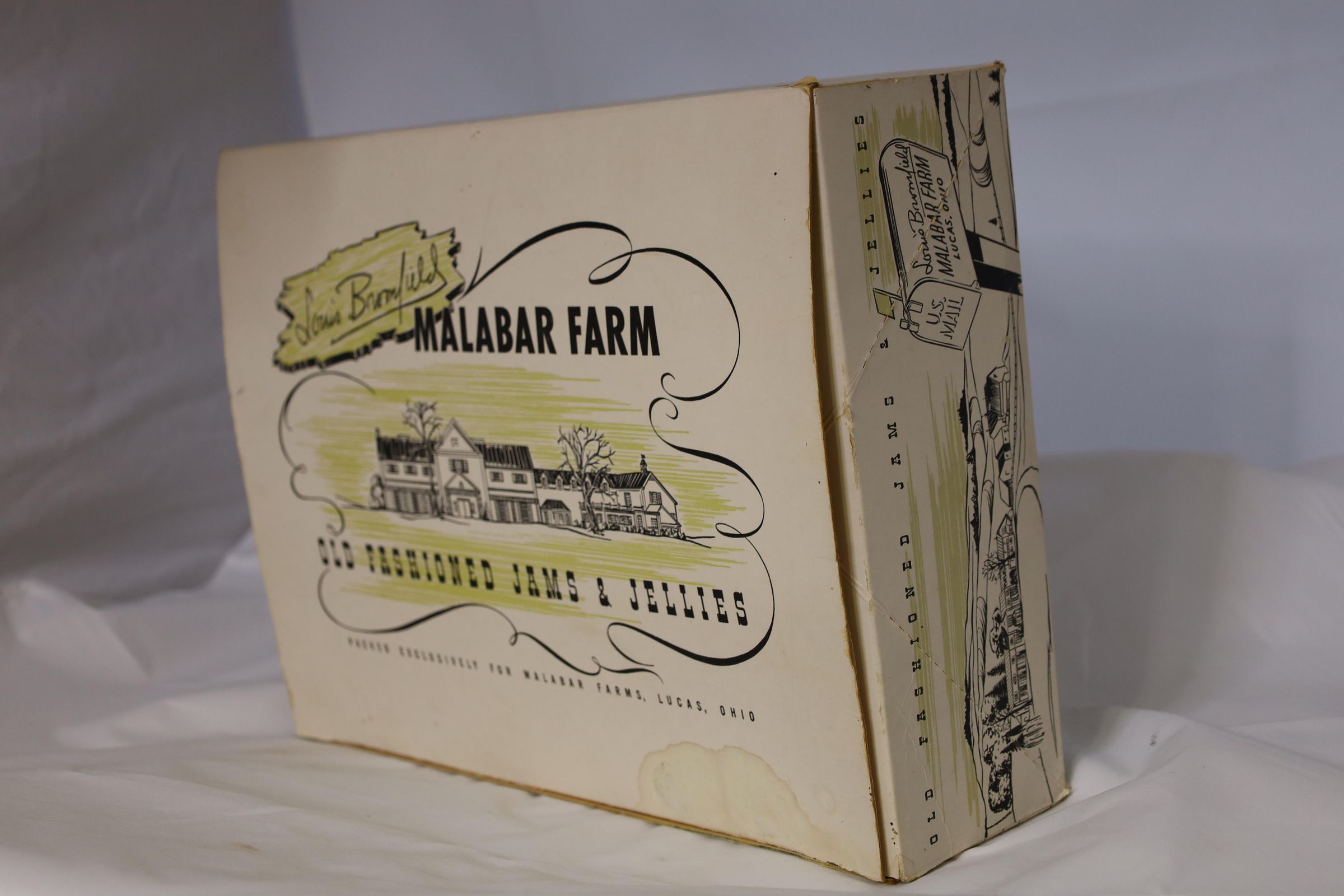 The box pictured here contained twelve 10 ounce jars of jam and jelly. With the box, Malabar Farm shows a copy of an advertisement for the jams. It reads:
