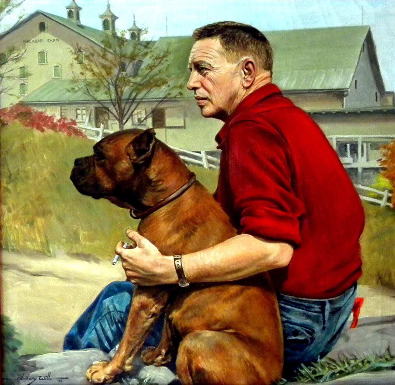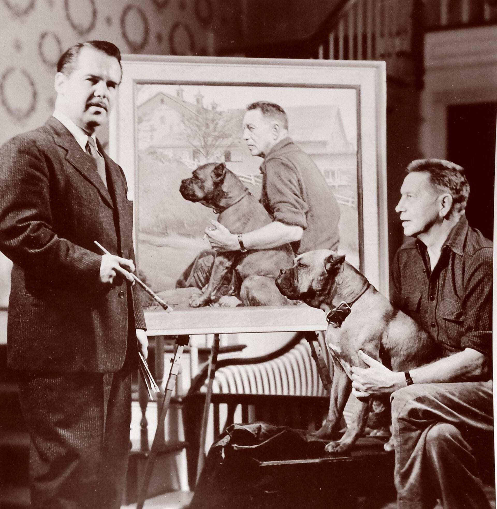 Wills always painted in oils and rarely painted on canvas, preferring Masonite, which he said was more durable. However, this portrait of Louis Bromfield, which includes his favorite boxer Prince, was painted on canvas.