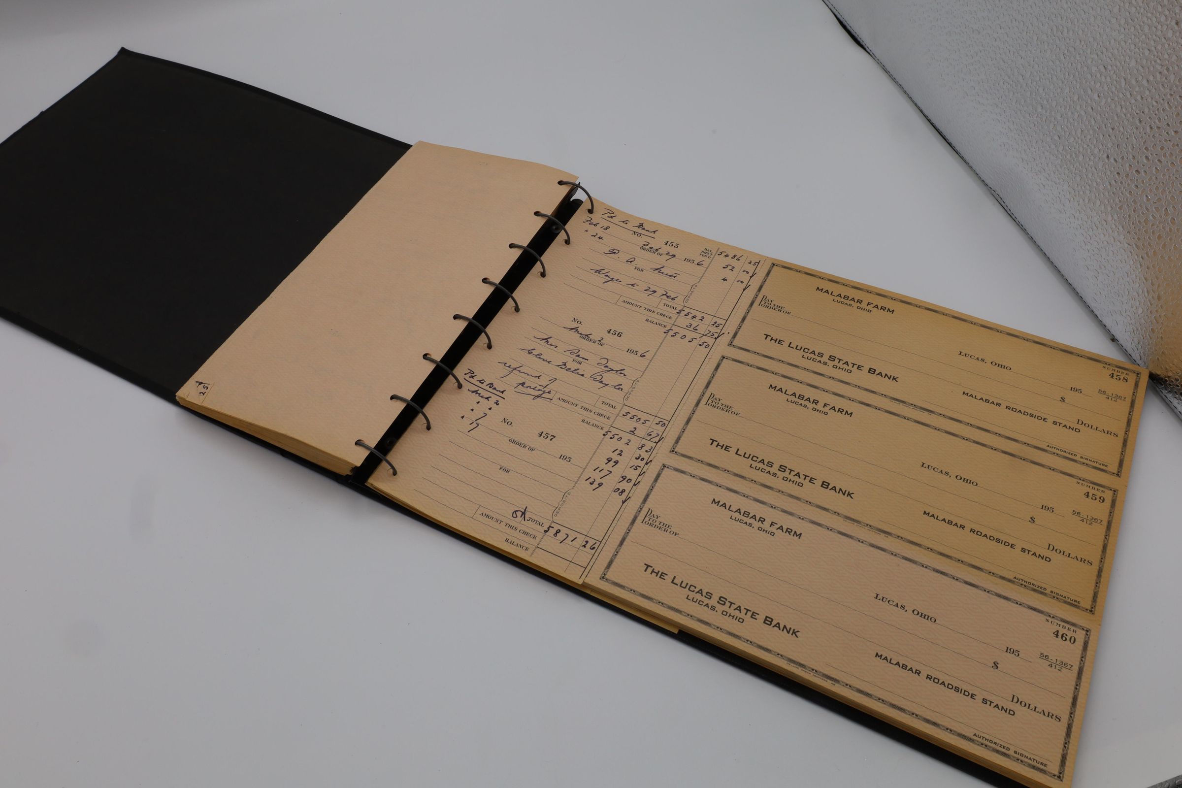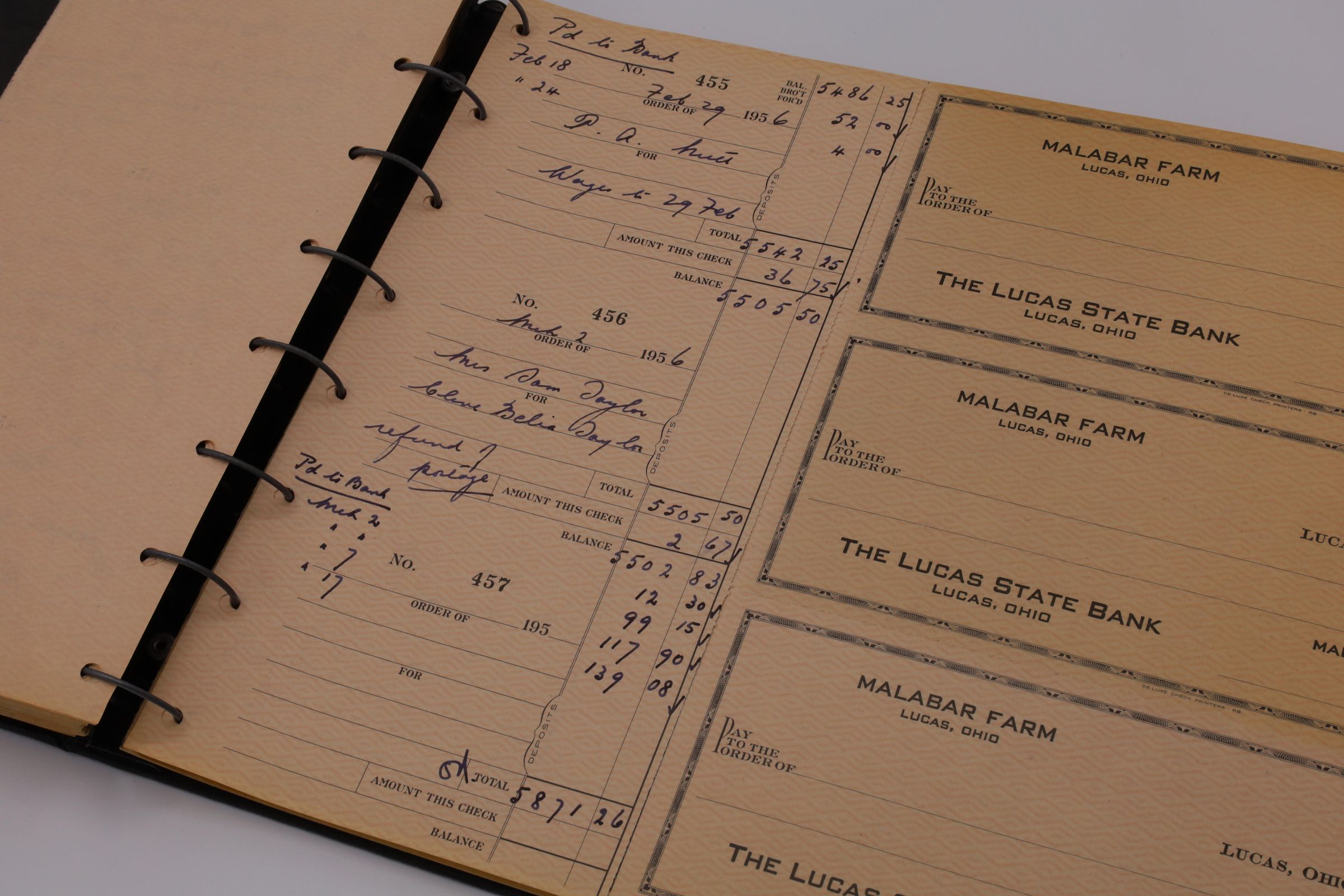 Malabar Farm's checkbook register belonging to Louis Bromfield from 1954 to 1956. The last written entry was for $5871.26 and is dated March 2, 1956, 16 days before his death.Location