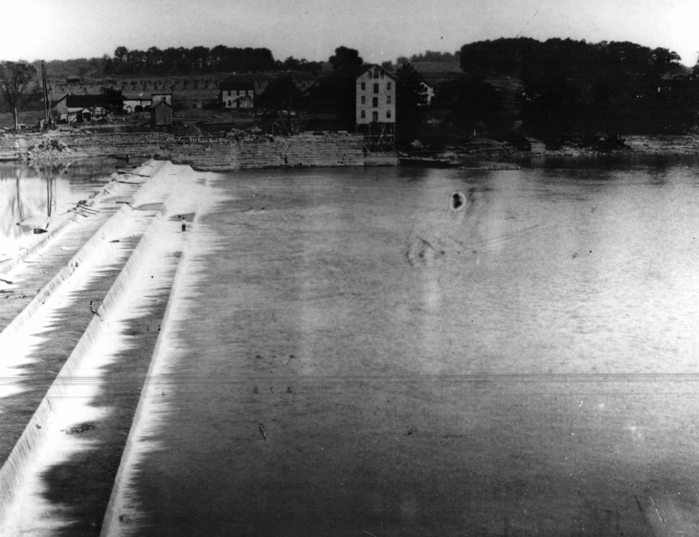 A low head dam on the Muskingum River. Toward the photograph's background there appears to be a lock for boats to navigate around the dam and/or a mill race to power a watermill.Cataloged By