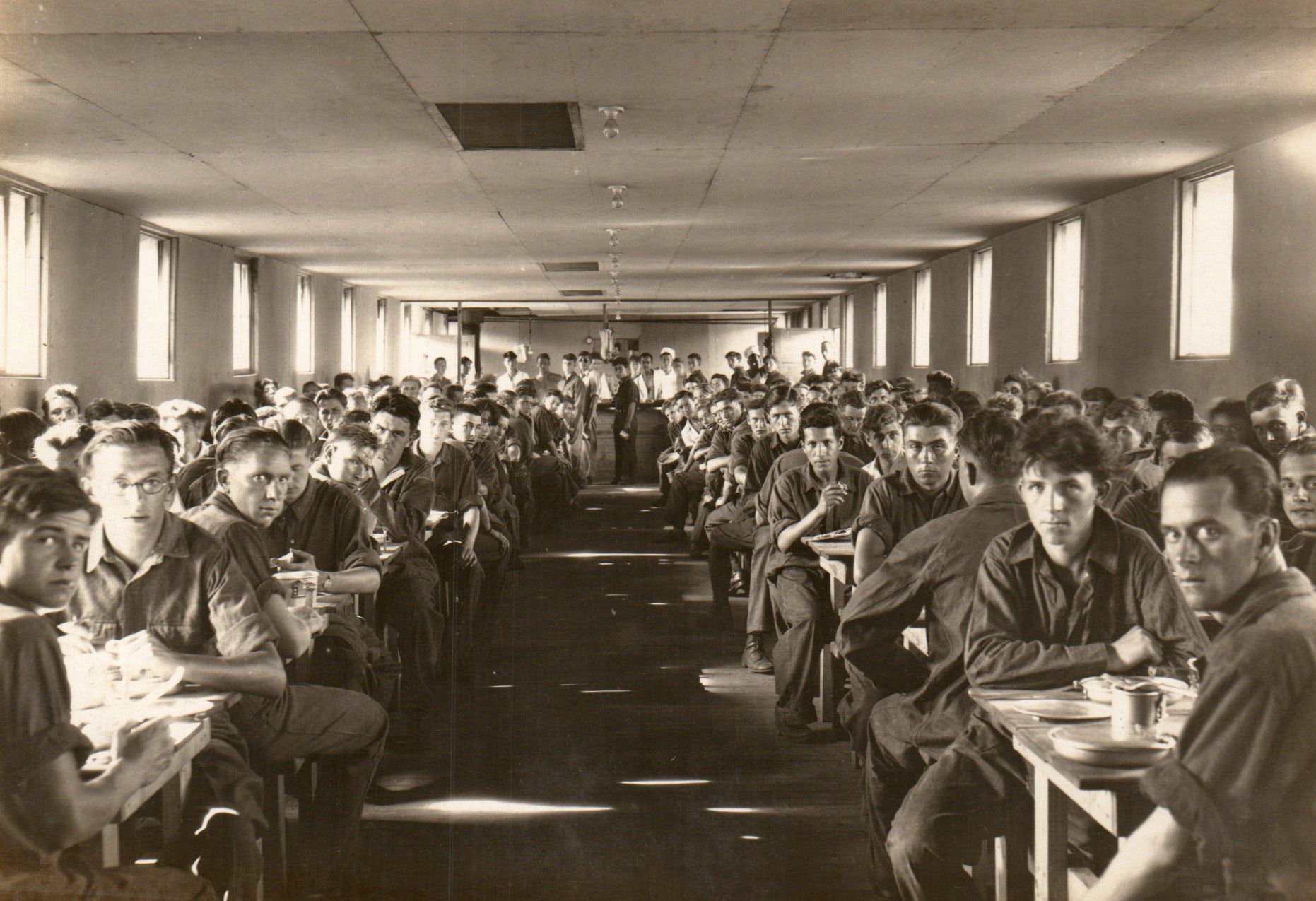 Civilian Conservation Corps (CCC) enrollees from Company 503 flood into Camp Pike's mess hall for lunch. Having grown up during the Great Depression, the CCC provided many young men with their first complete and balanced meals. In response, the average CCC worker gained between 8-14 pounds of weight and around 1 inch in height during their time served.
