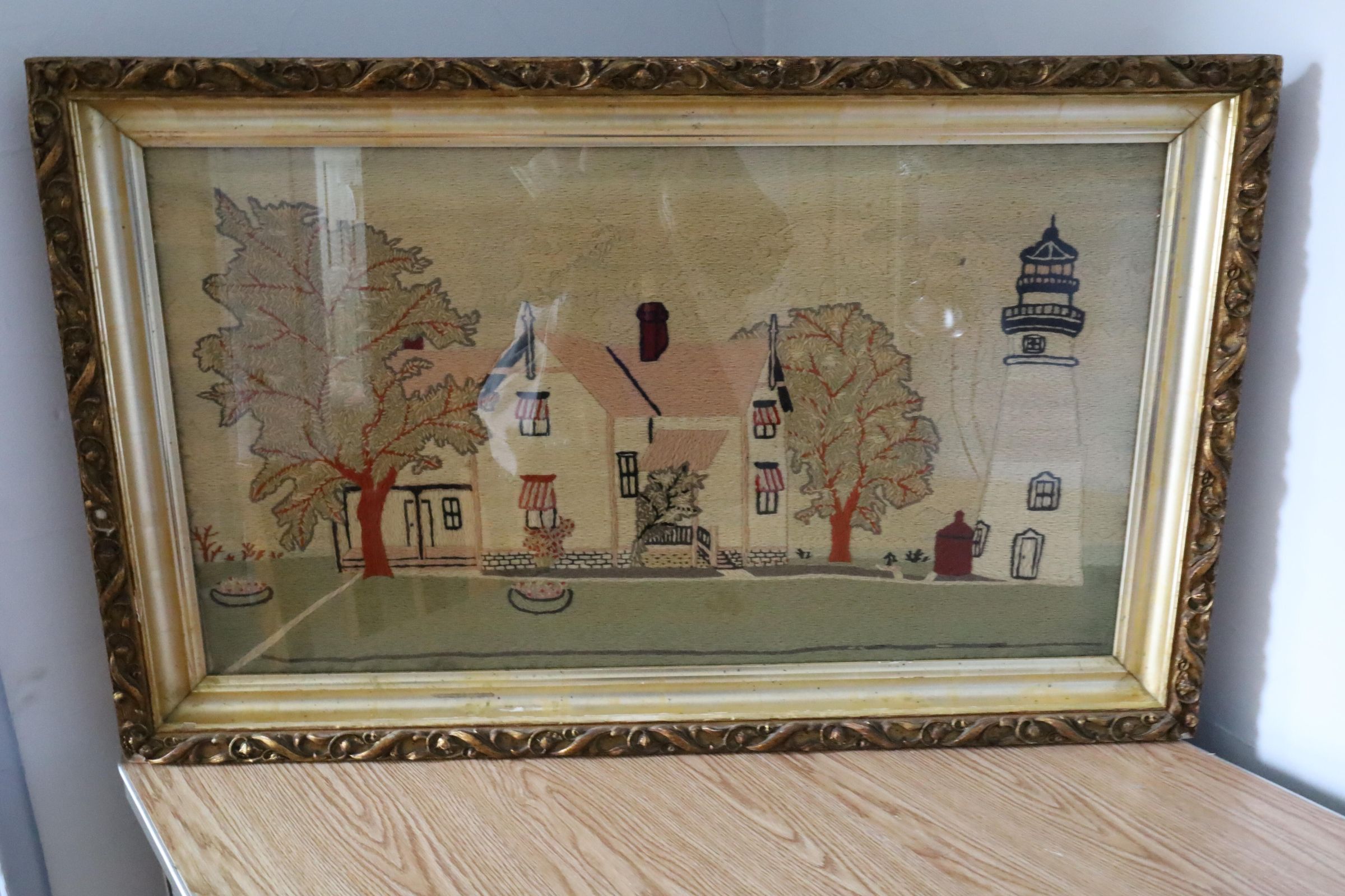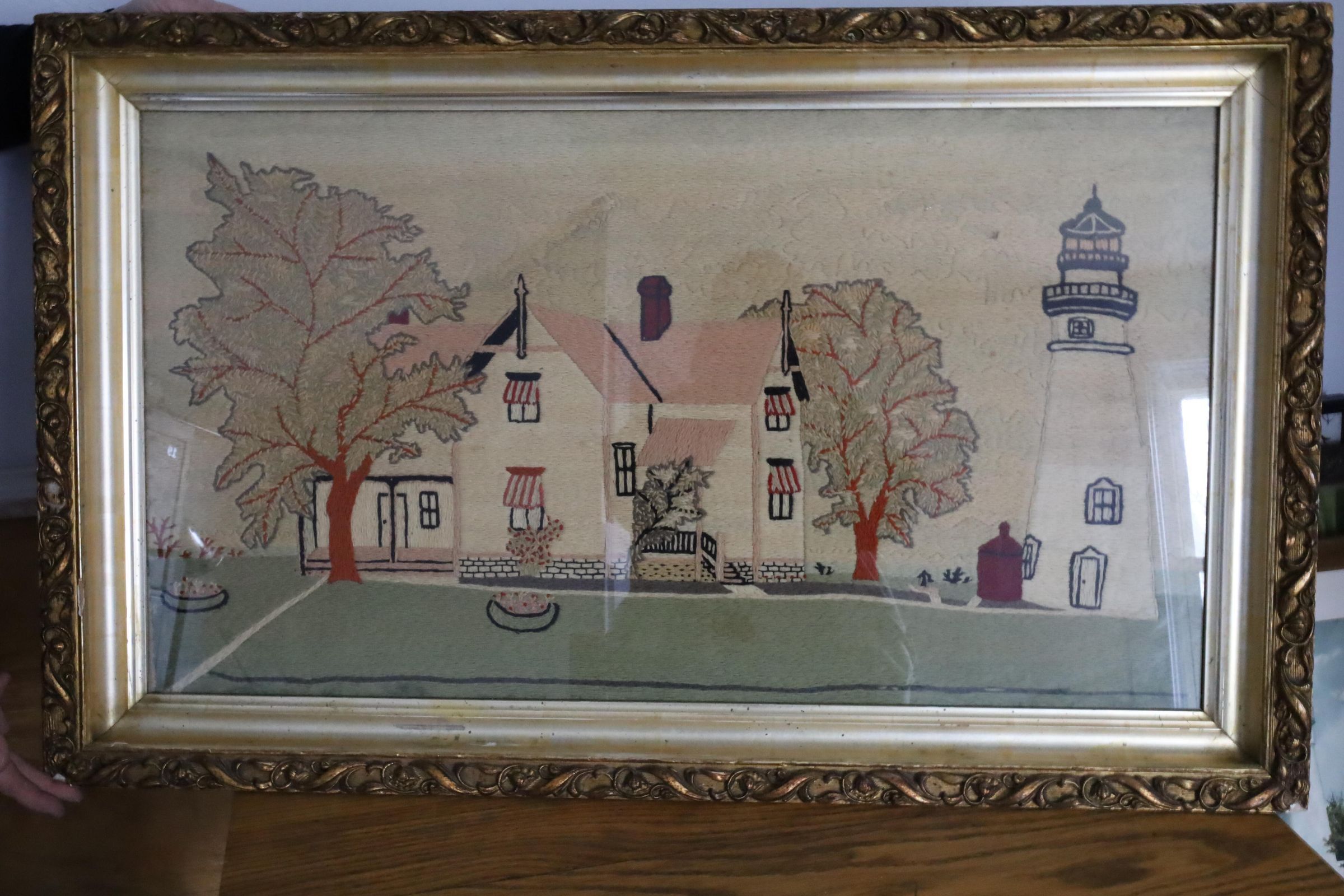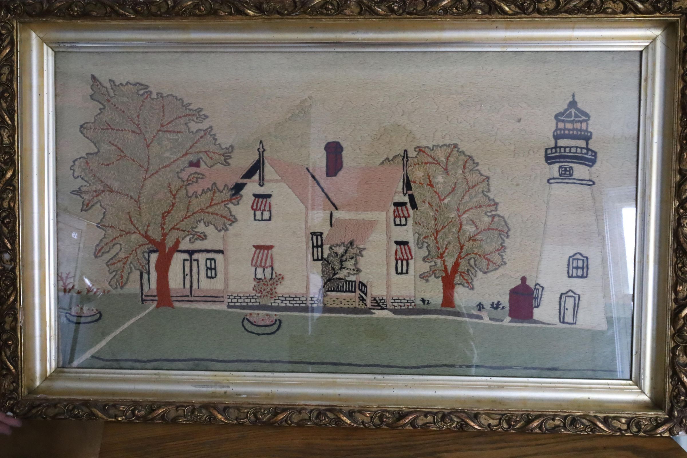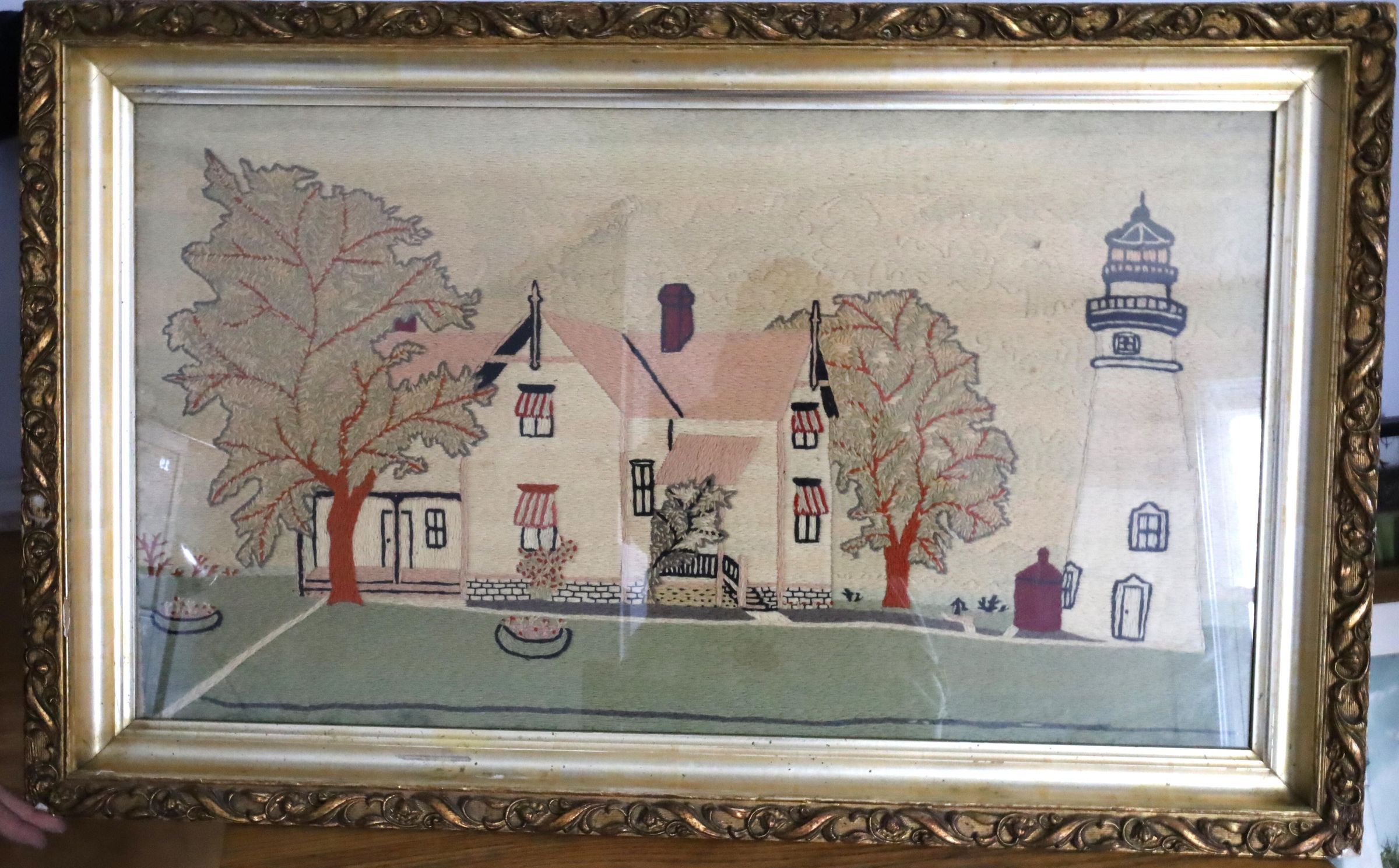 Lighthouse crewel embroidery by Charles Hunter. Charles Hunter was the Marblehead lighthouse keeper from 1903 to 1933 and is known to have the longest tenure as head keeper. Crewel work is a beautiful, traditional and ancient form of embroidery using wool to create a slightly raised feature on a linen twill fabric background.