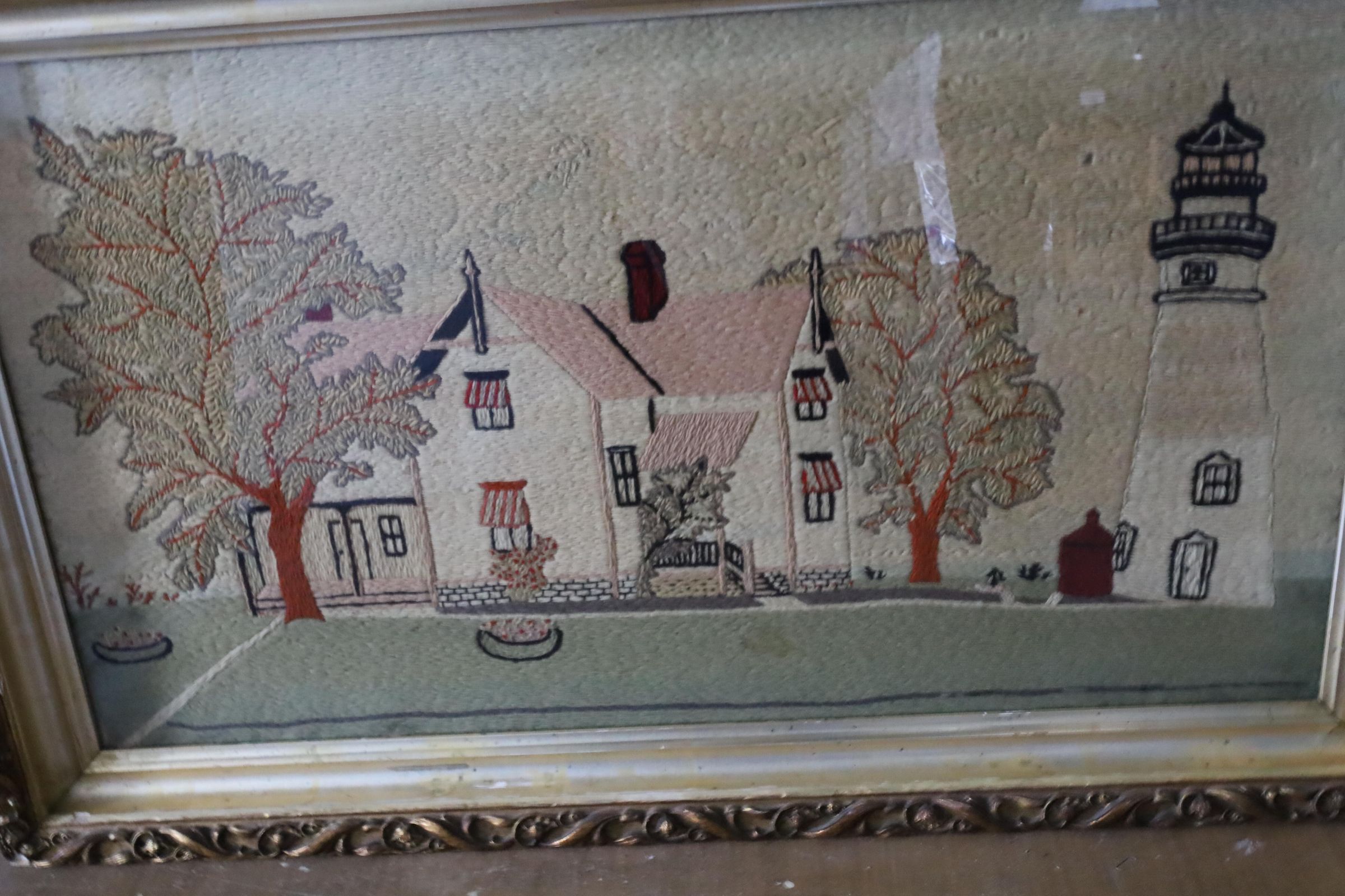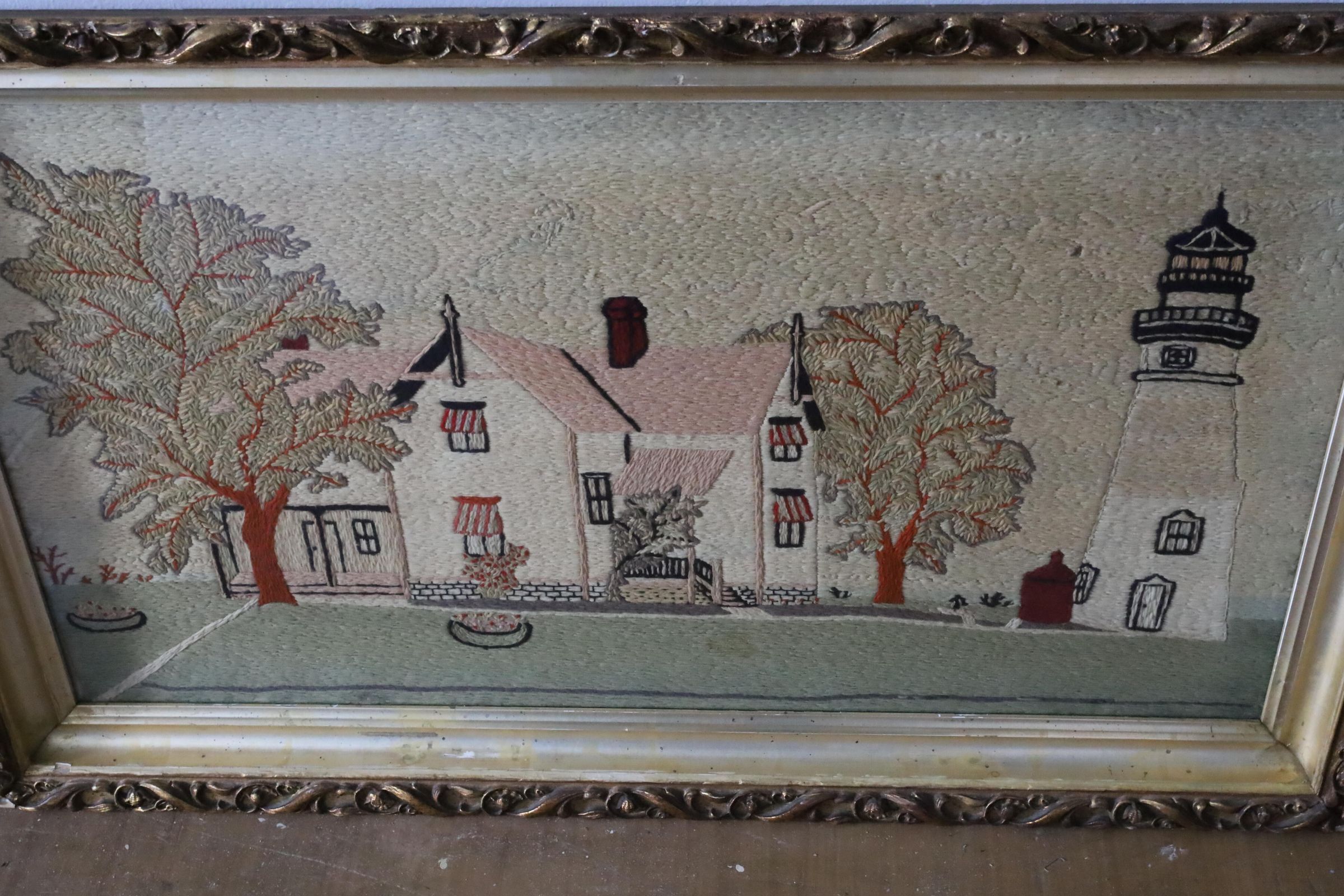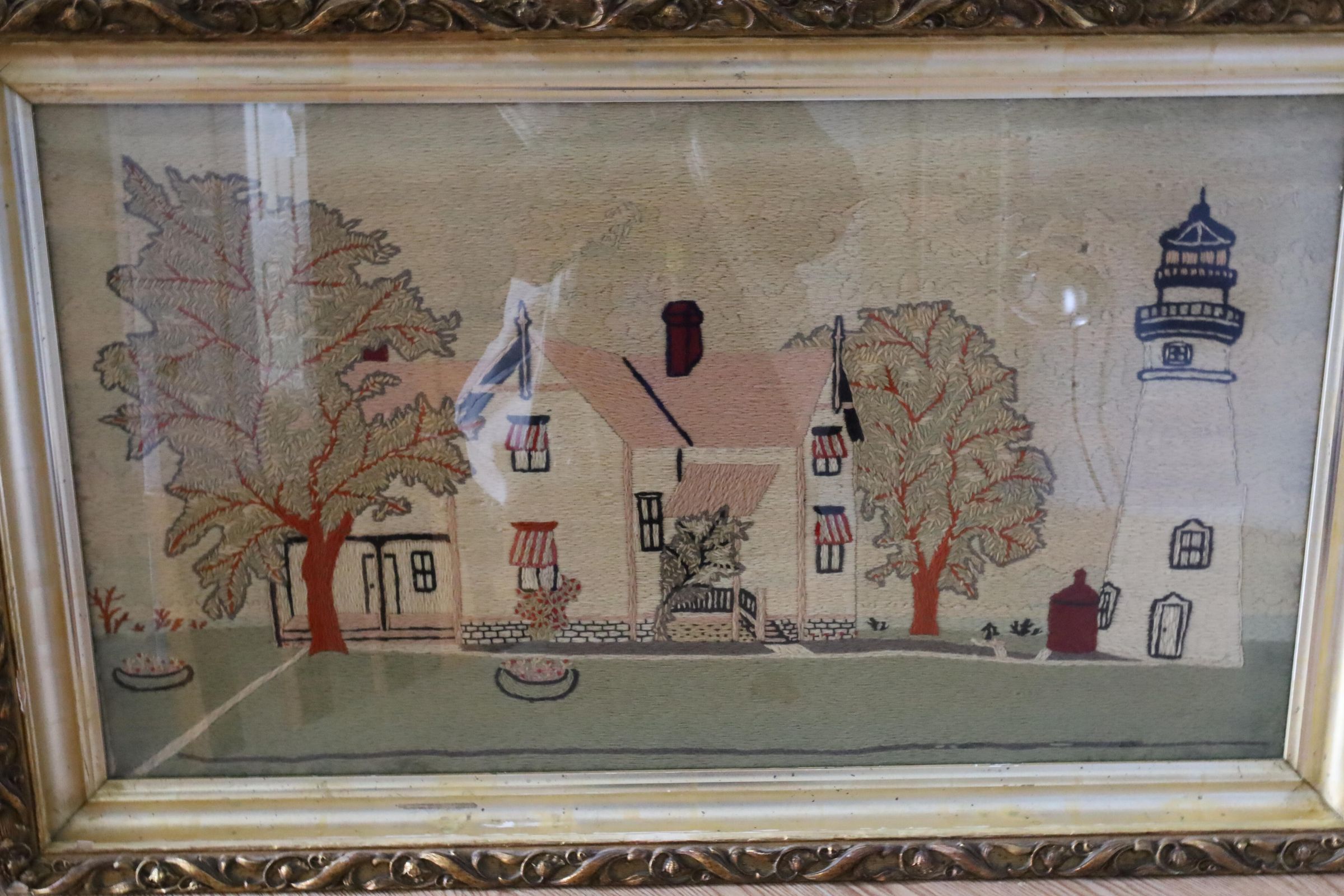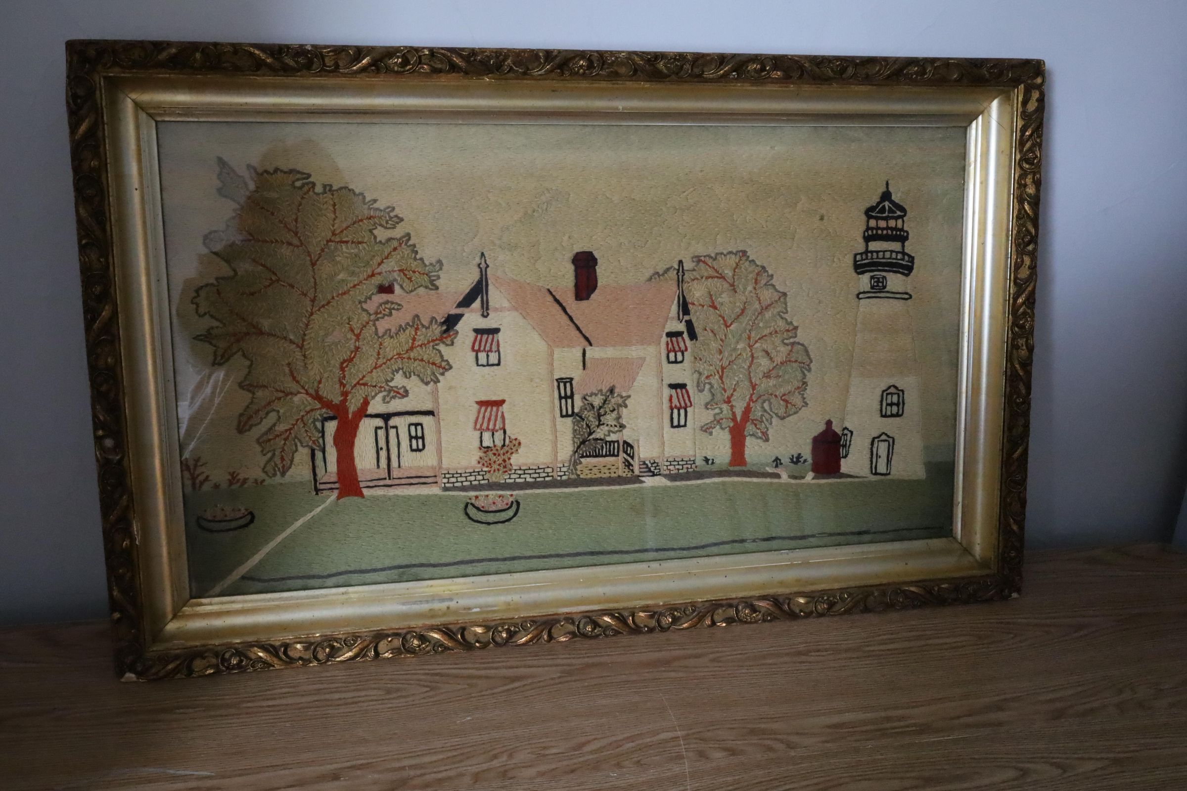 Lighthouse crewel embroidery by Charles Hunter. Charles Hunter was the Marblehead lighthouse keeper from 1903 to 1933 and is known to have the longest tenure as head keeper. Crewel work is a beautiful, traditional and ancient form of embroidery using wool to create a slightly raised feature on a linen twill fabric background.