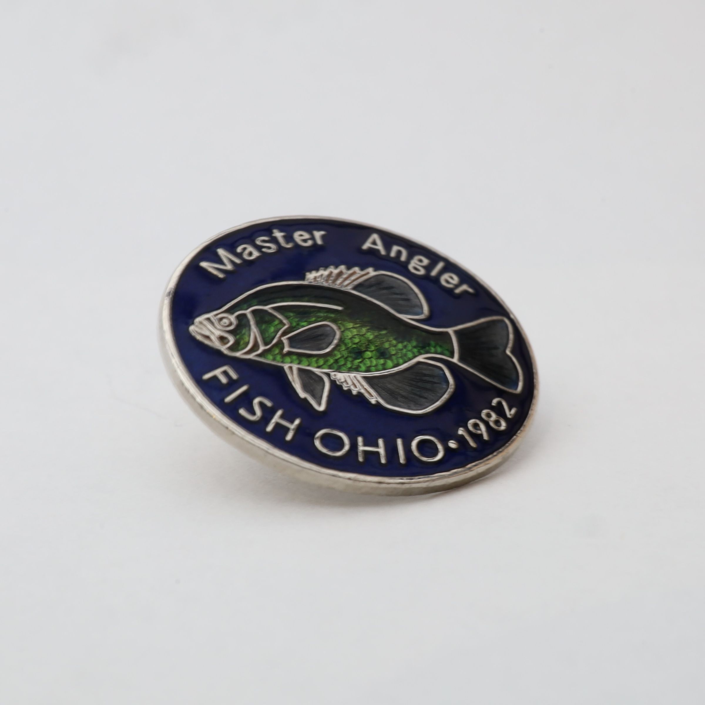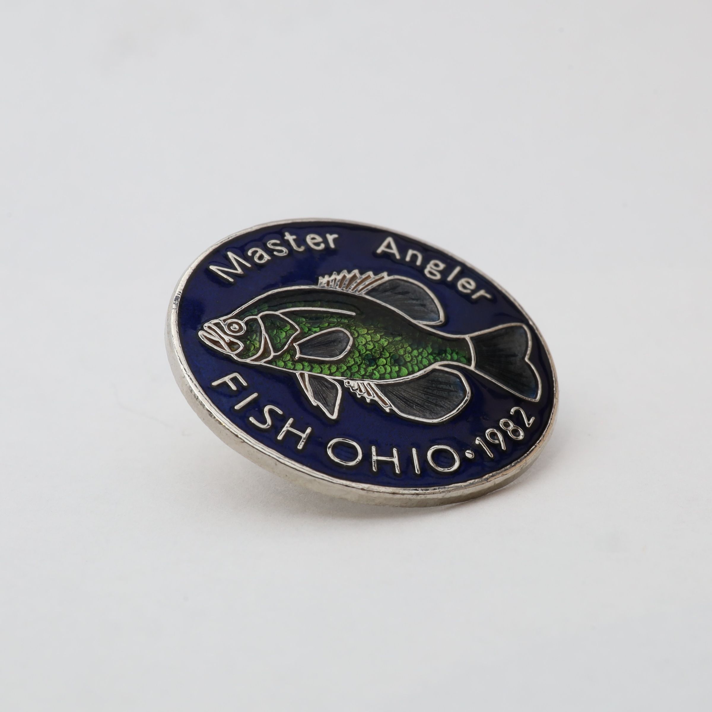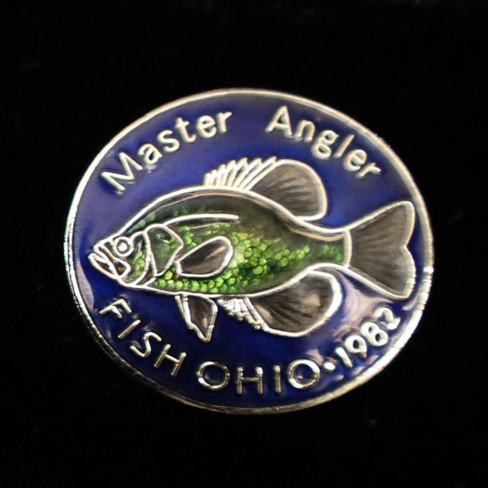 The 1982 Master Angler pin features a crappie. The pin is enameled with a dark blue background, a green scaled crappie, and the words Master Angler on the top border and Fish Ohio 1982 along the bottom border.