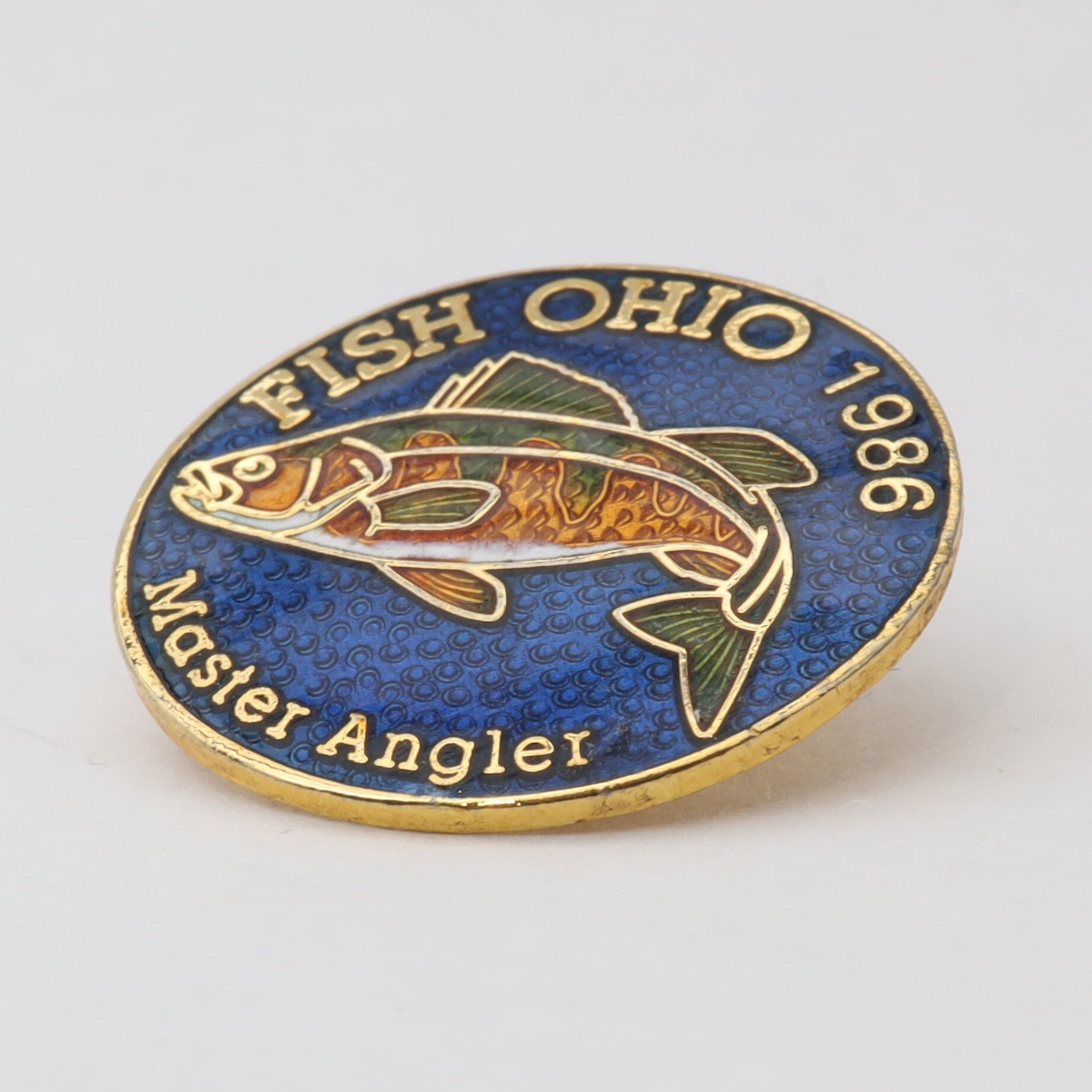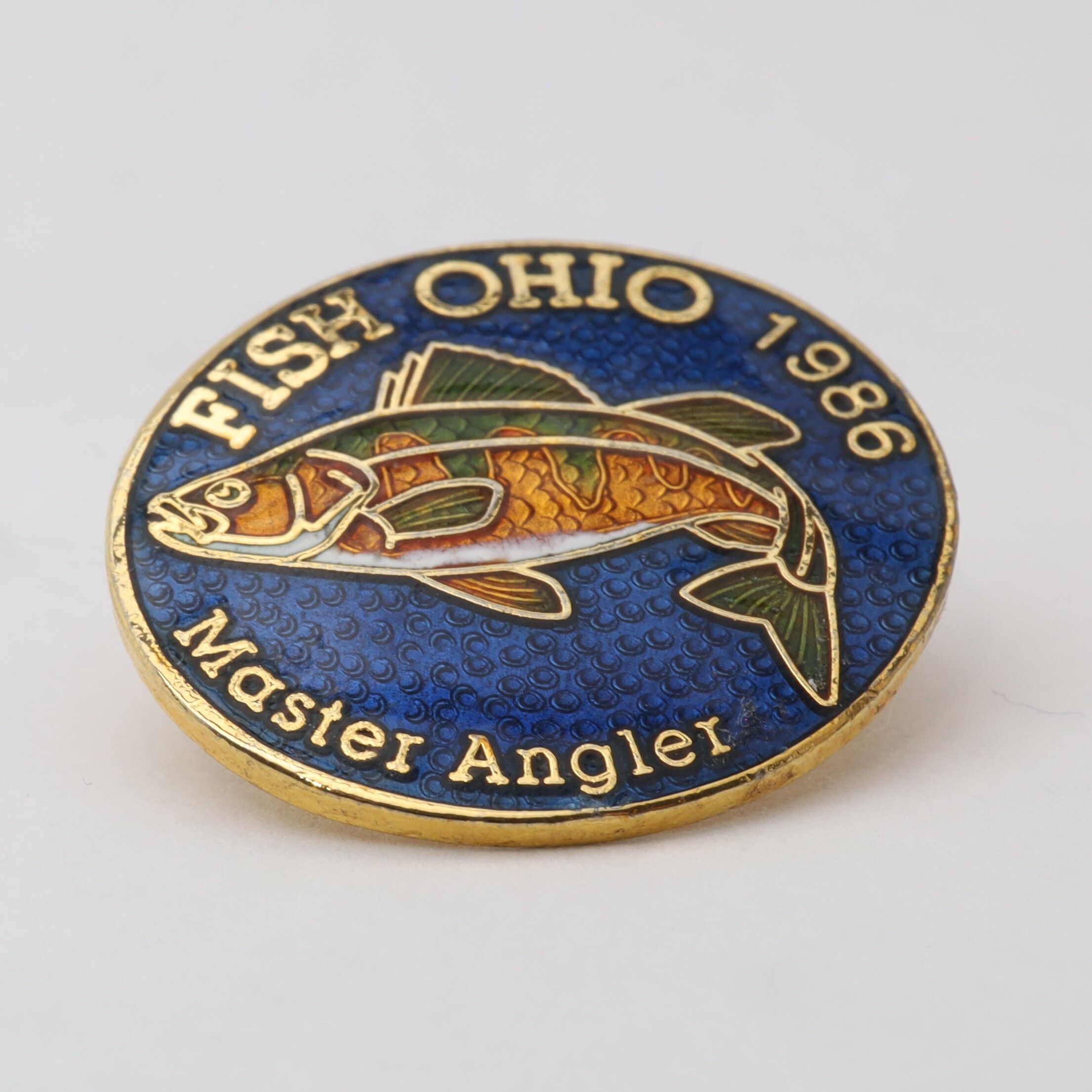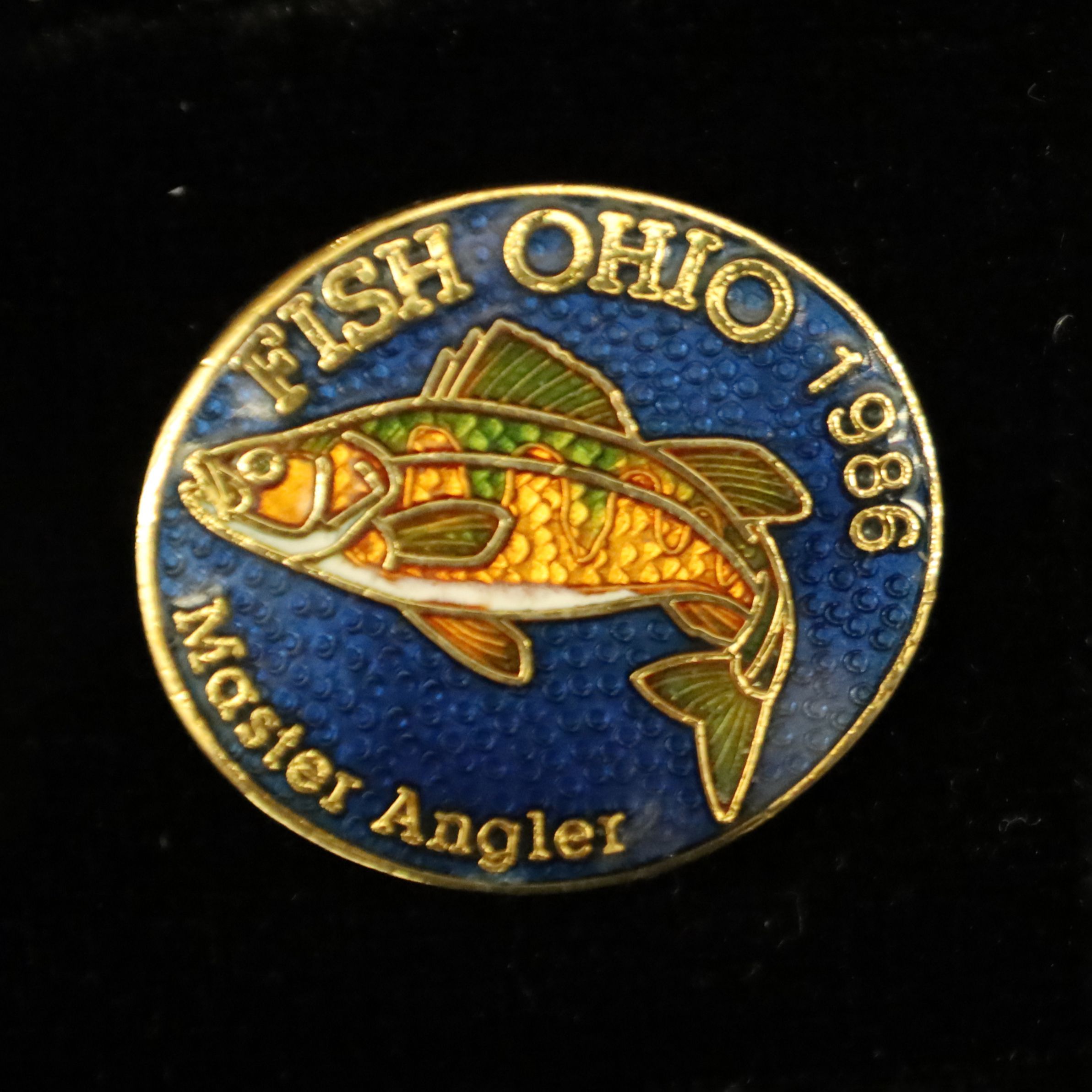 The 1986 Master Angler pin features a yellow perch. The perch has green and yellow scales with a thin line of white belly on a dark blue background. The words Fish Ohio, the date, and Master Angler are in gold around the border.Use