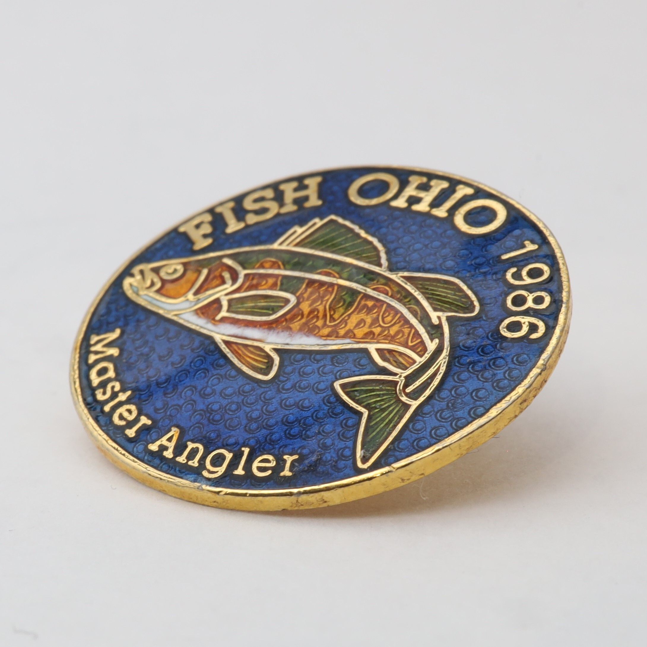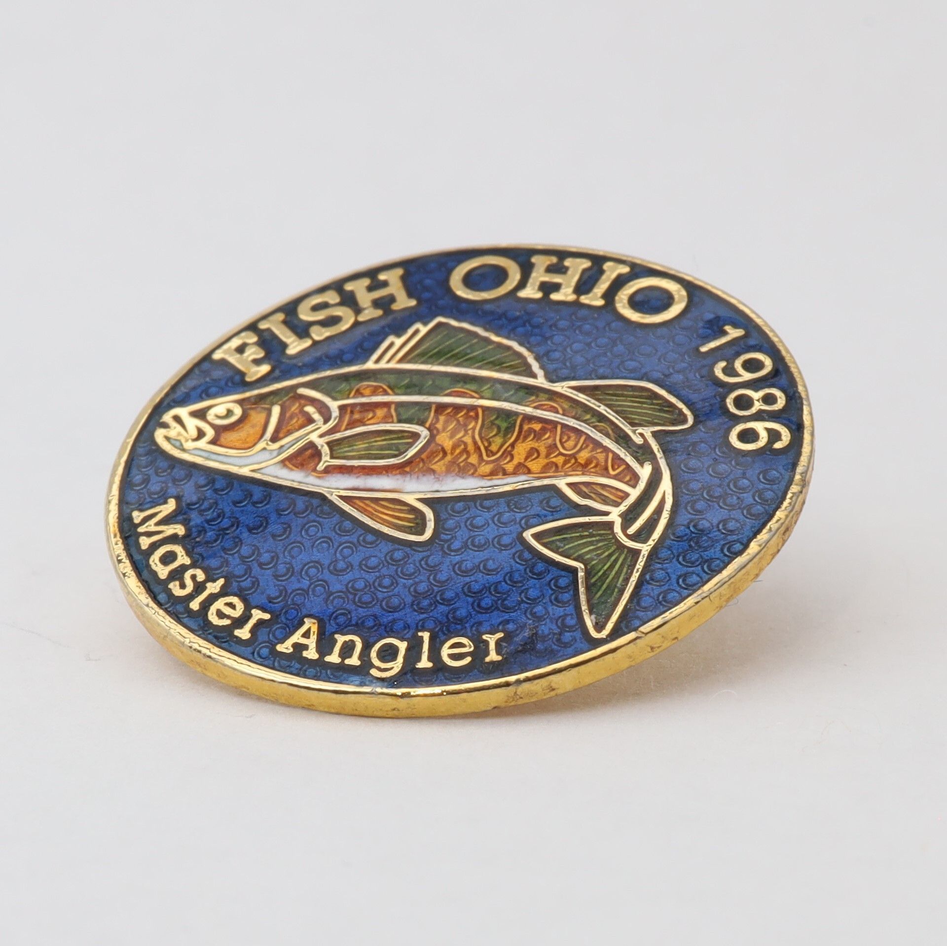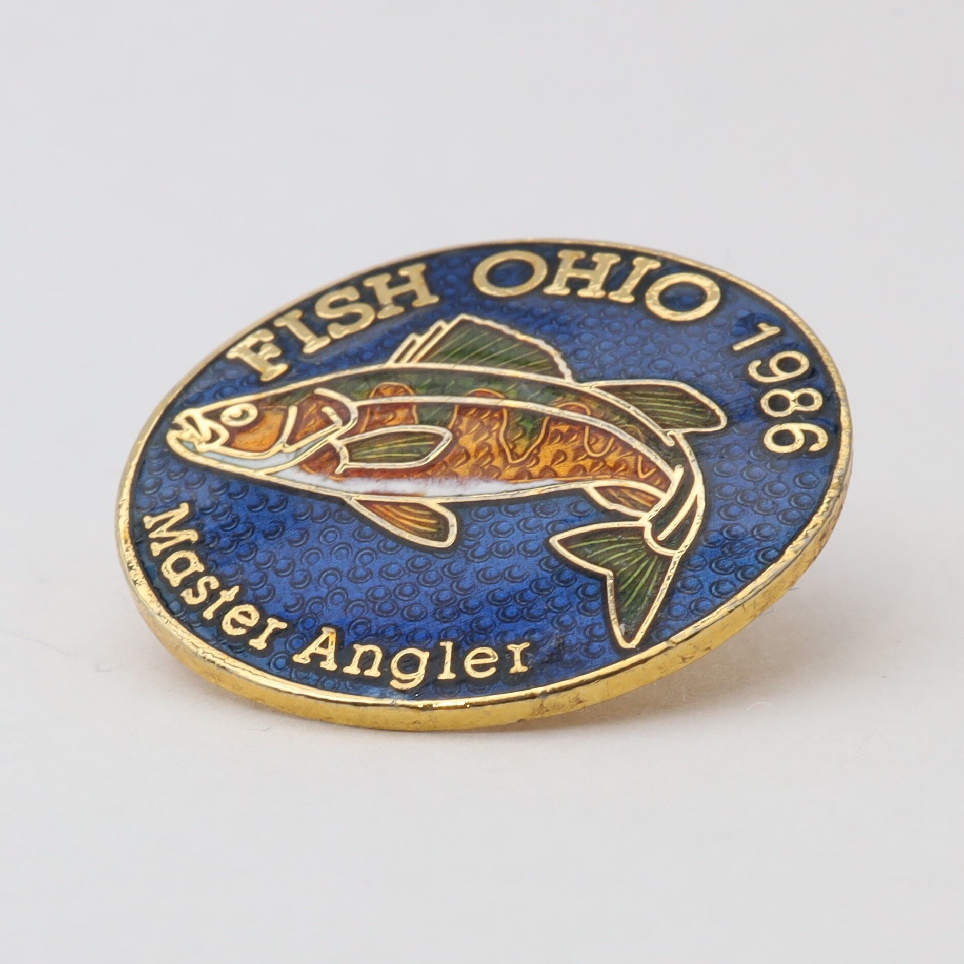 The 1986 Master Angler pin features a yellow perch. The perch has green and yellow scales with a thin line of white belly on a dark blue background. The words Fish Ohio, the date, and Master Angler are in gold around the border.Use