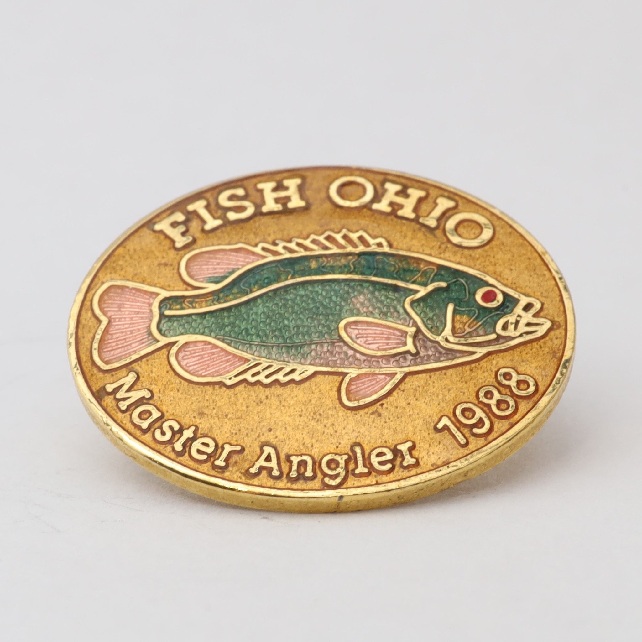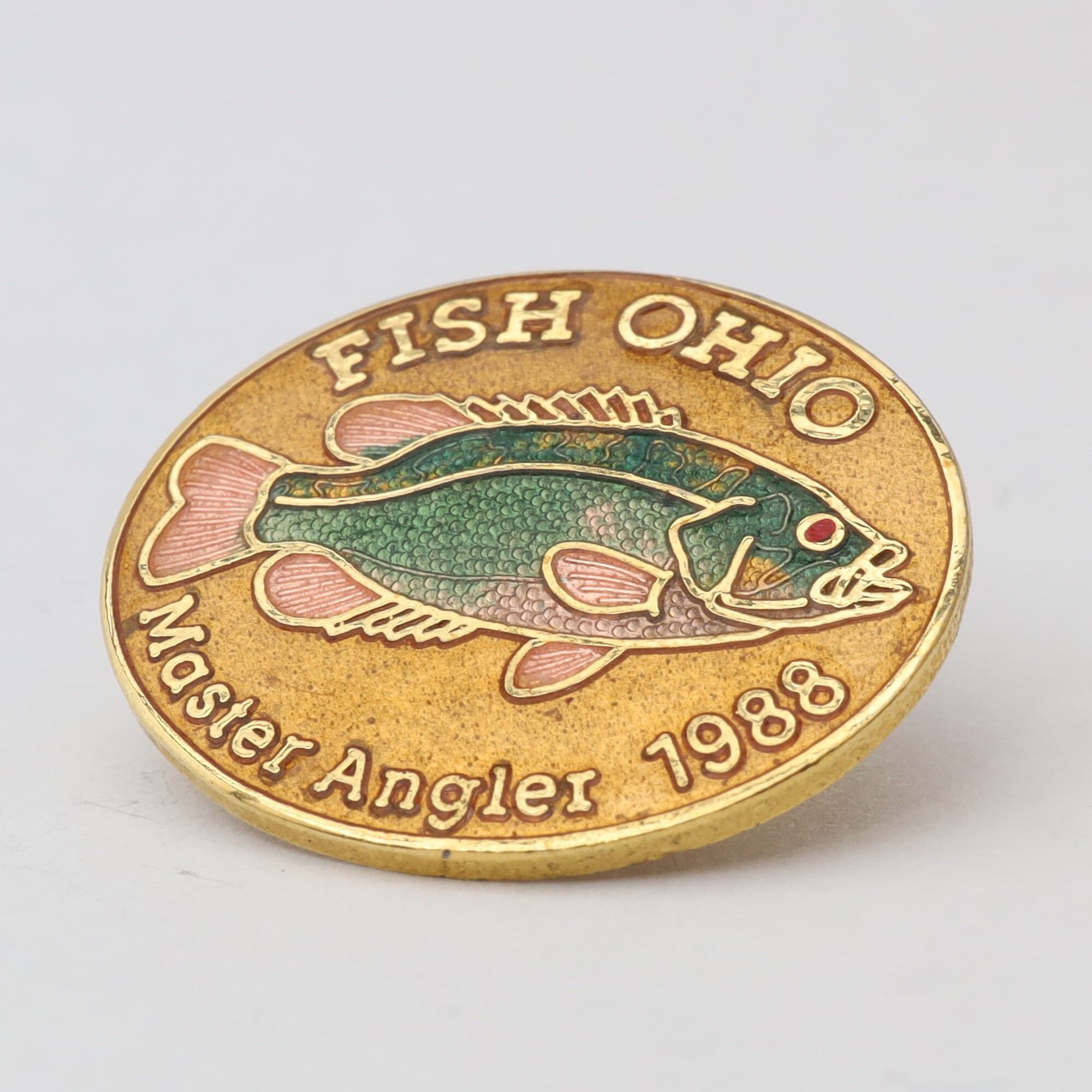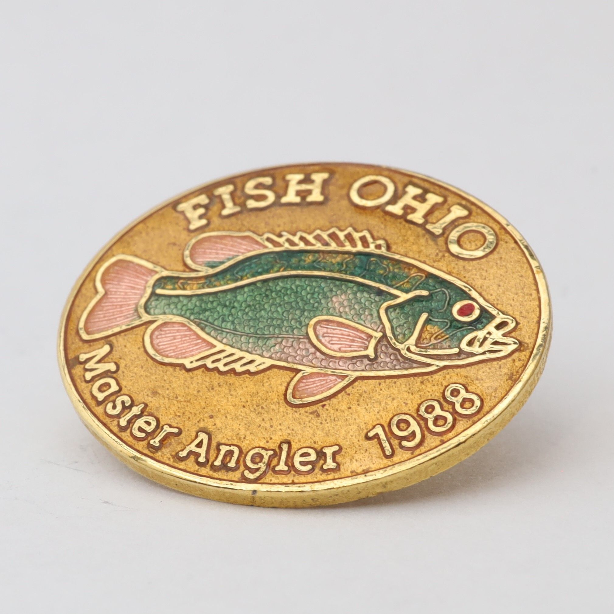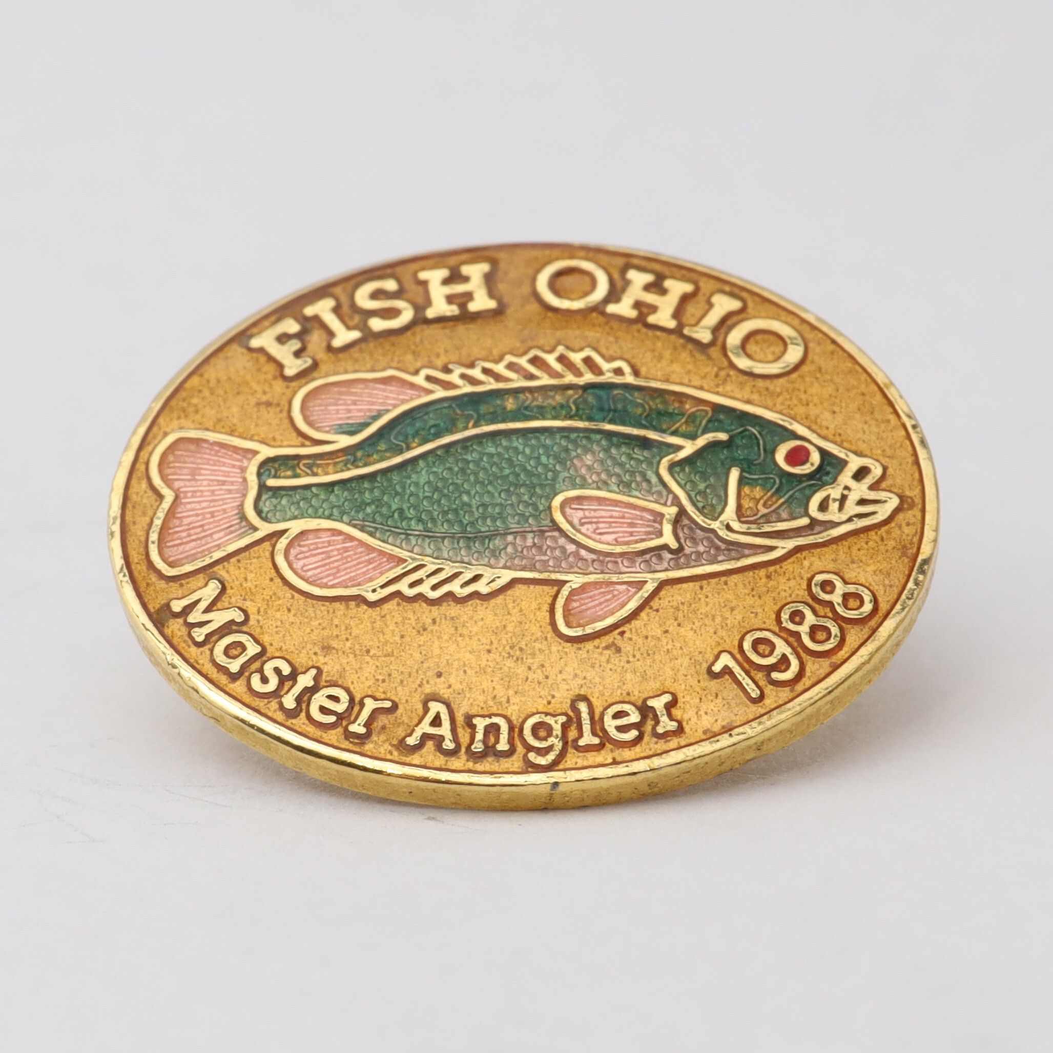 The 1988 Master Angler pin features a rock bass. The bass has green and yellow scales with peach fins and belly on a gold background. The words Fish Ohio, Master Angler, and the date are in gold around the edge.Use
