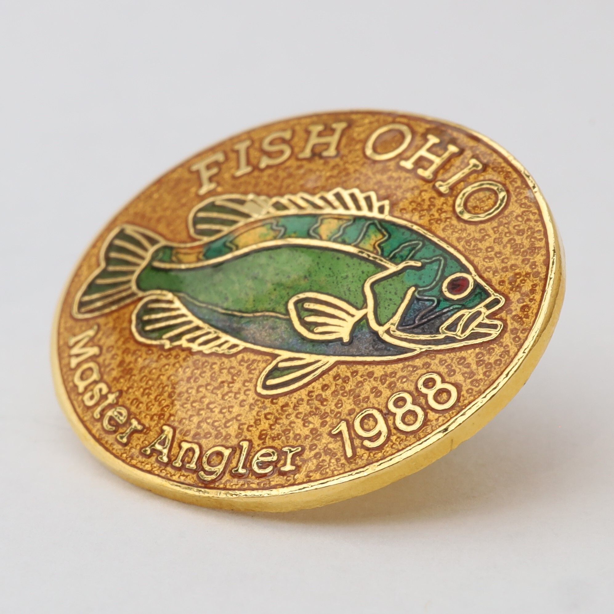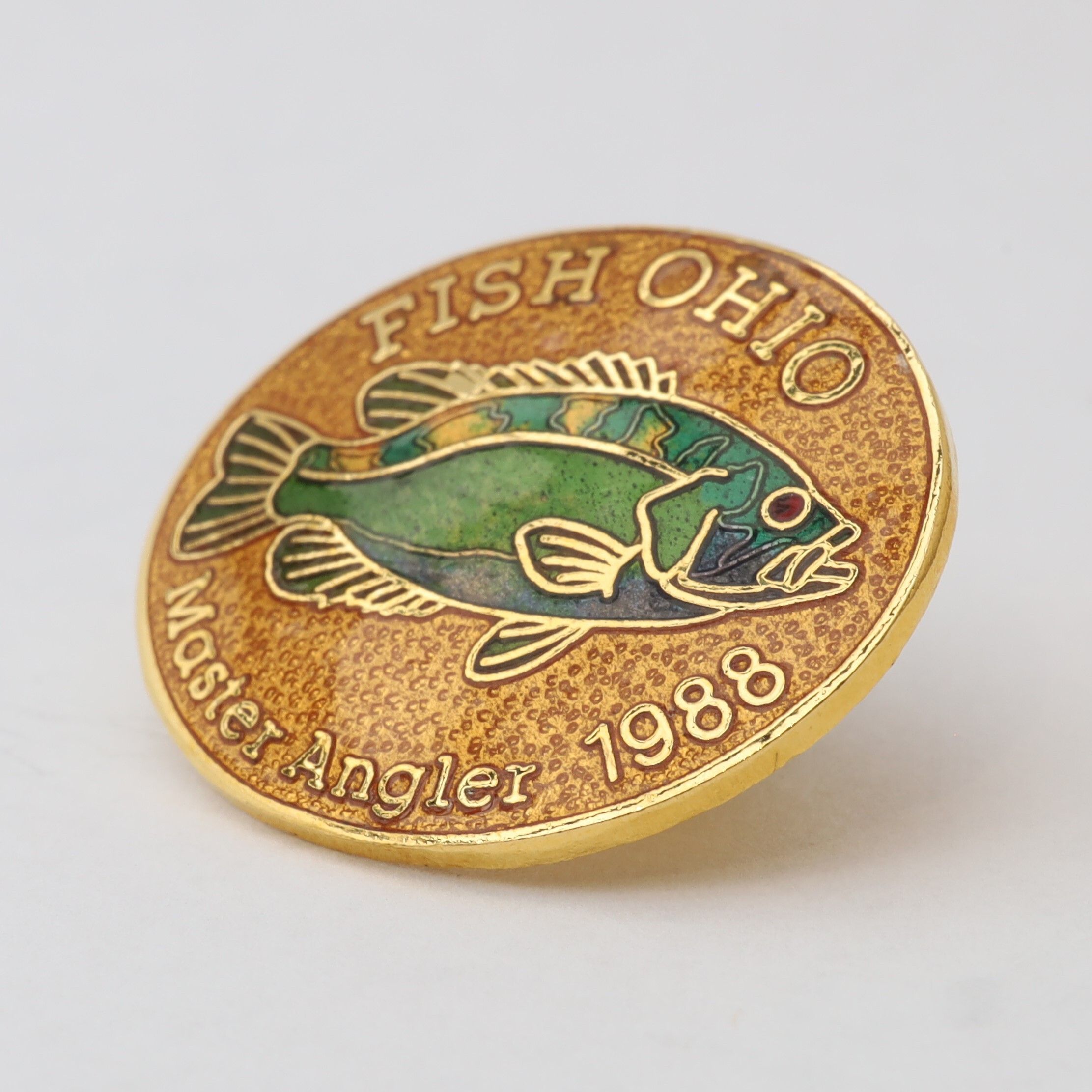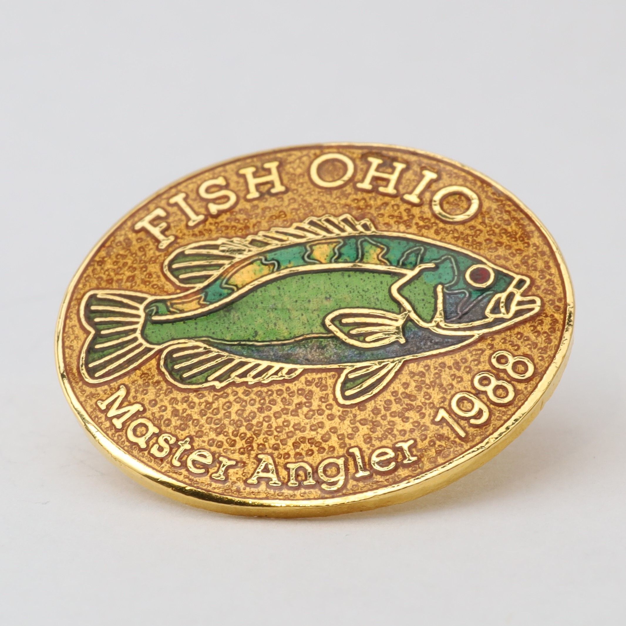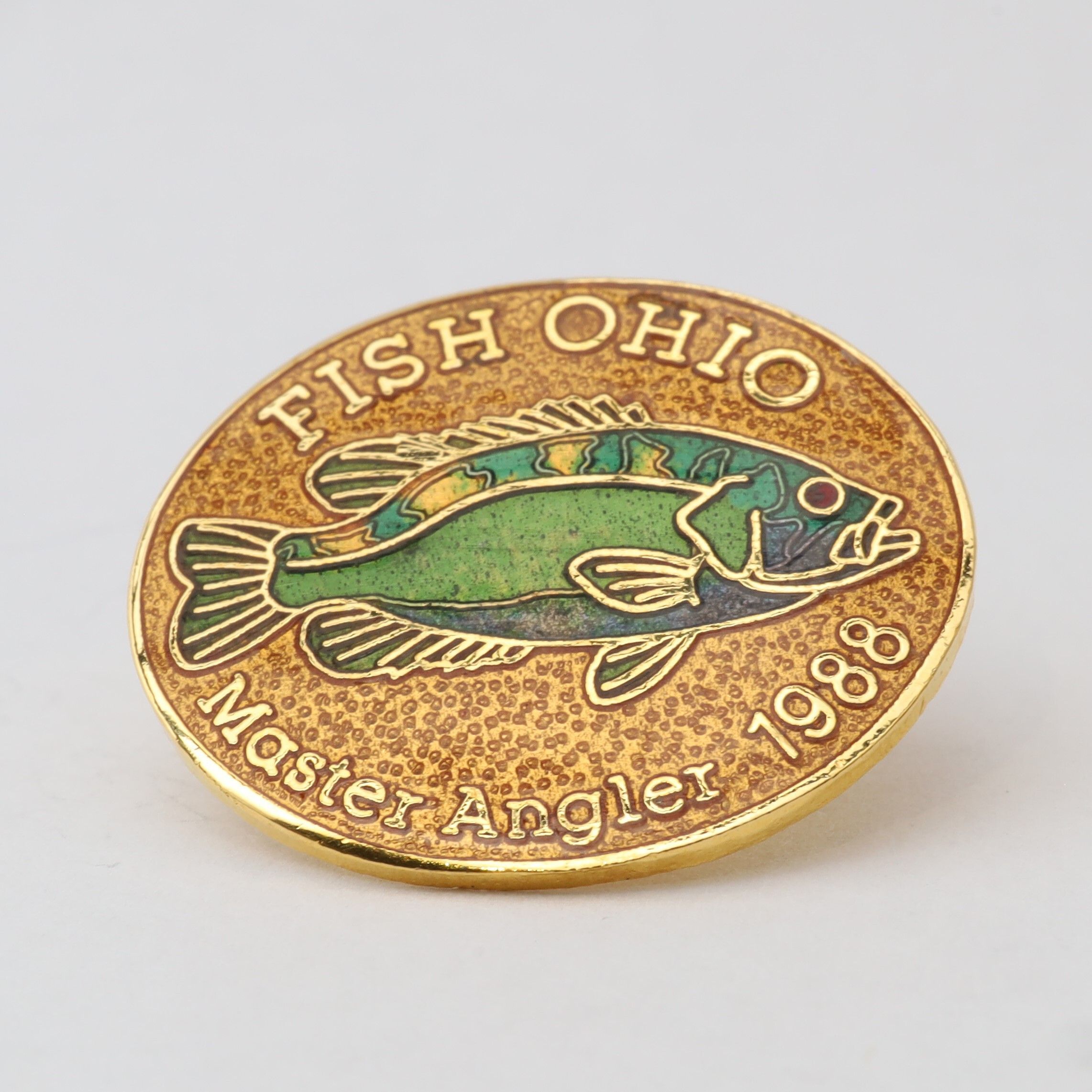 Prototype of the 1988 Master Angler pin featuring rock bass.Context