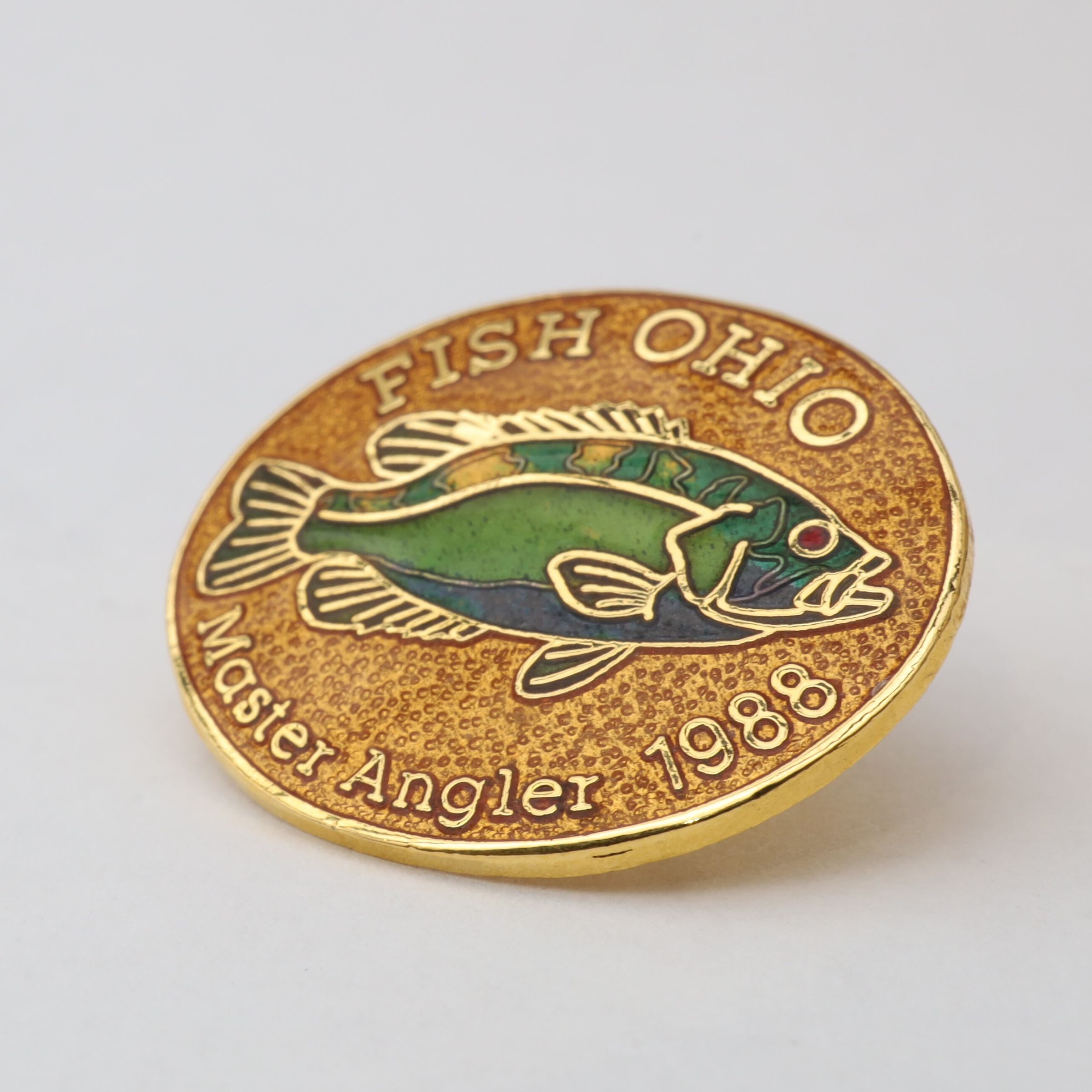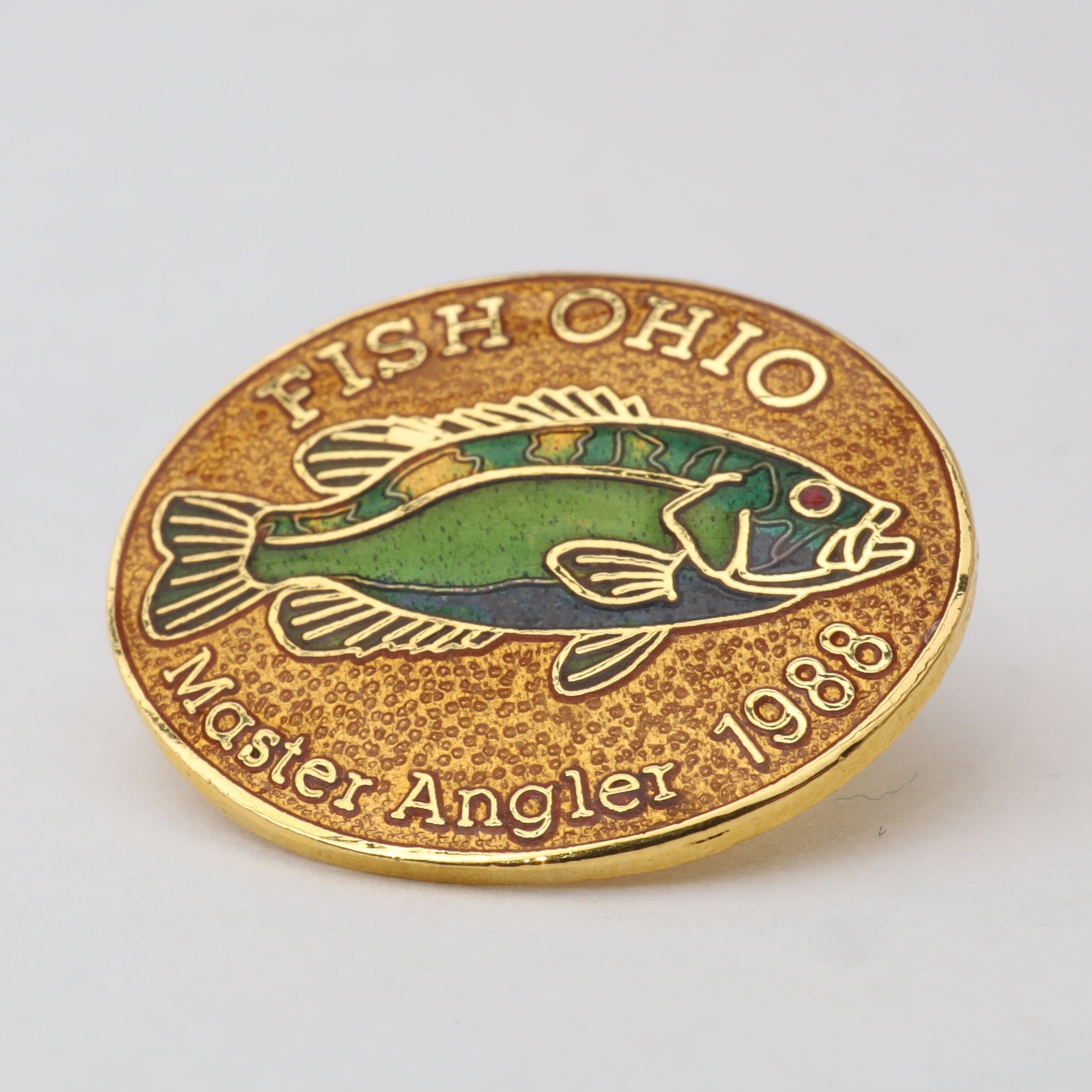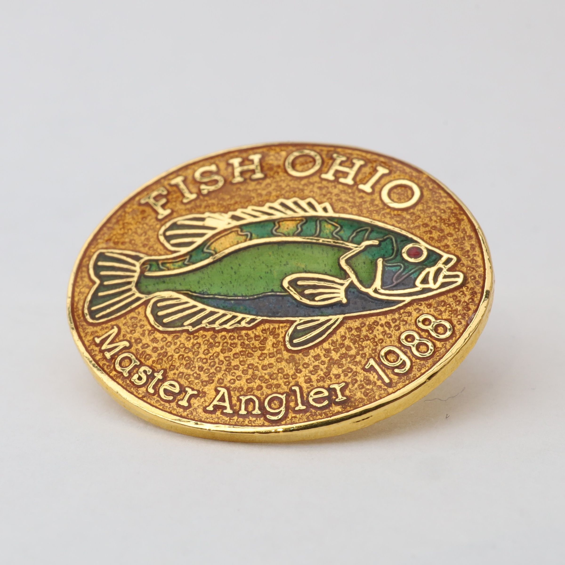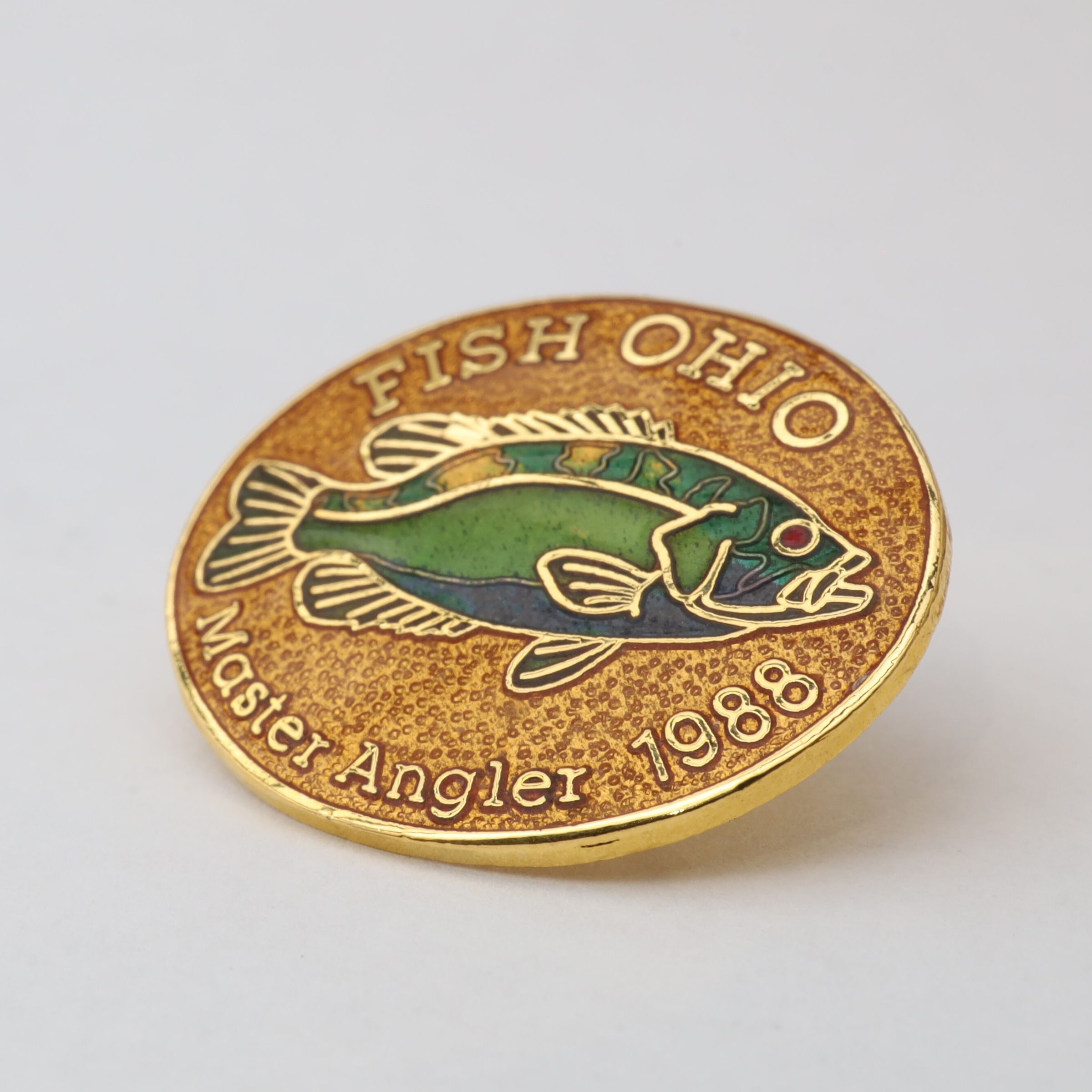 Prototype of the 1988 Master Angler pin featuring rock bass.Context