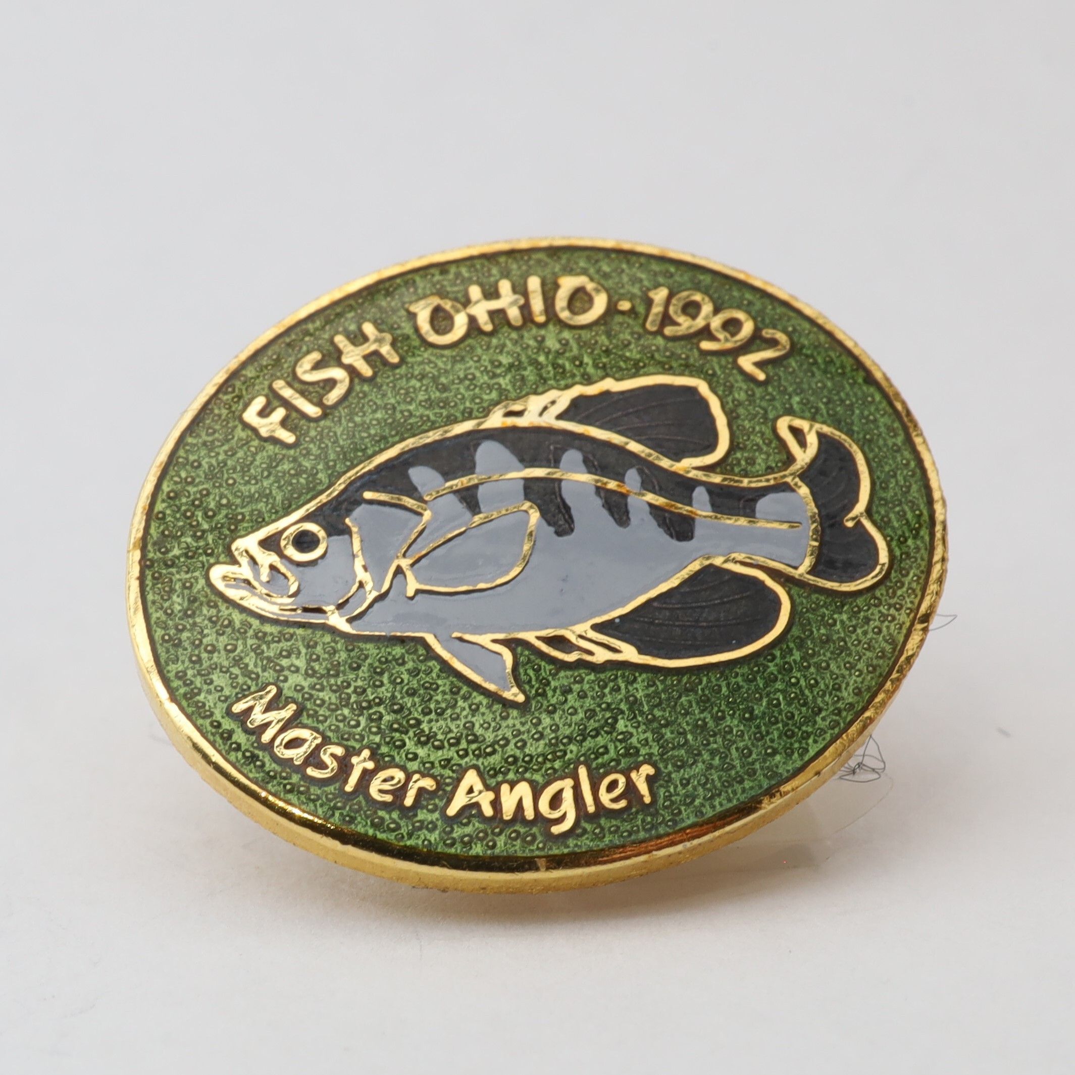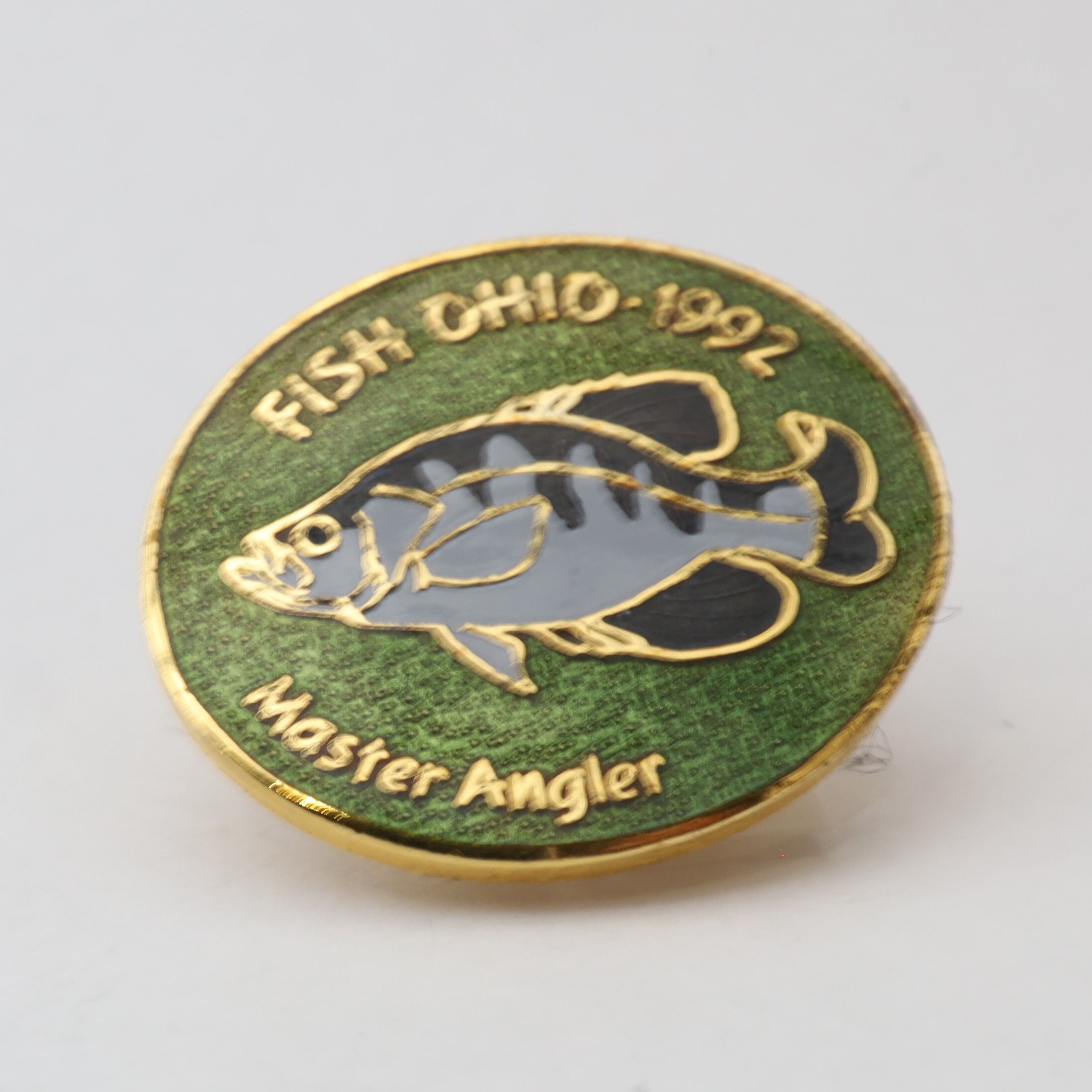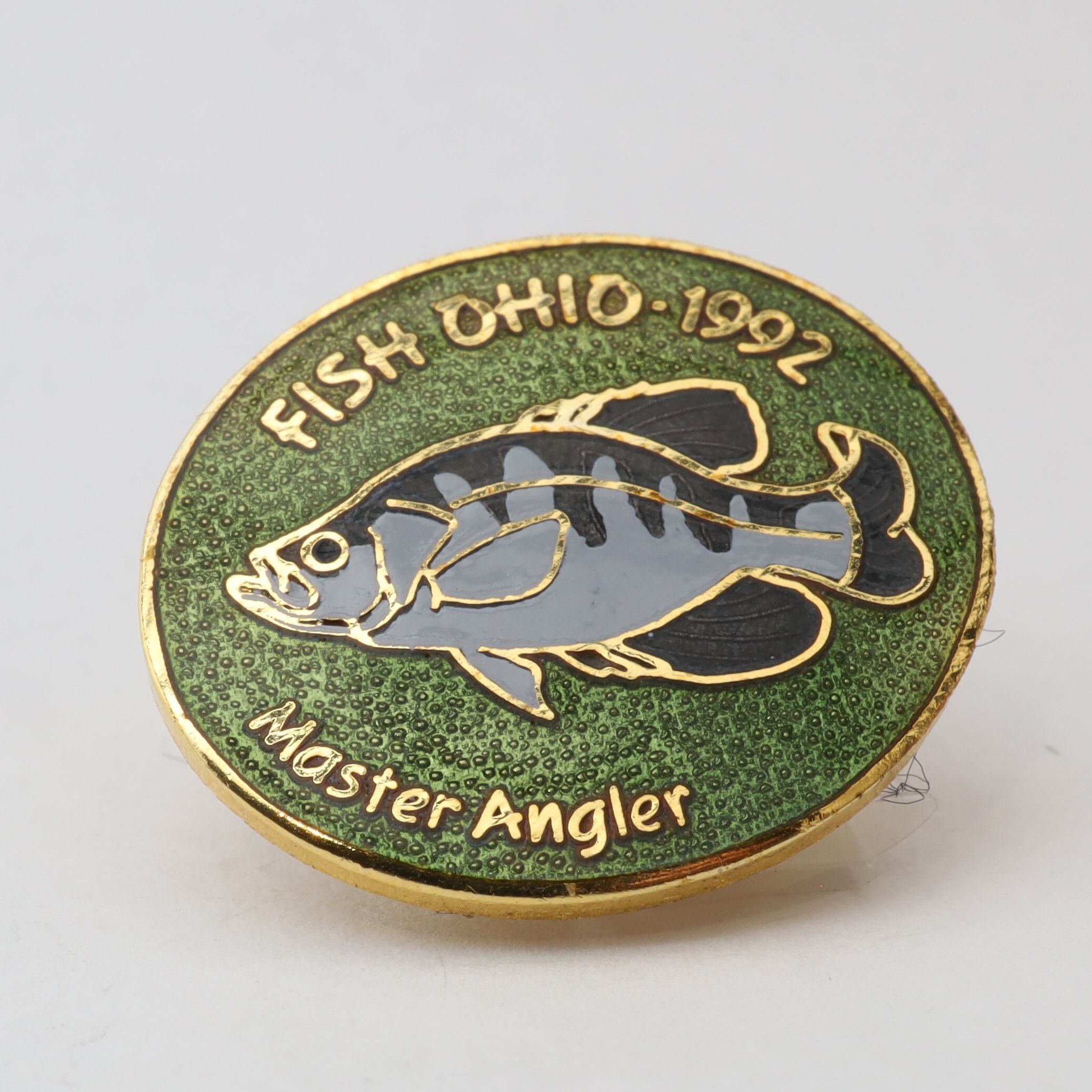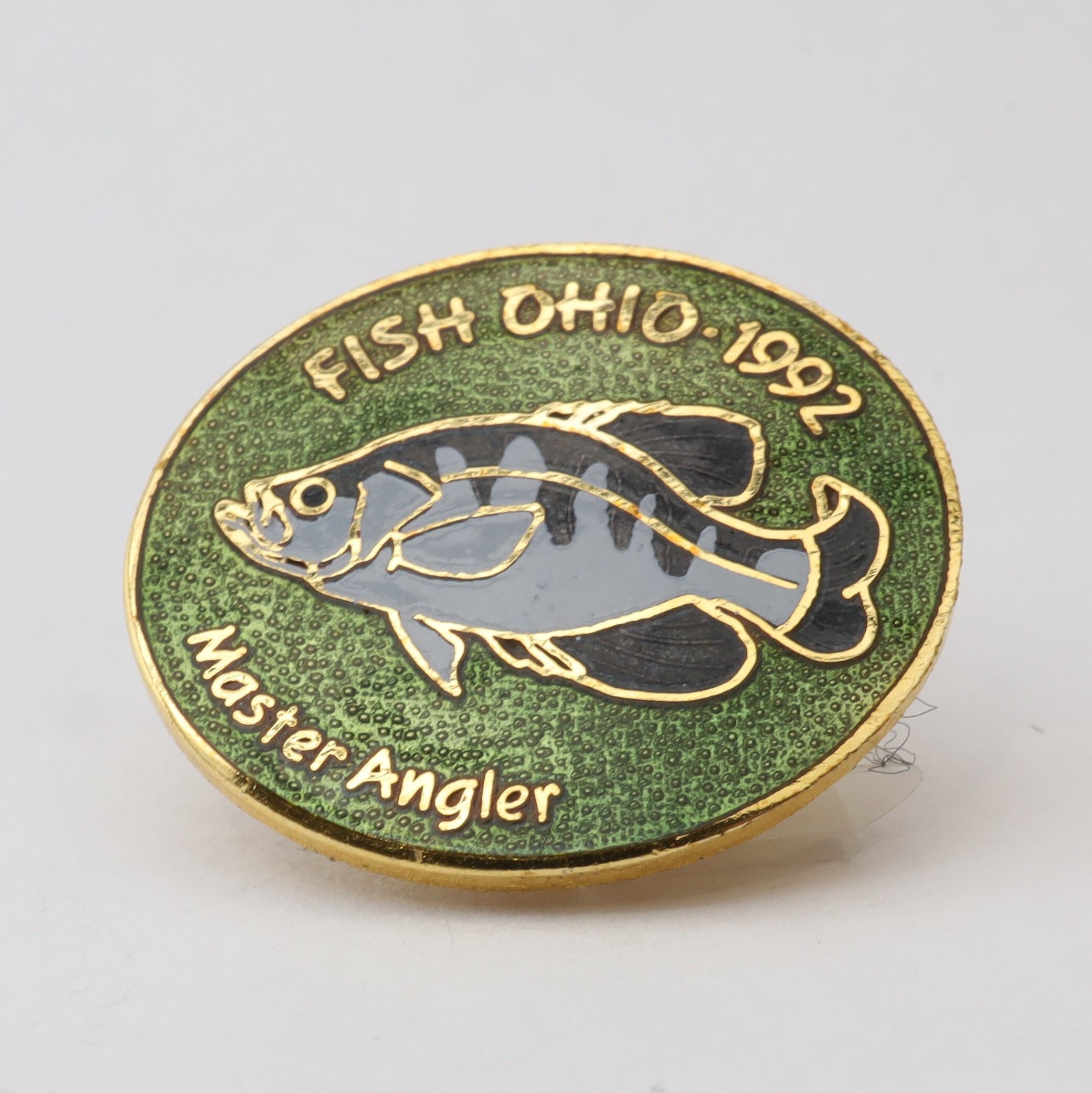 The 1992 Master Angler pin features the black crappie.The fish is on a textured green background with Fish Ohio and the date in gold separated by a dot along the top edge of the pin. The words Master Angler are in gold along the bottom edge. The fish itself is enameled in grey and black.Use
